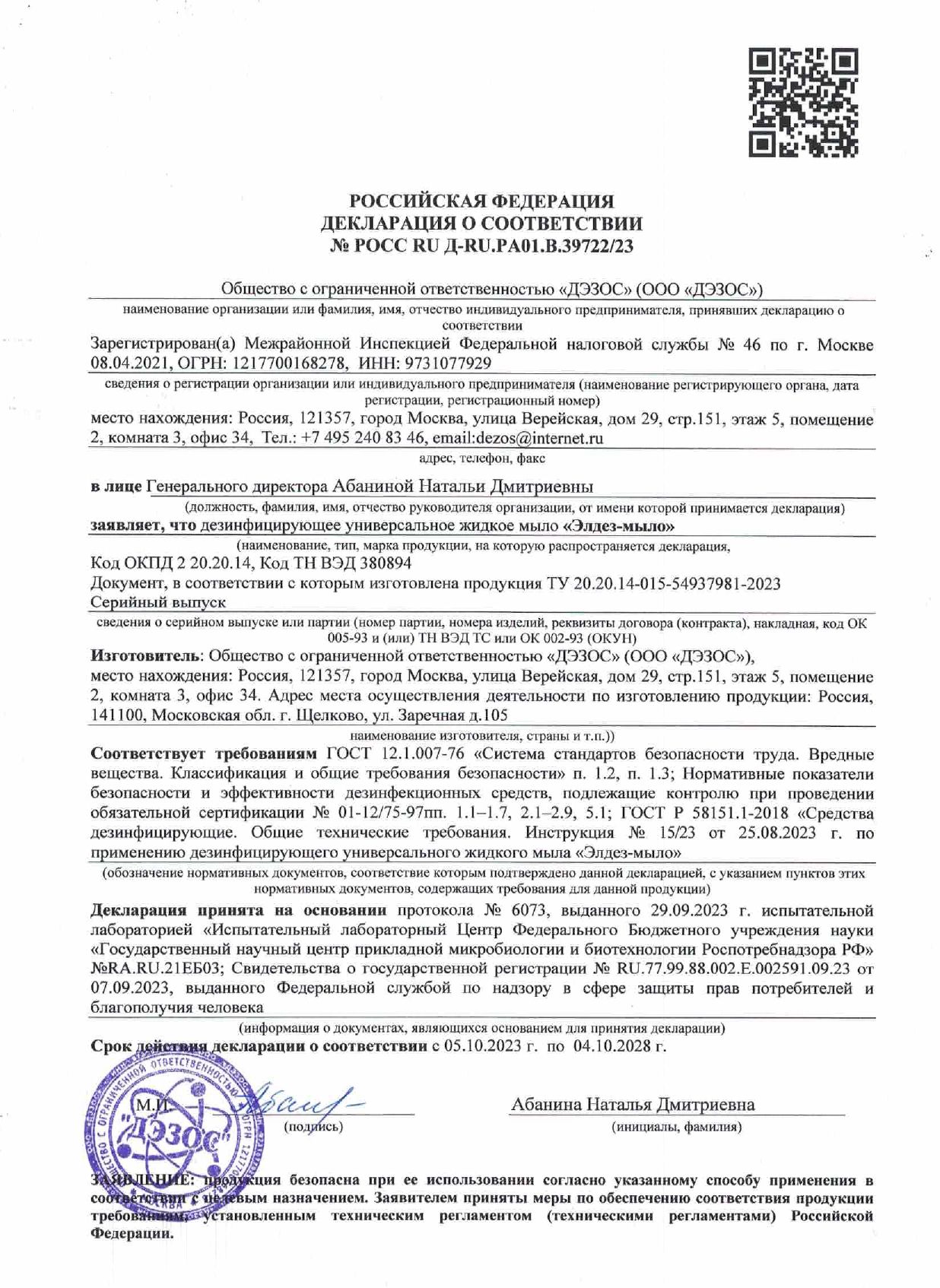 | Соответствует требованиям ГОСТа | ГОСТ 12.1.007-76 п.1.2, 1.3 |