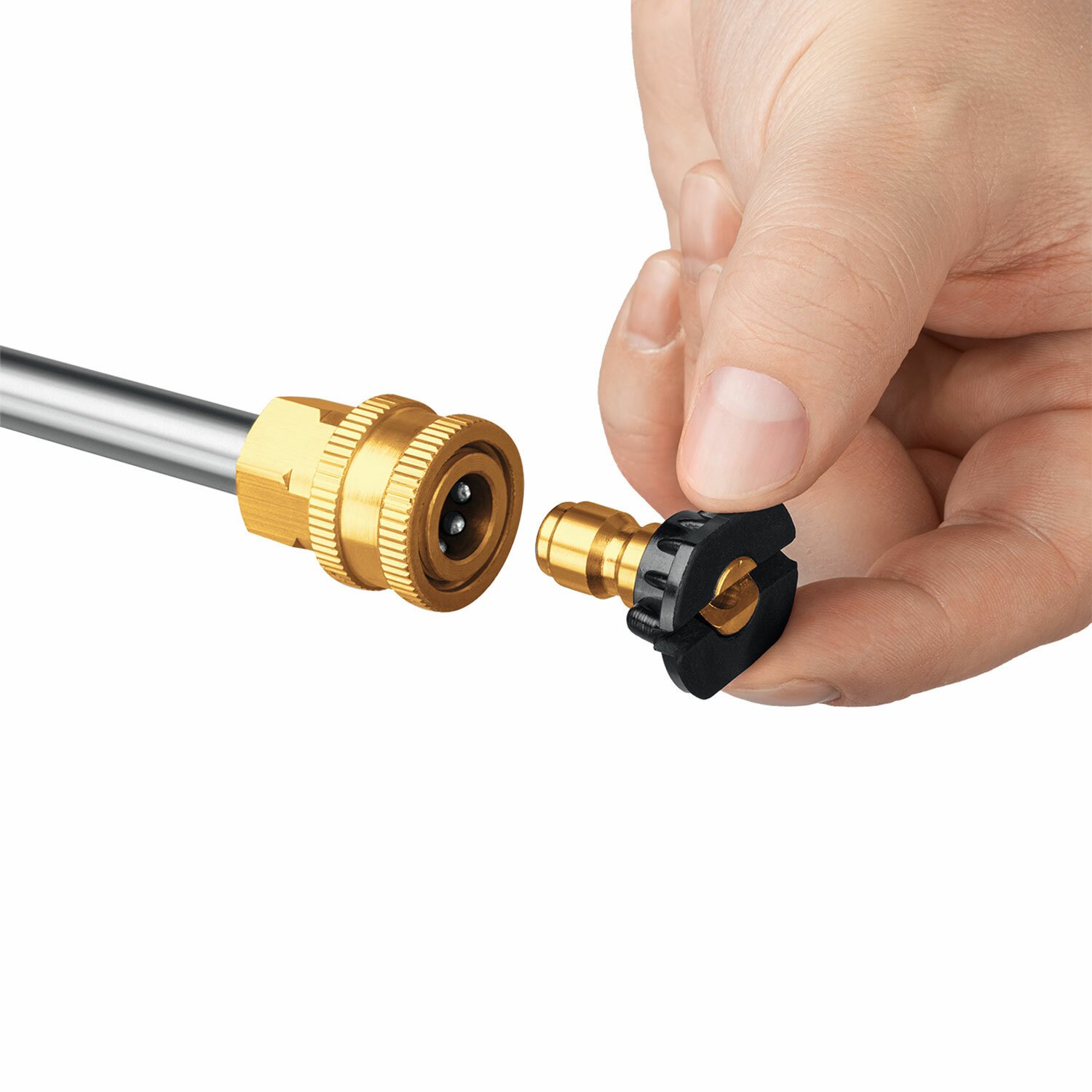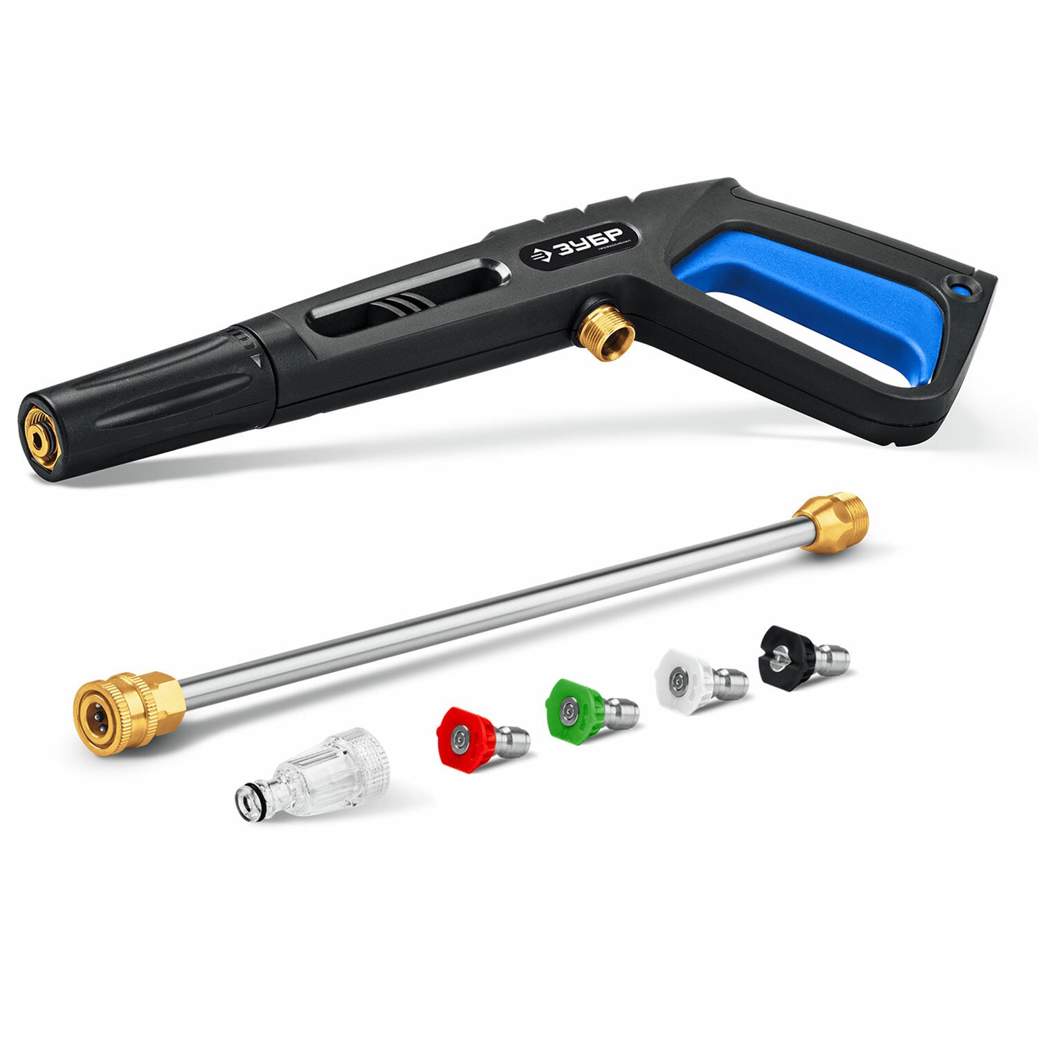 В комплекте идут сменные быстросъемные насадки с различными углами распыления для формирования струи различного давления, а также для нанесения моющего средства: