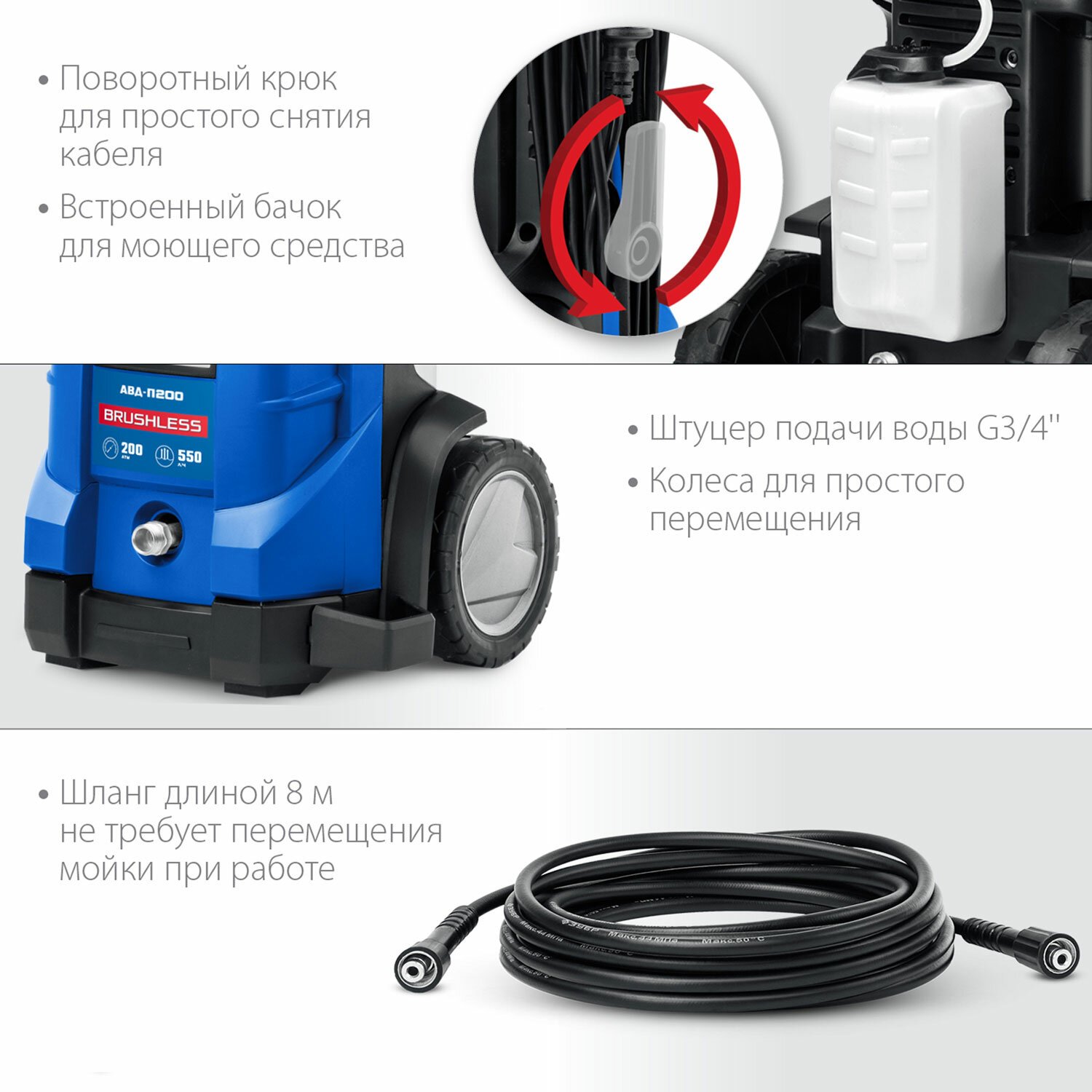 Шланг длиной 8 м позволяет производить обработку без необходимости перемещать мойку.
