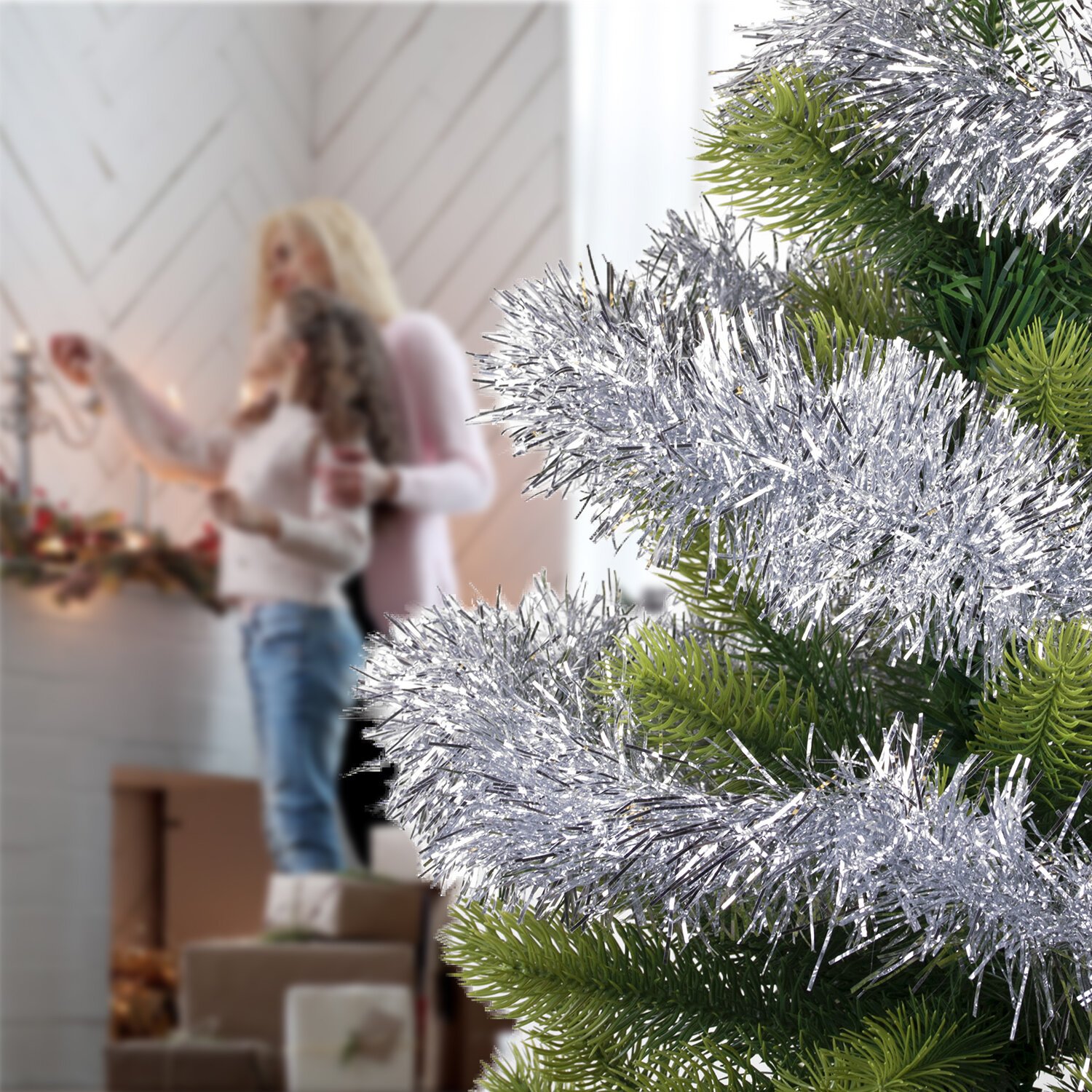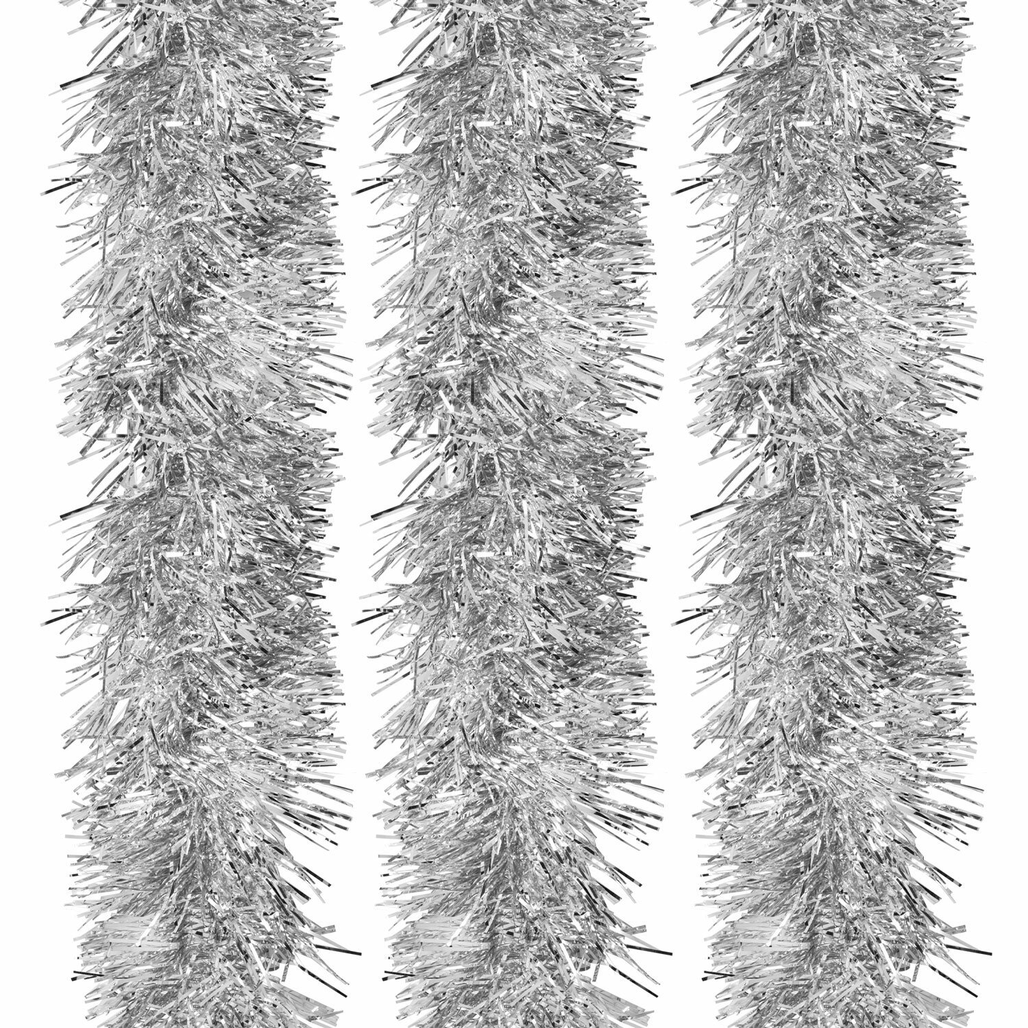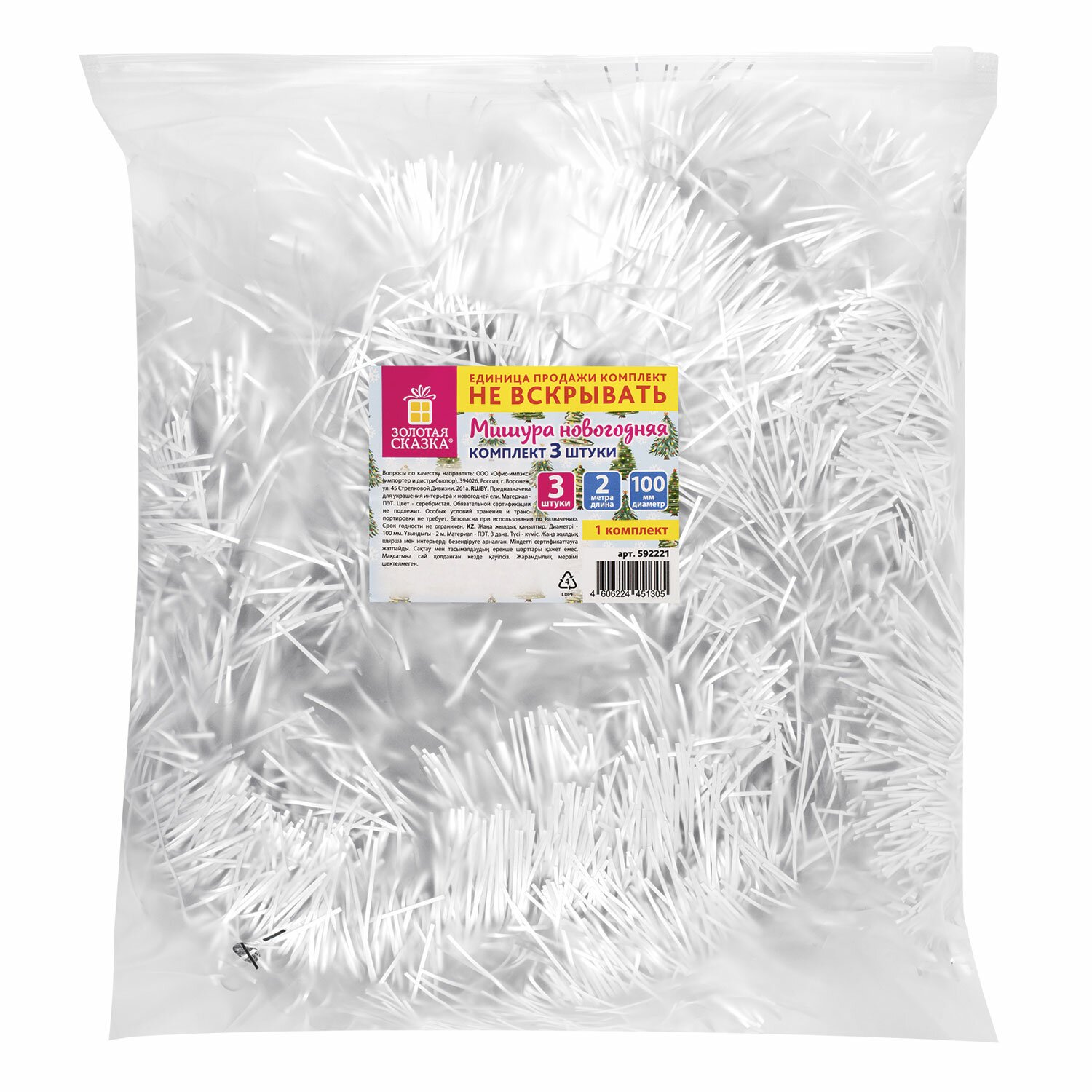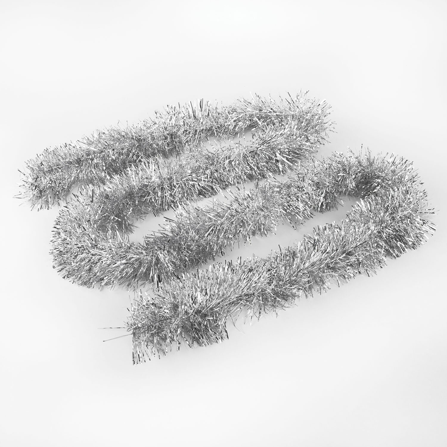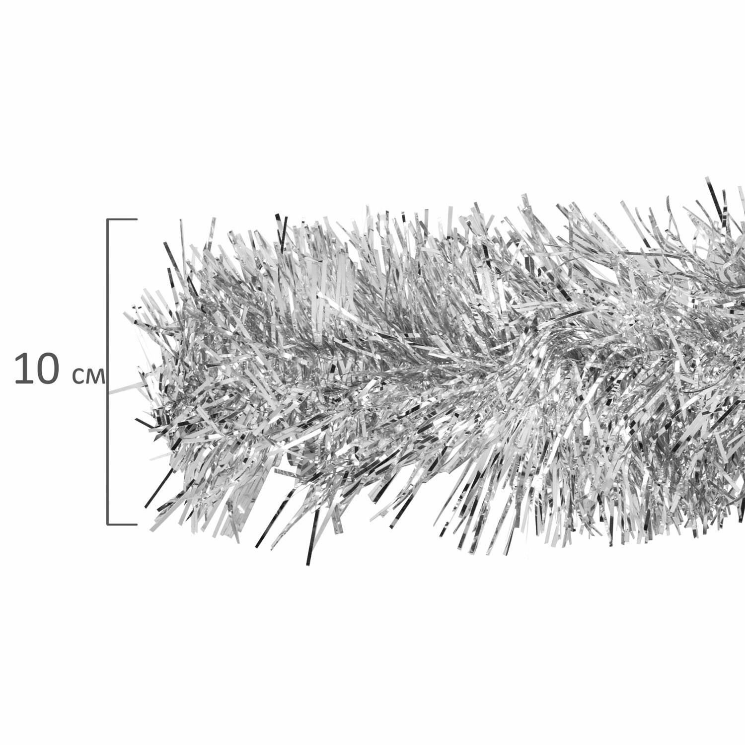 Длина мишуры в расправленном виде составляет 2 м, диаметр – 10 см. Материал мишуры – полиэтилентерефталат. В комплекте – 3 штуки мишуры серебристого цвета. Упакованы в пакет с зиплоком.