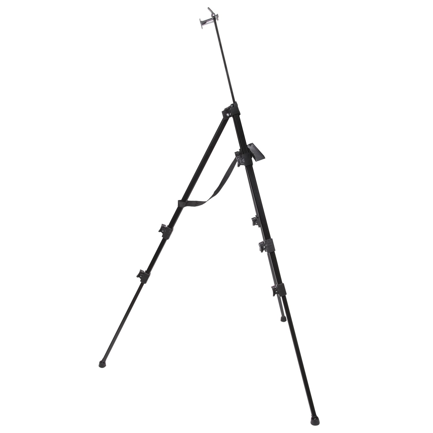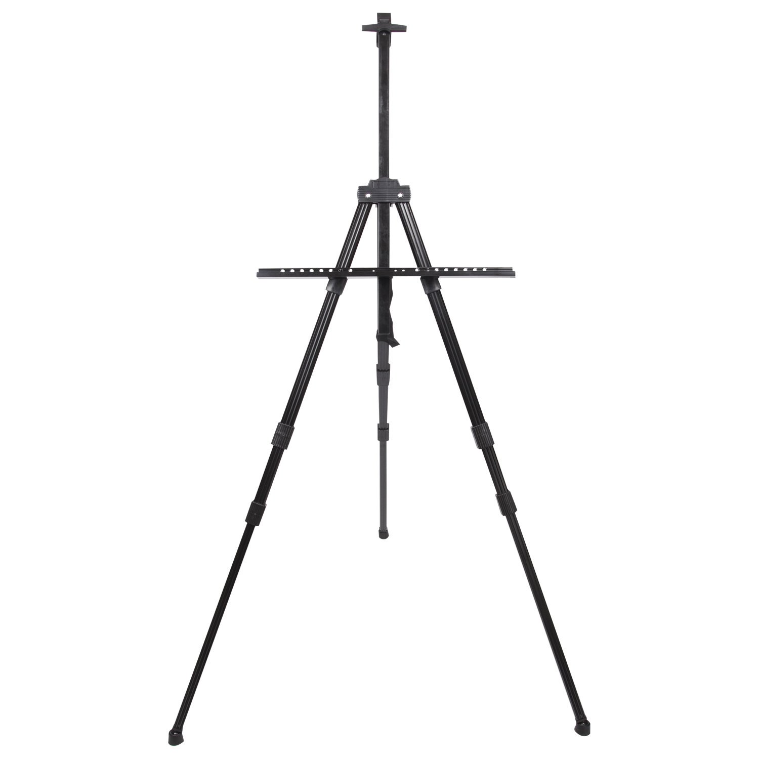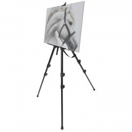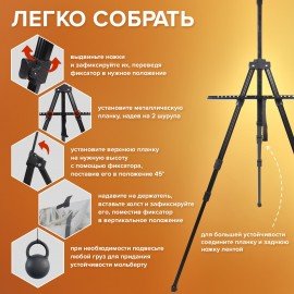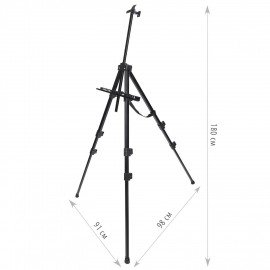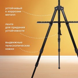 Оснащен держателем для кистей и специальной лентой, на которую можно подвесить груз для придания устойчивости. Выдвижные ножки оснащены зажимами-клипсами, как у современных фотоштативов, благодаря чему установка мольберта производится очень быстро. Выполнен из высококачественного алюминия черного цвета – устойчивого к коррозии металла, который обеспечивает легкость и прочность изделия. Максимальная высота размещаемого холста – 95 см.