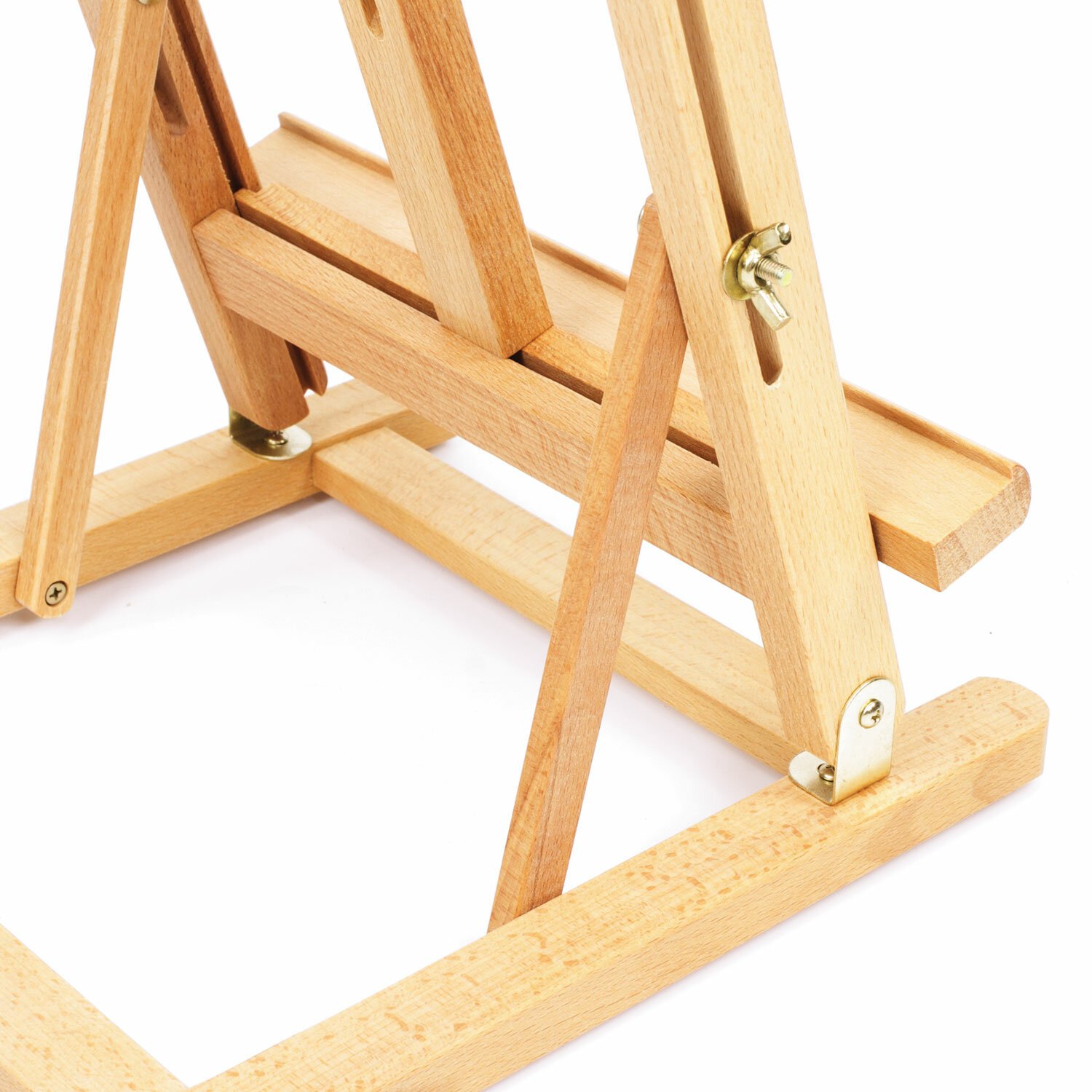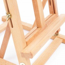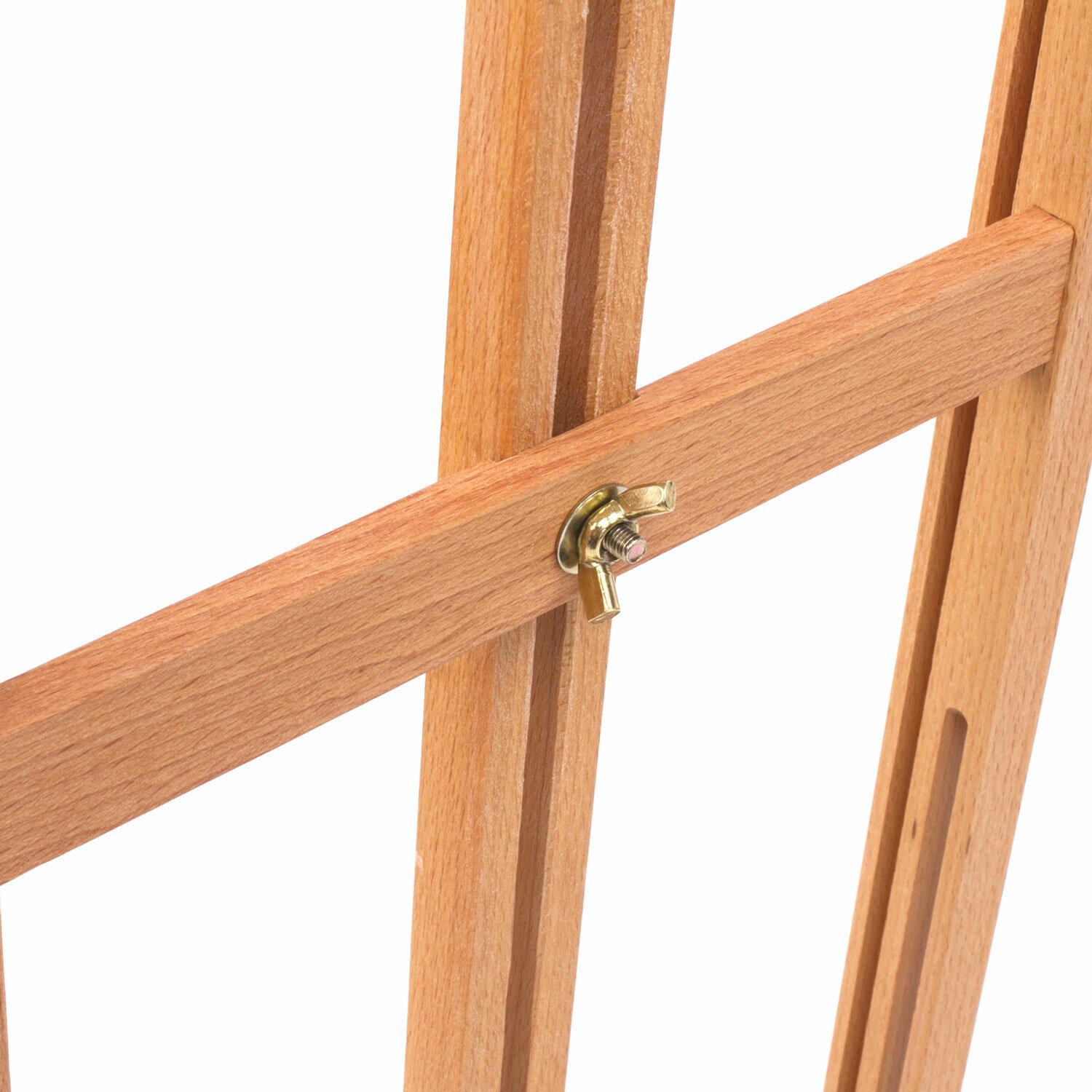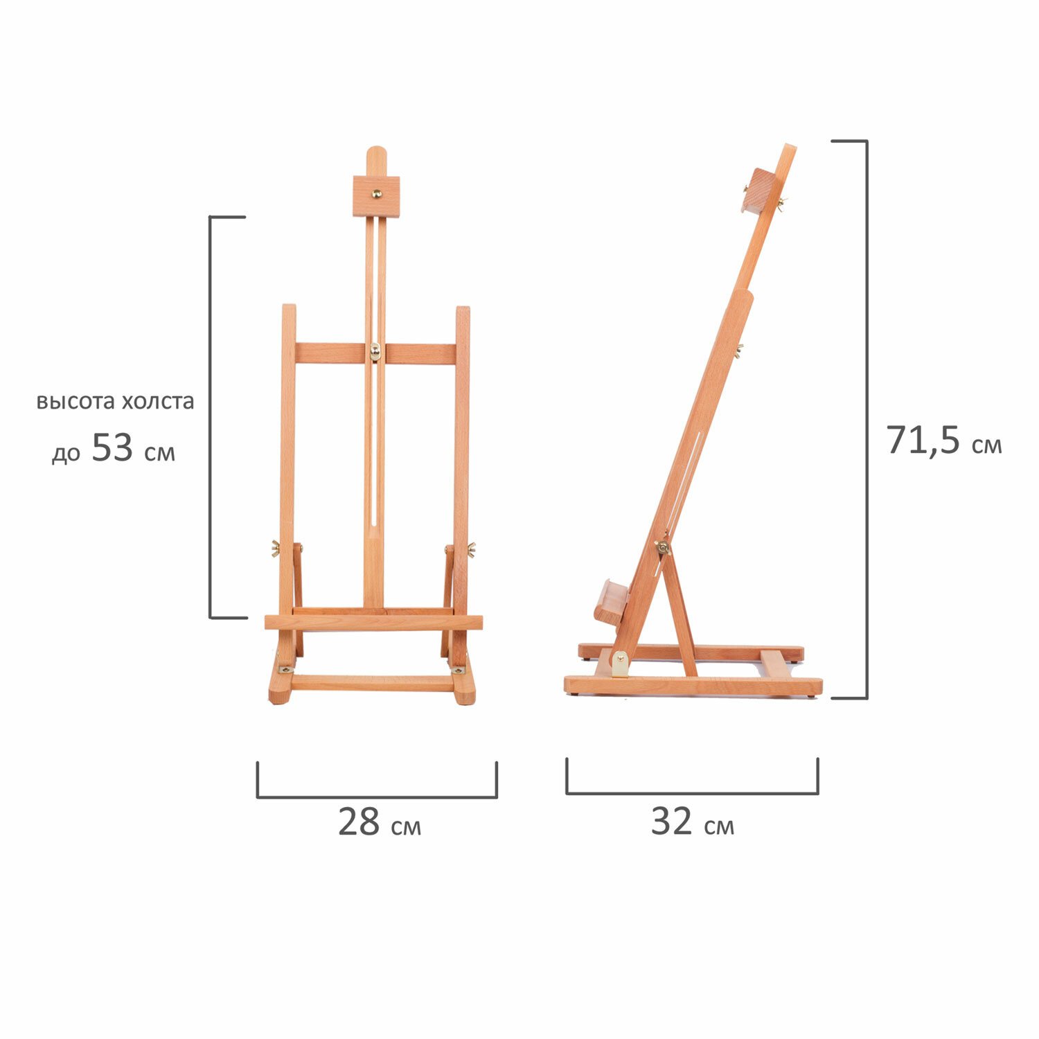 Изготовлен из натурального бука, пропитанного маслом. Мольберт настольный прост в установке, верхнее крепление обеспечивает жесткую фиксацию холста. Максимальная высота размещаемого холста – 53 см. Мачта неподвижная, свободный угол наклона позволяет зафиксировать положение мачты с помощью винта-барашка.