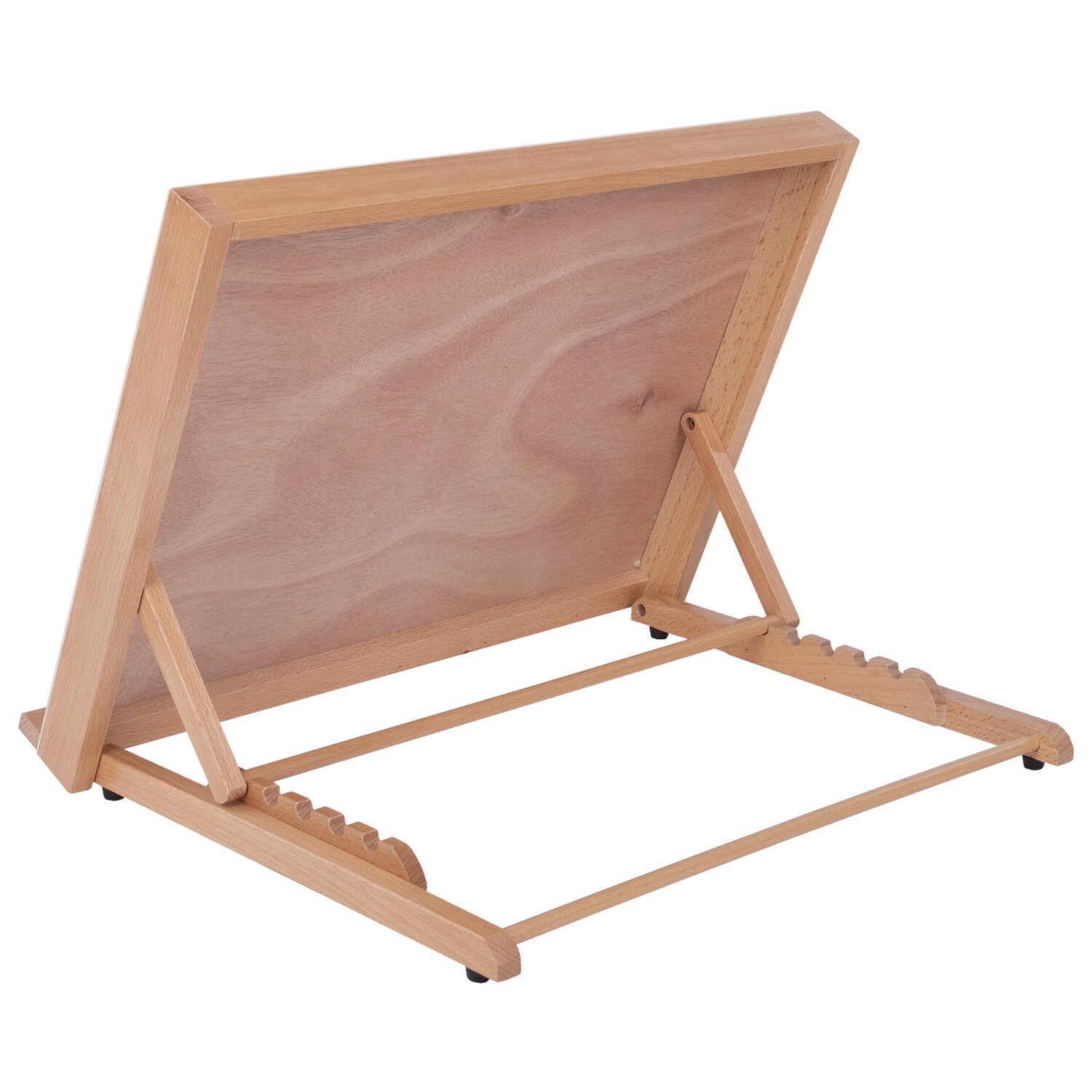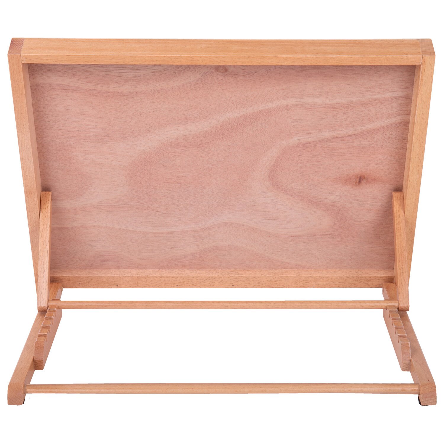 Настольный планшетный мольберт изготовлен из натурального бука, пропитанного маслом. Мольберт с регулируемым углом наклона отлично подходит для работы с малыми и средними форматами, максимальный размер бумаги - А3. Планшет мольберта представляет собой жесткую основу, за счет этого на мольберте легко можно закрепить бумагу малярным скотчем или зажимами. Поверхность планшета хорошо отшлифована и подходит даже для тонкой бумаги. 5 вариантов наклона мольберта помогут найти удобное положение для творчества. Мольберт удобно хранить в сложенном виде.