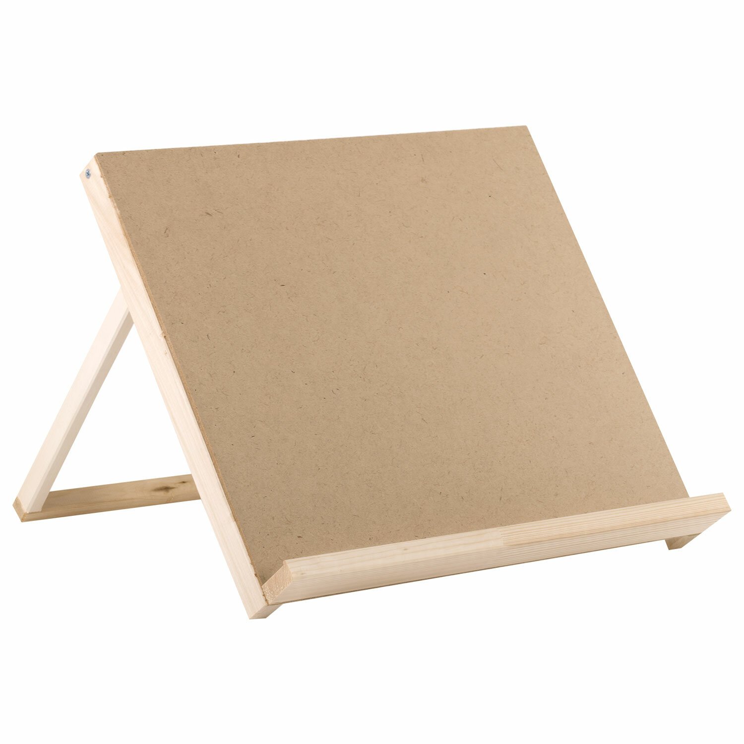 Настольный планшетный мольберт изготовлен из липы. Мольберт отлично подходит для работы с малыми и средними форматами, максимальный размер бумаги - А3. Планшет мольберта представляет собой жесткую основу, за счет этого на мольберте легко можно закрепить бумагу малярным скотчем или зажимами. Поверхность планшета хорошо отшлифована и подходит даже для тонкой бумаги. Наклон мольберта фиксируется в одном положении с помощью верёвки. Мольберт удобно хранить в сложенном виде. Высота холста - до 40 см. Размер в разложенном виде - 38х45х36см. Вес - 1,35 кг.