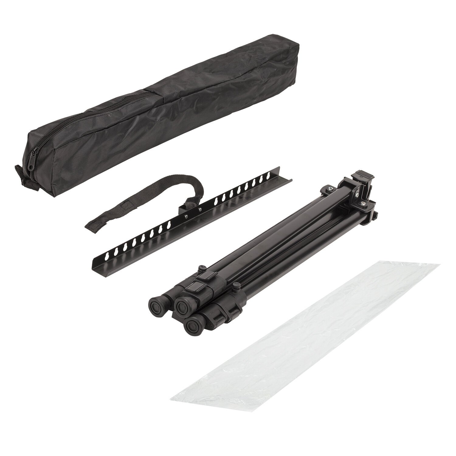 Поставляется в комплекте с черным чехлом на молнии и ремешком, обеспечивающим удобство транспортировки при выездных работах. Легко складывается, удобен для переноски. Максимальный размер в рабочем состоянии – 117х166х94 см. Минимальный размер в рабочем состоянии – 40x51x37 см. Вес – 1,14 кг. Упакован в пакет и белую коробку.