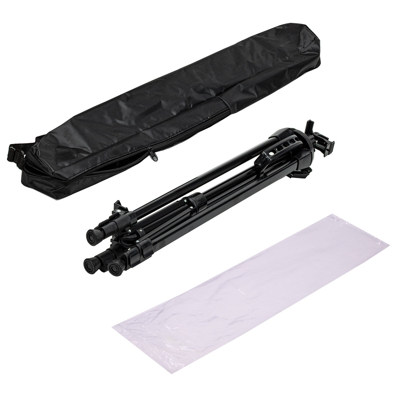 Поставляется в комплекте с черным чехлом на молнии и ремешком, обеспечивающим удобство транспортировки при выездных работах. Легко складывается, удобен для переноски. Максимальный размер в рабочем состоянии - 93х184х83 см. Минимальный размер в рабочем состоянии - 36x67x36 см. Вес - 1,60 кг. Упакован в пакет и белую коробку.
