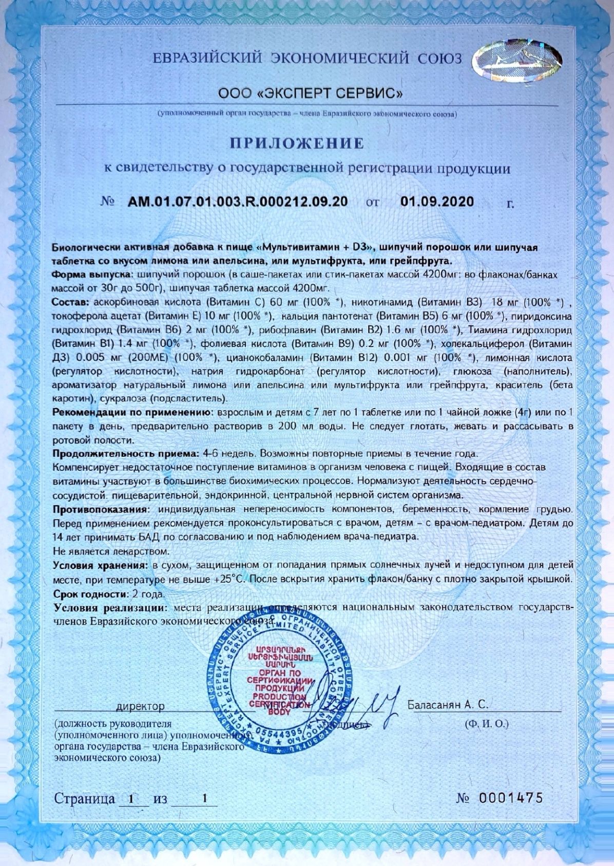Состав: лимонная кислота (регулятор кислотности), натрия гидрокарбонат (регулятор кислотности), глюкоза (наполнитель), аскорбиновая кислота, ароматизатор натуральный апельсина, краситель (бета каротин), сукралоза (подсластитель), никотинамид, токоферола ацетат, кальция пантотенат, пиридоксина гидрохлорид, рибофлавин, тиамина гидрохлорид, фолиевая кислота, холекальциферол, цианокобаламин.