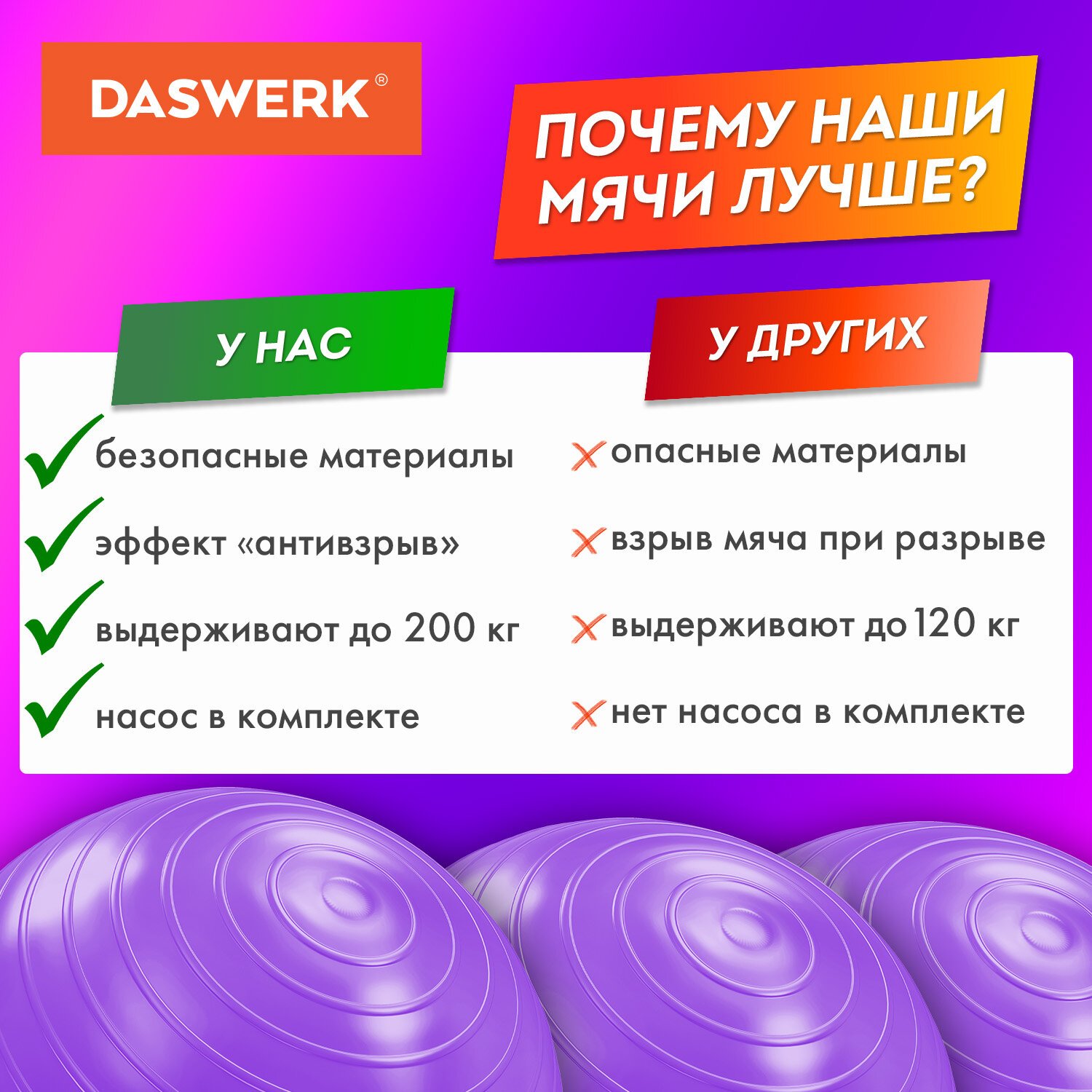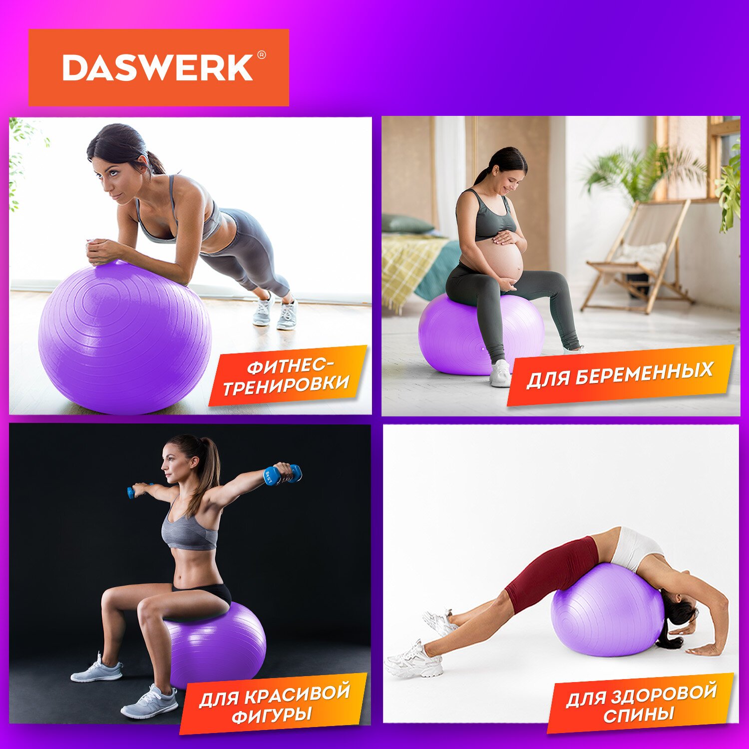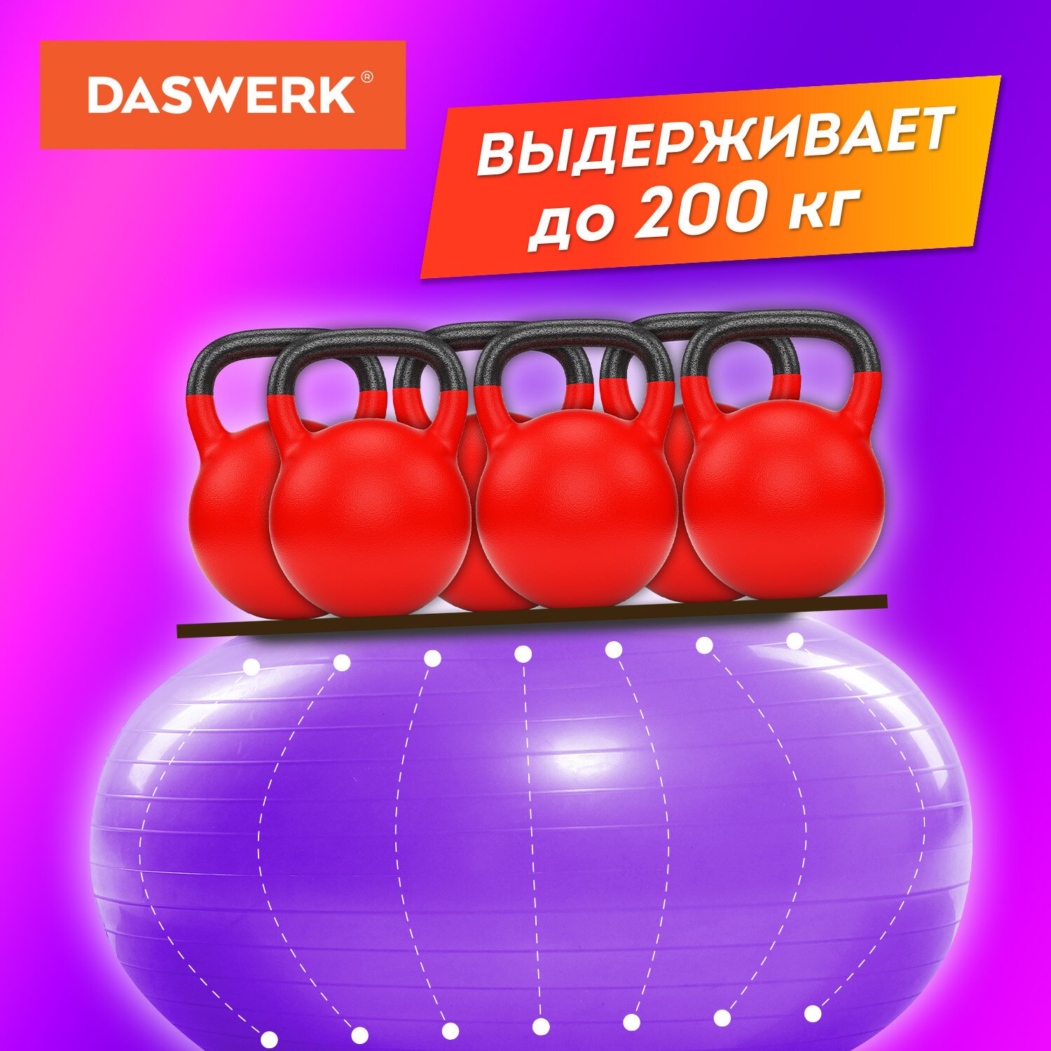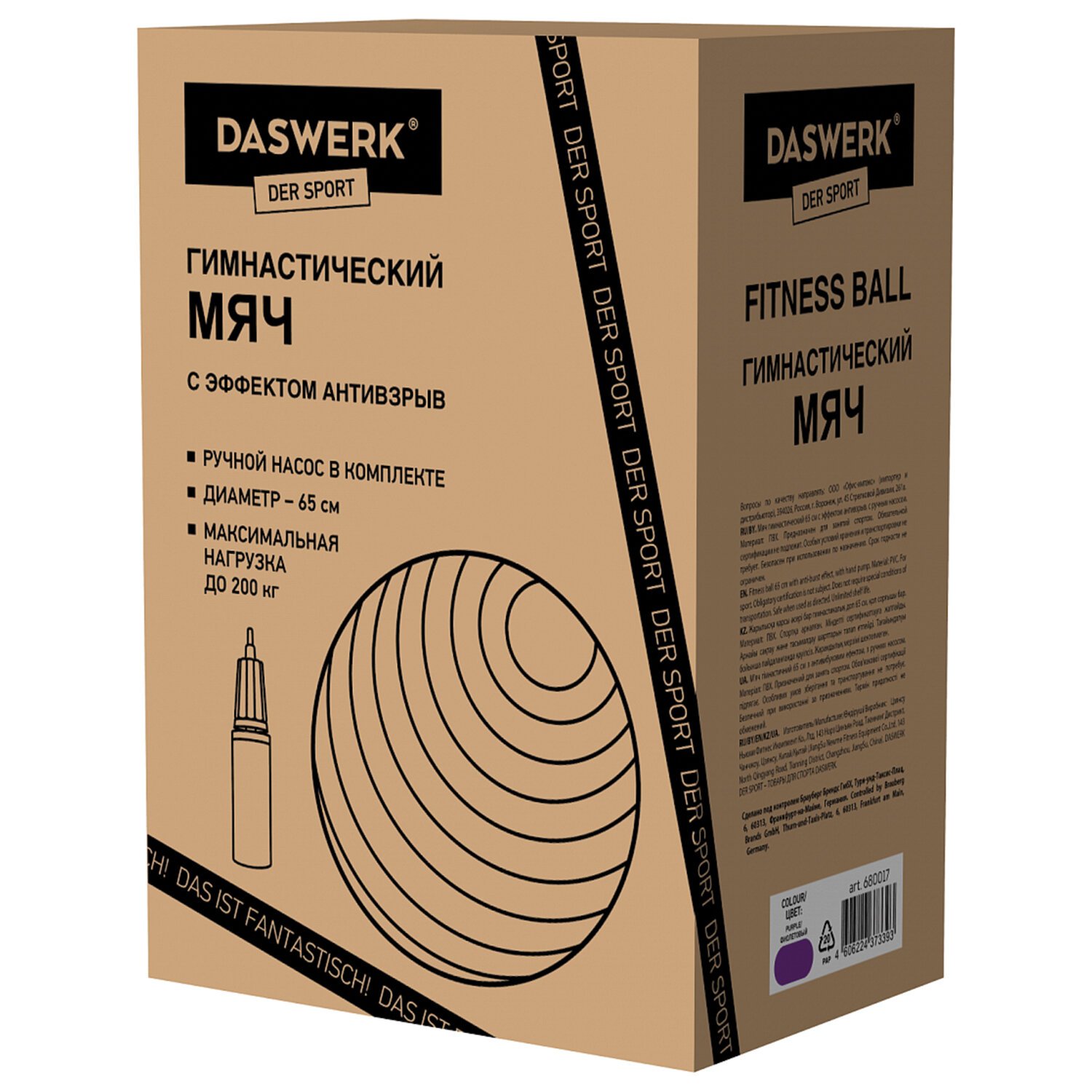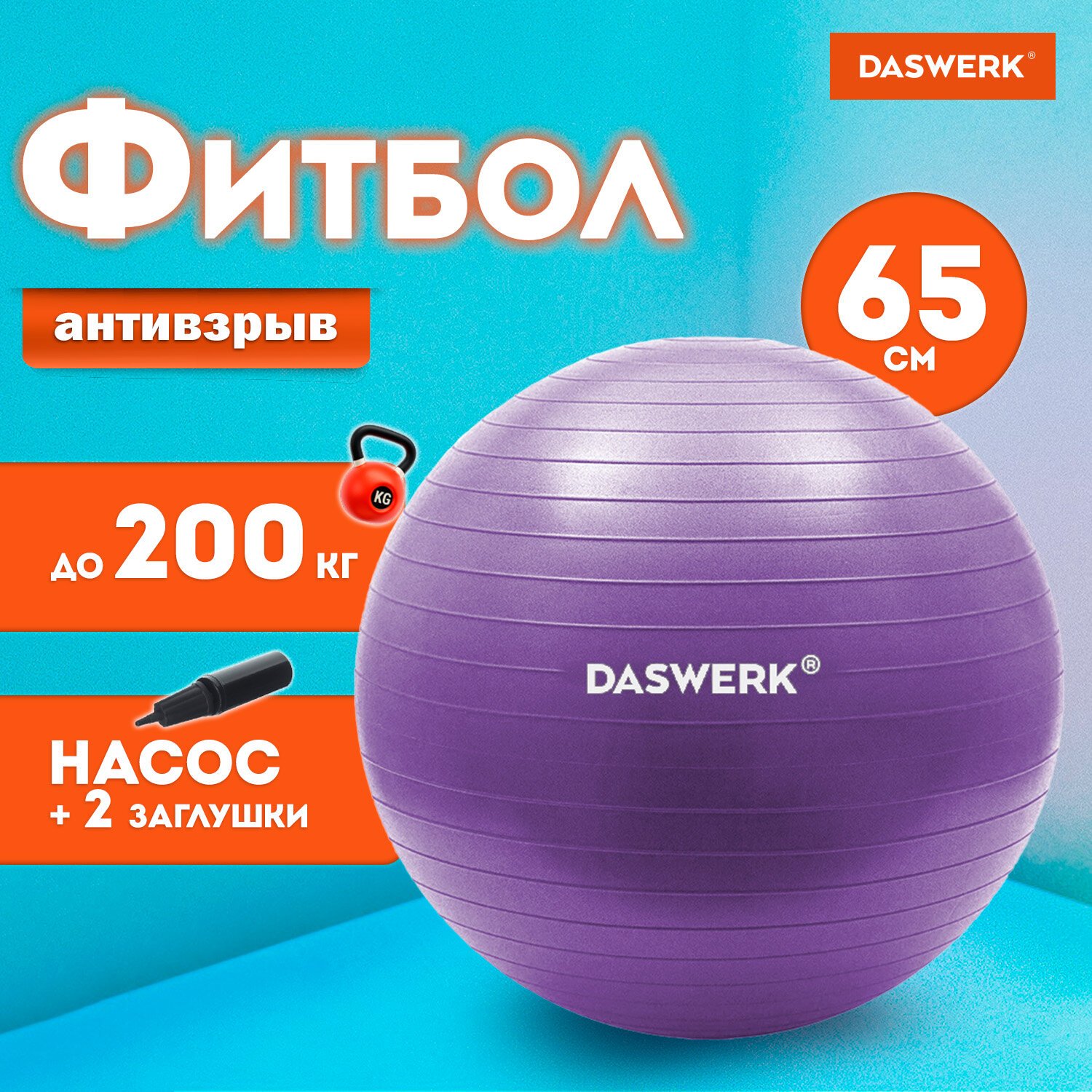 Мяч гимнастический (фитбол) 65 см с эффектом "антивзрыв", с ручным насосом, фиолетовый, DASWERK, 680017