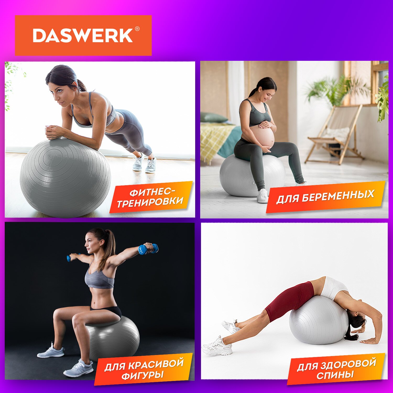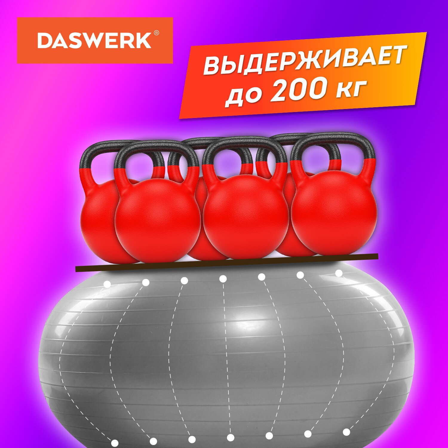 Мяч гимнастический (фитбол) 65 см с эффектом "антивзрыв", с ручным насосом, фиолетовый, DASWERK, 680017