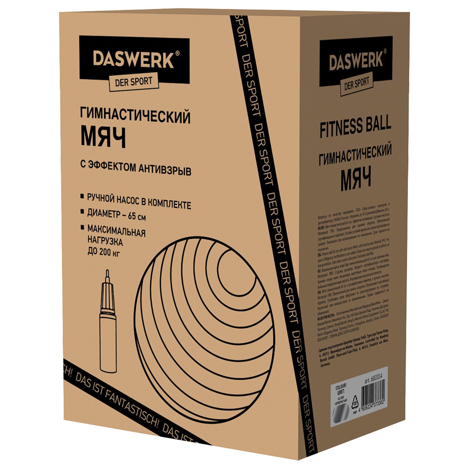 Мяч гимнастический (фитбол) 65 см с эффектом "антивзрыв", с ручным насосом, серебристый, DASWERK, 680014