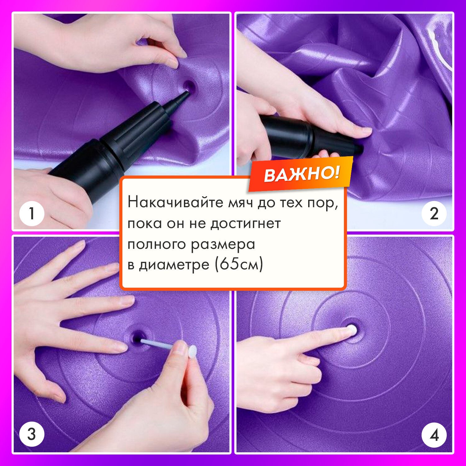 В комплекте специальный ручной насос для быстрого и удобного надувания мяча и 2 заглушки.