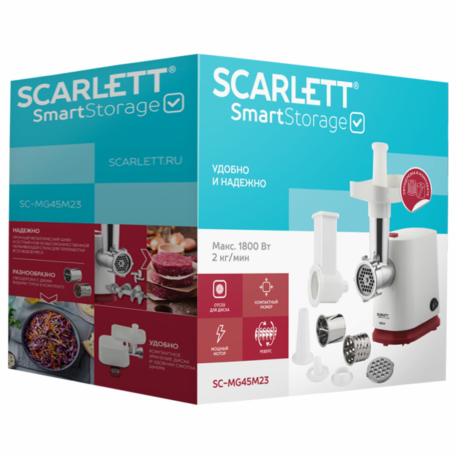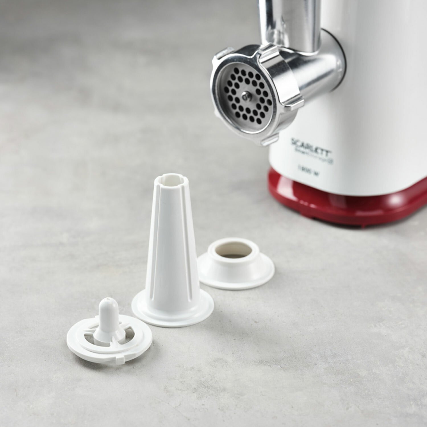 Мясорубка SCARLETT SC-MG45M20, 1800 Вт, производительность 2 кг/мин, 4 насадки, реверс, пластик, белая