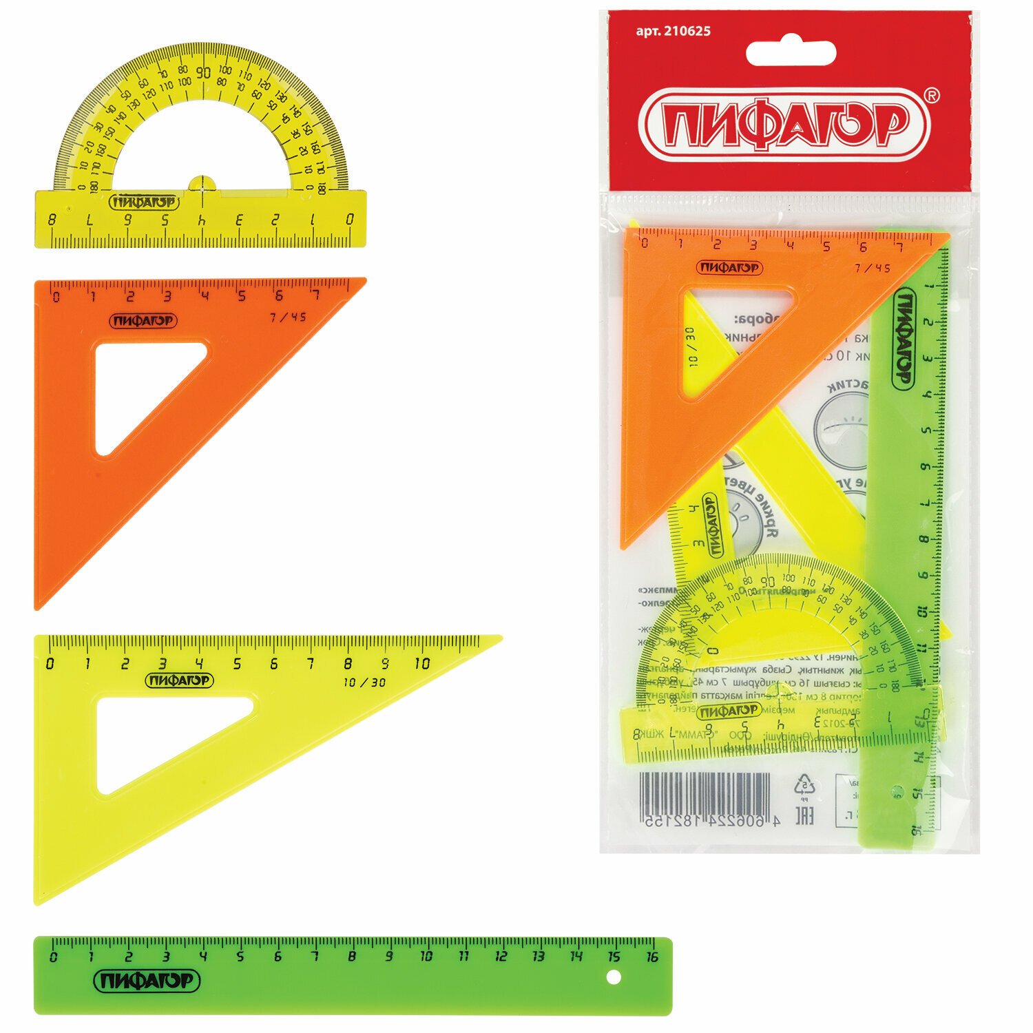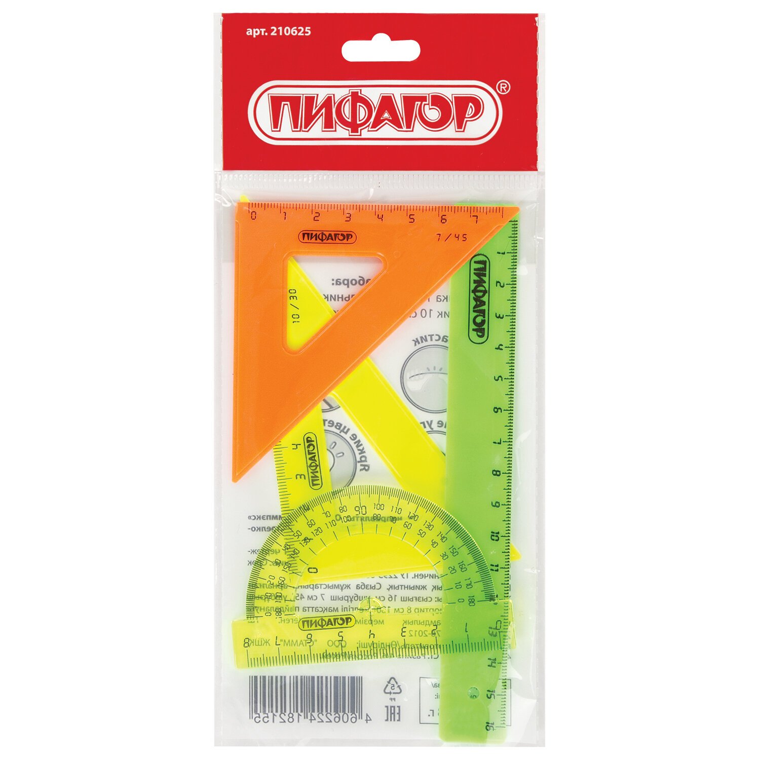 Набор чертежный ПИФАГОР (линейка 16 см, 2 треугольника, транспортир), неоновый, прозрачный, ассорти, 210851