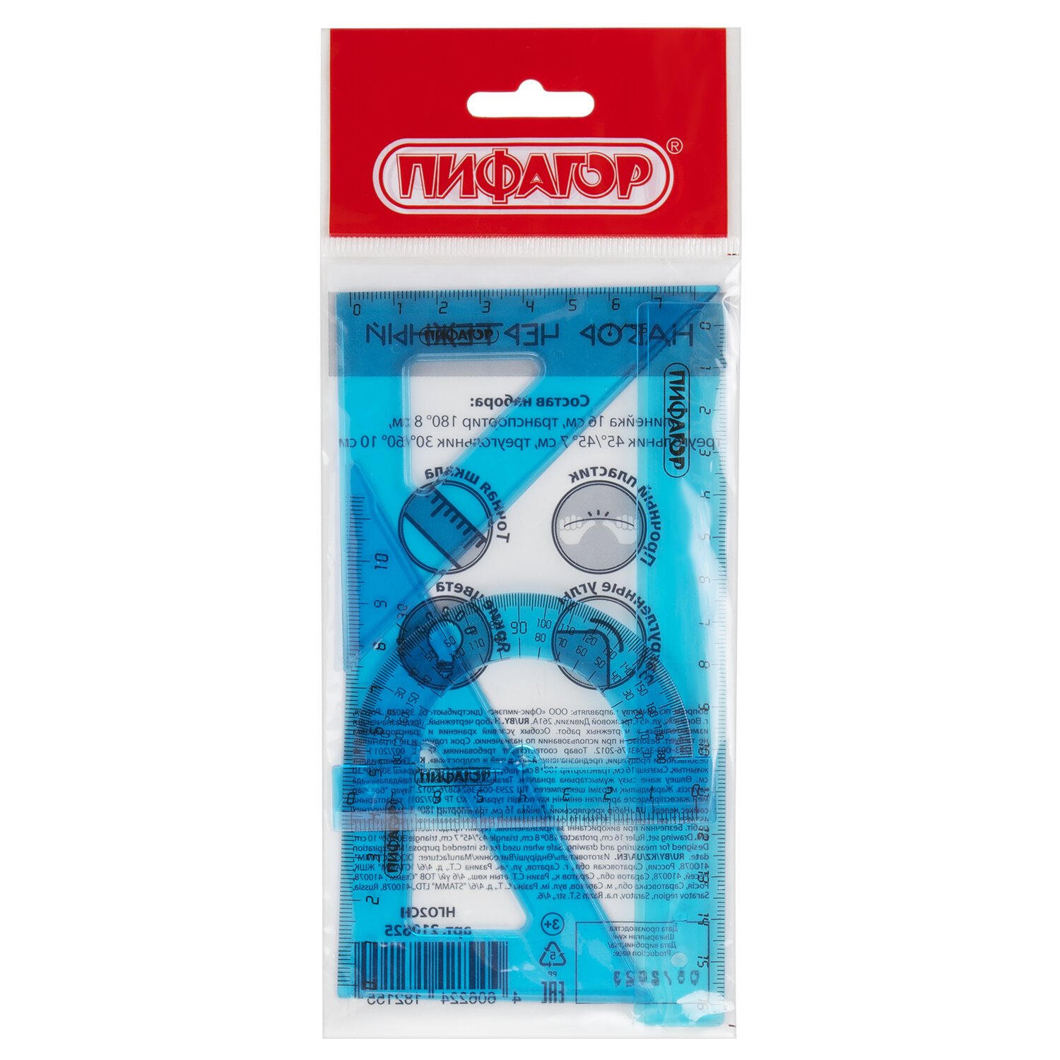Набор чертежный ПИФАГОР (линейка 16 см, 2 треугольника, транспортир), прозрачный, европодвес, 210850