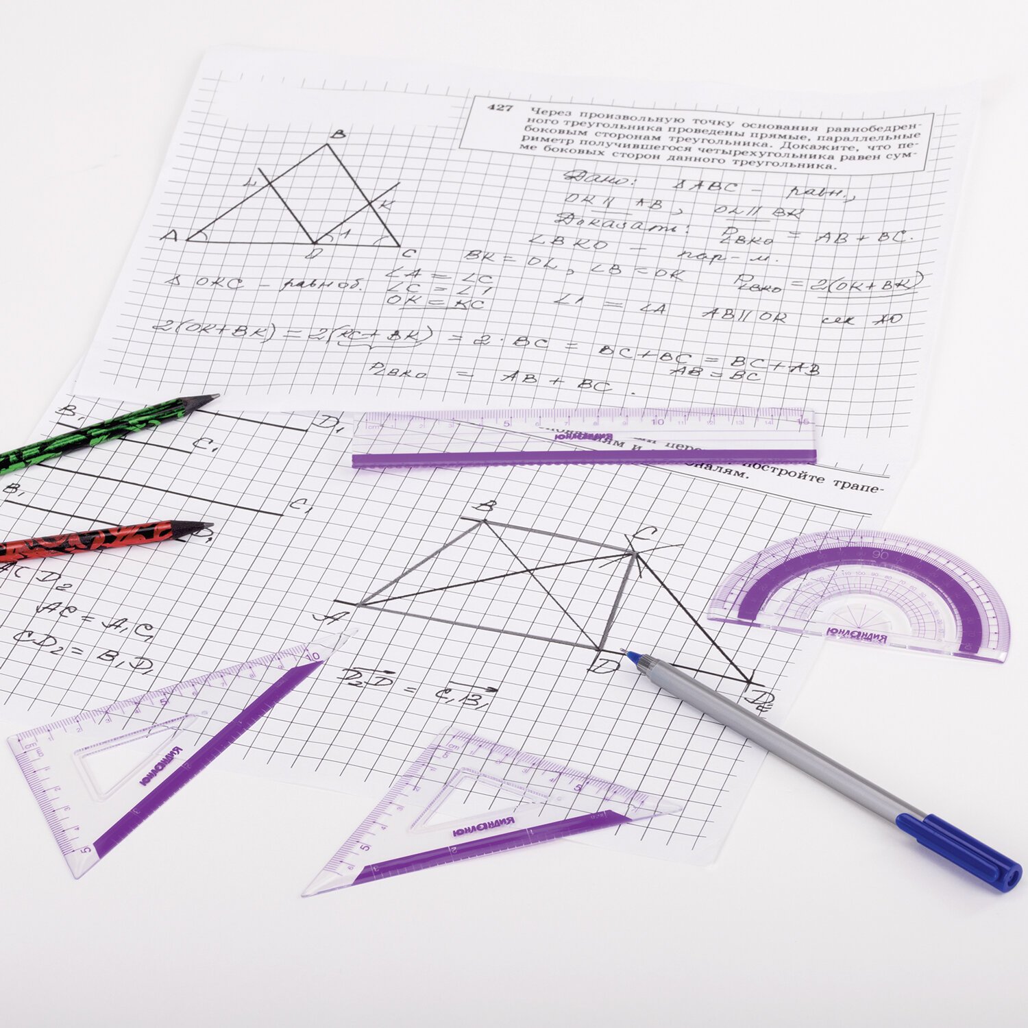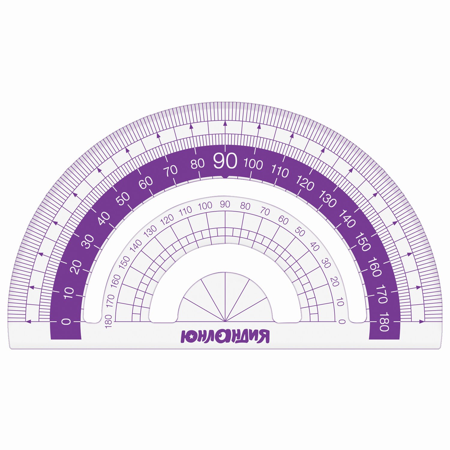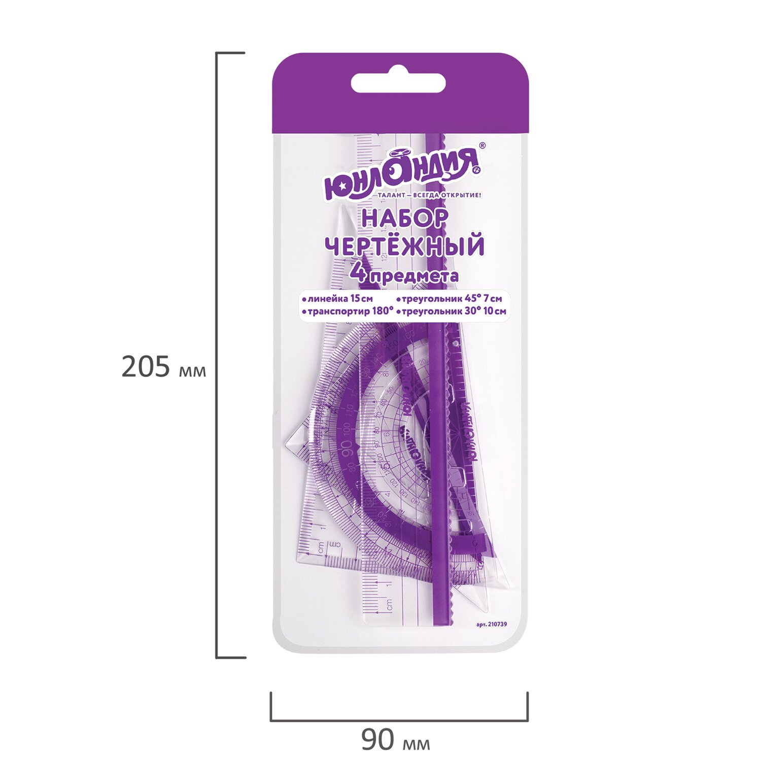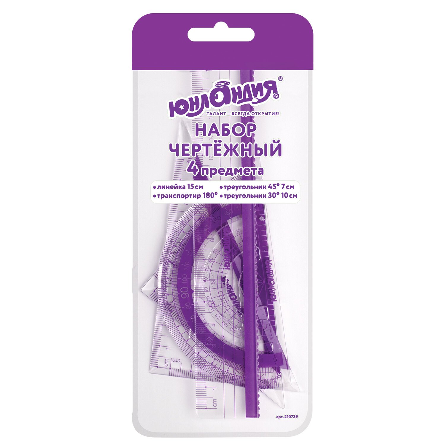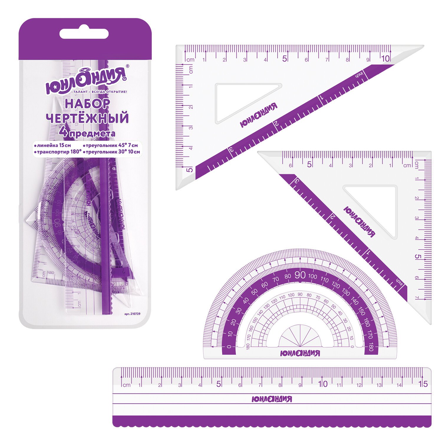 Набор чертежный малый ЮНЛАНДИЯ "ГЕОМЕТРИЯ" (линейка 15 см, 2 треугольника, транспортир), фиолетовая шкала, 210739