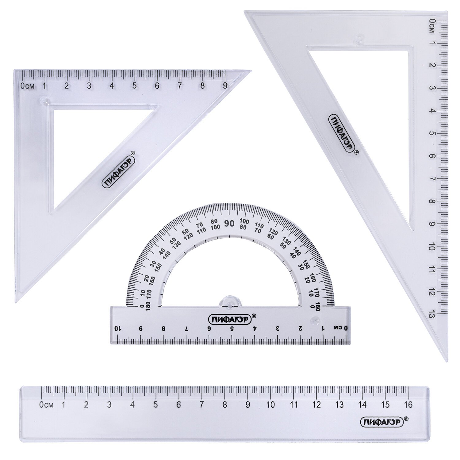 Набор чертежный ПИФАГОР (линейка 16 см, 2 треугольника, транспортир), прозрачный, европодвес, 210850