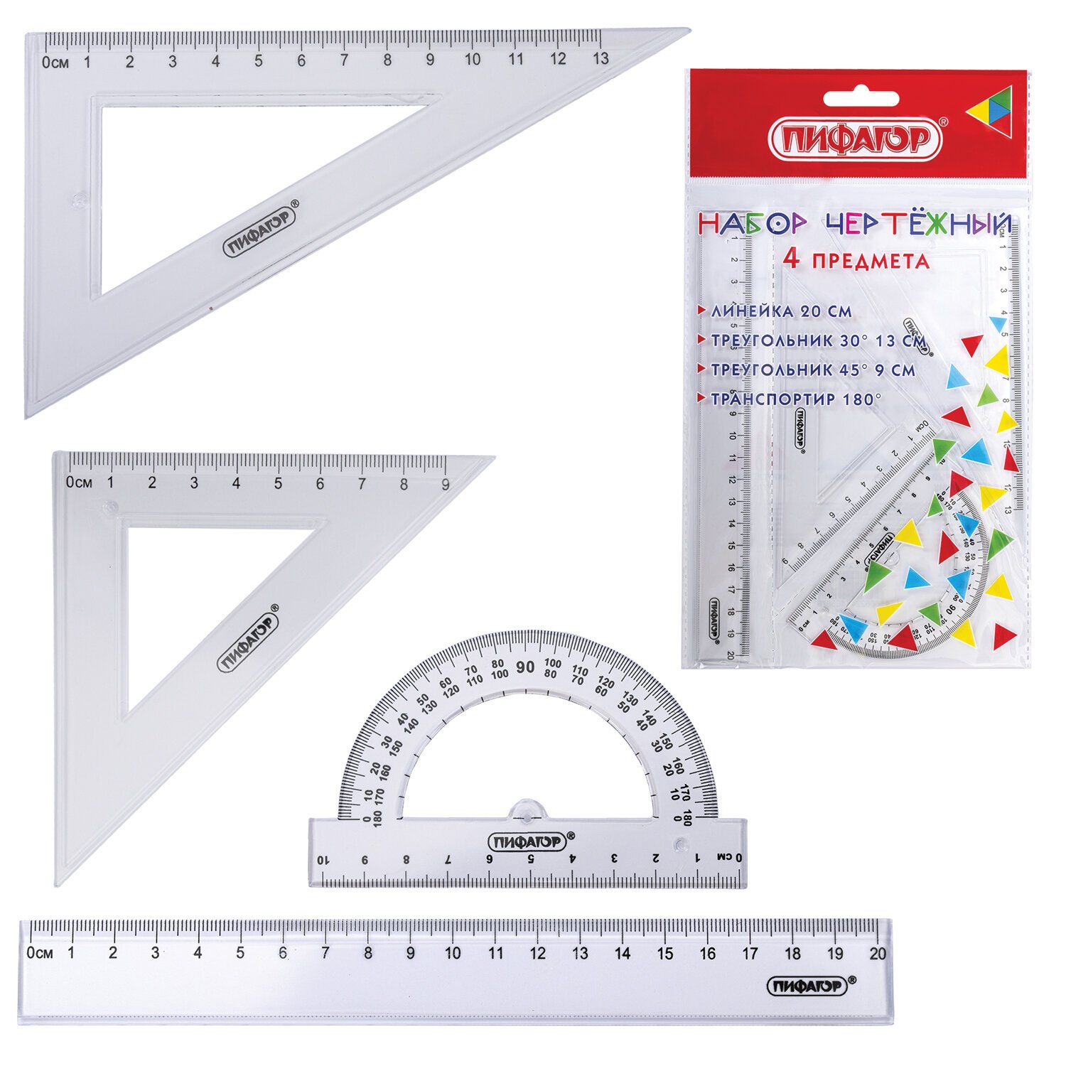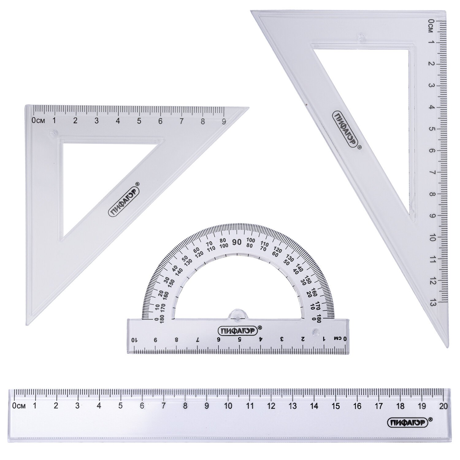 Набор чертежный средний ПИФАГОР (линейка 20 см, 2 треугольника, транспортир), прозрачный, бесцветный, пакет, 210627