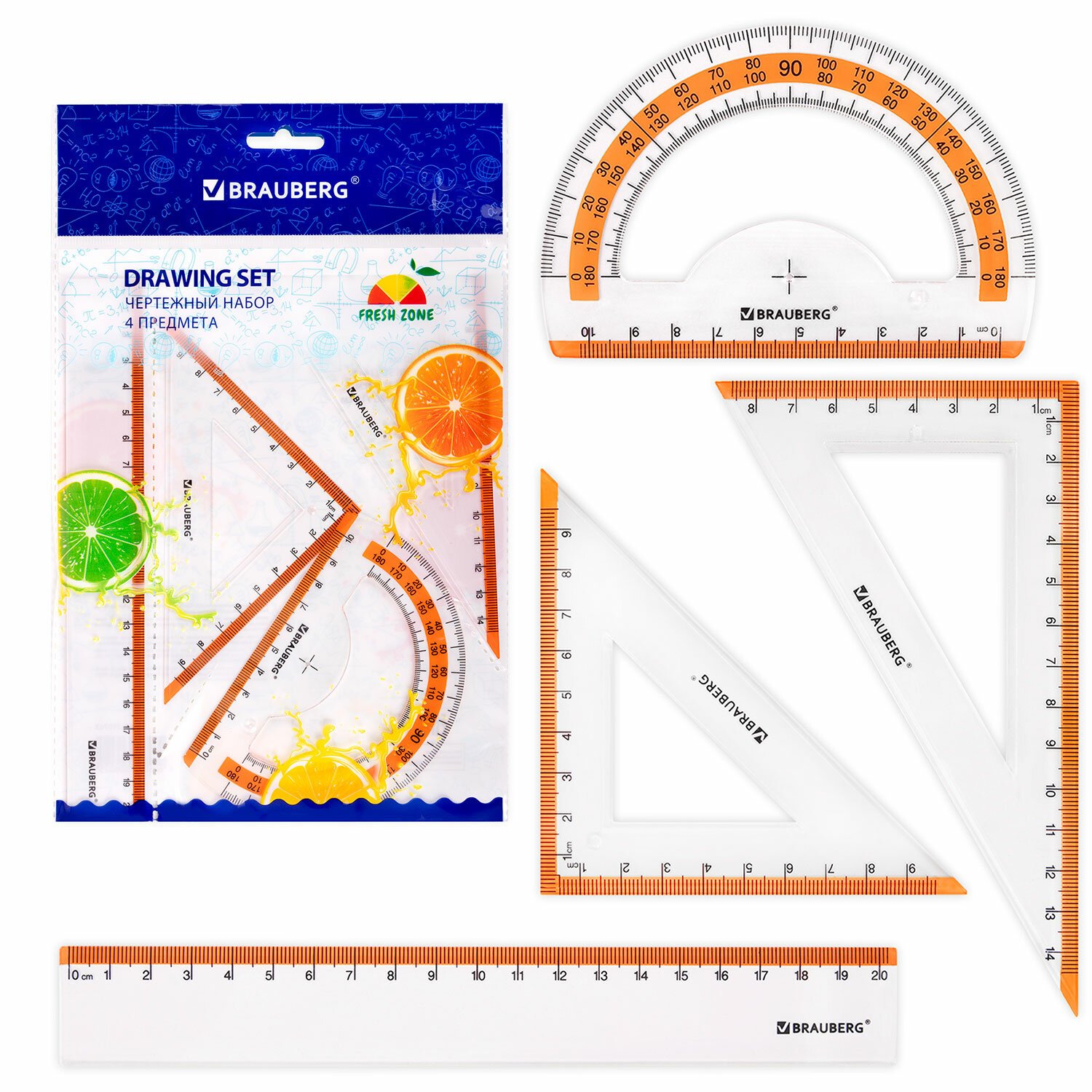 Набор чертежный BRAUBERG "FRESH ZONE" изготовлен из прочного прозрачного пластика со шкалой оранжевого цвета. Поставляется в пластиковом пакете с европодвесом.