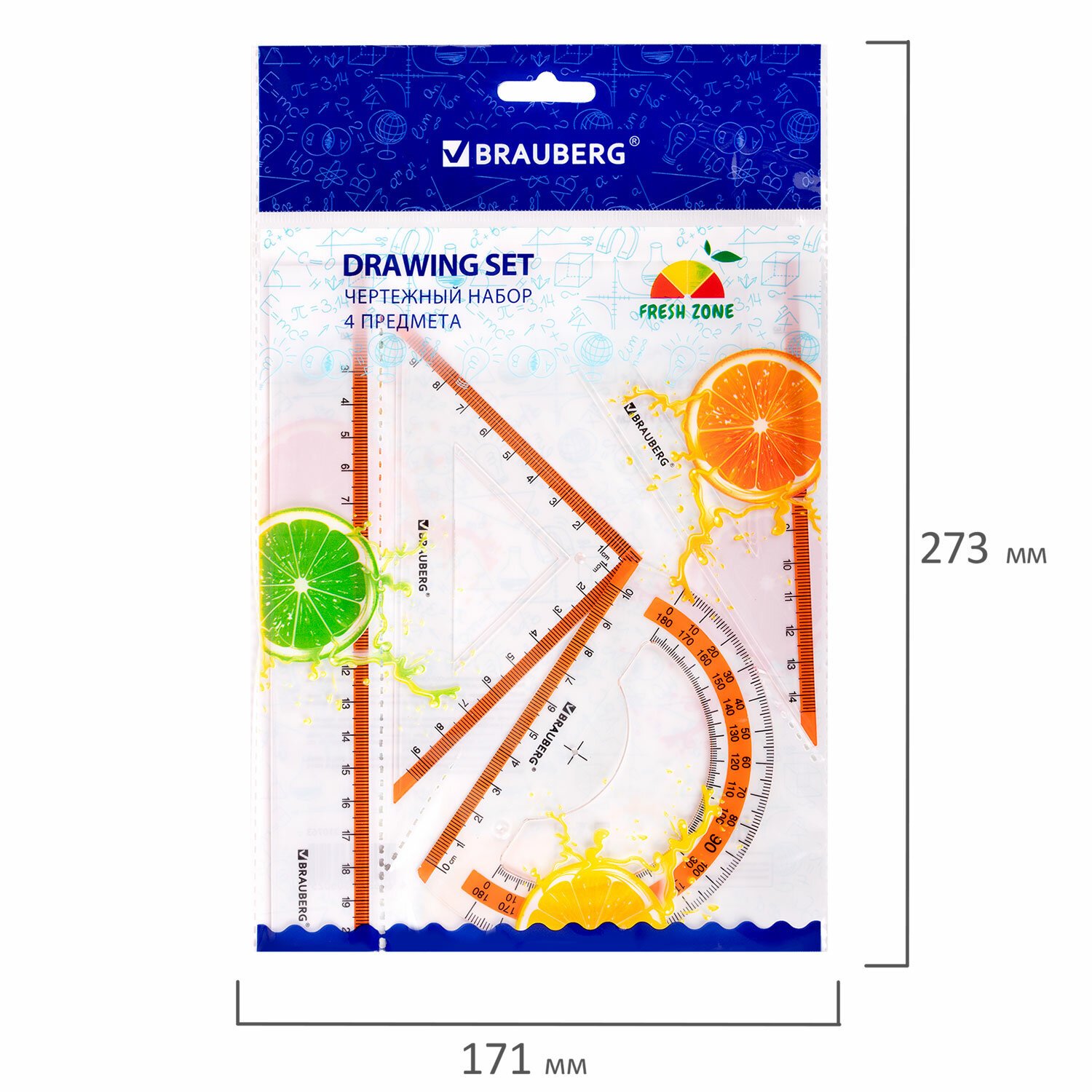 Набор чертежный BRAUBERG "FRESH ZONE" предназначен для выполнения чертежных и измерительных работ в школе и дома.