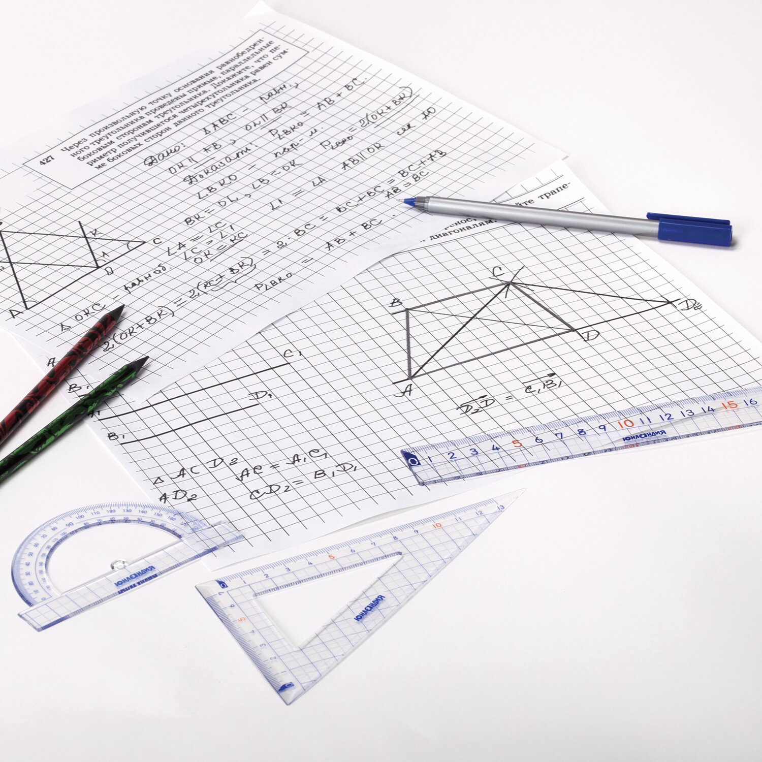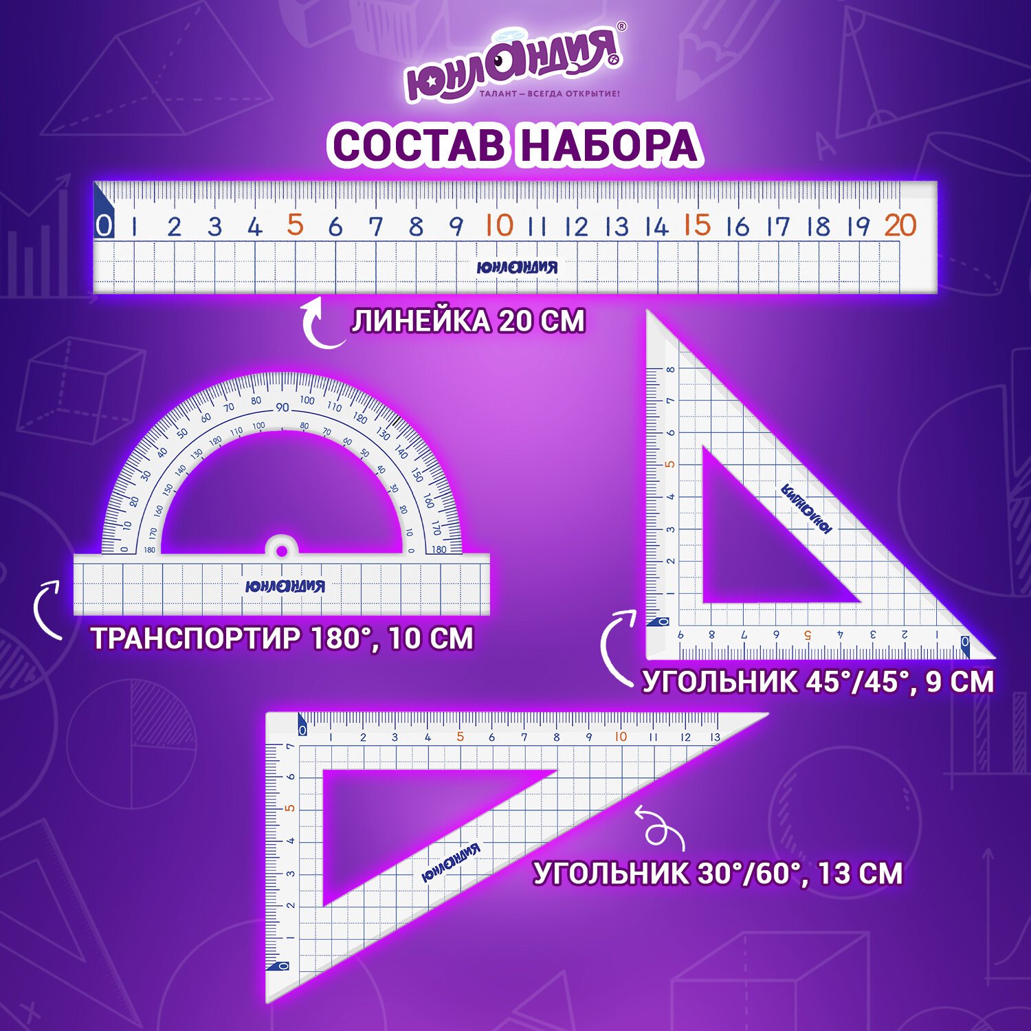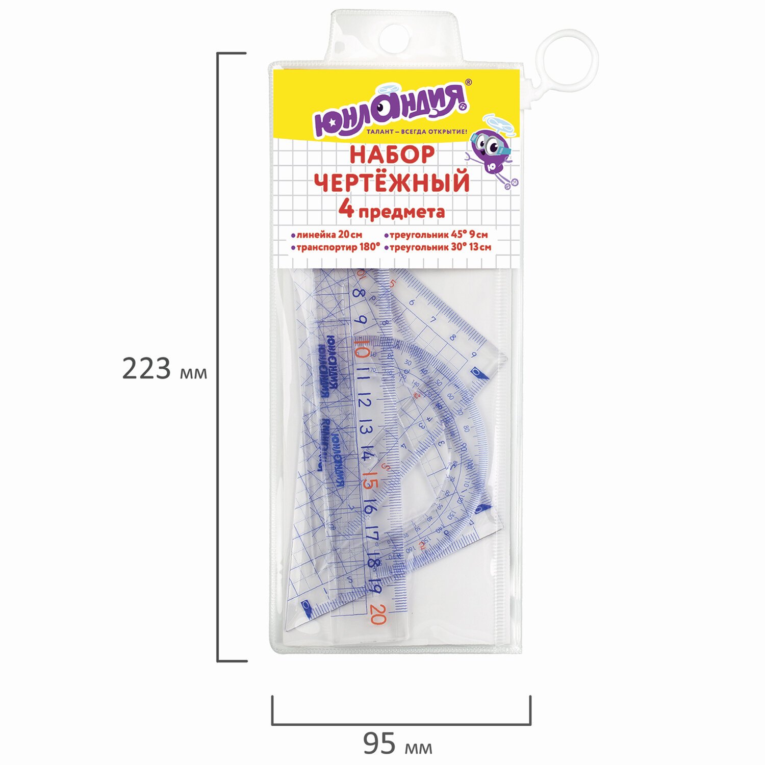Набор чертежный геометрический ЮНЛАНДИЯ "ШКОЛЬНЫЙ" предназначен для выполнения чертежных и измерительных работ.