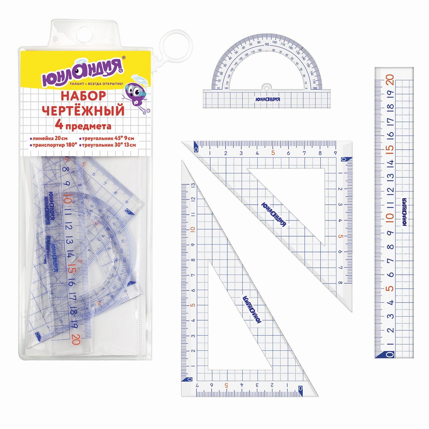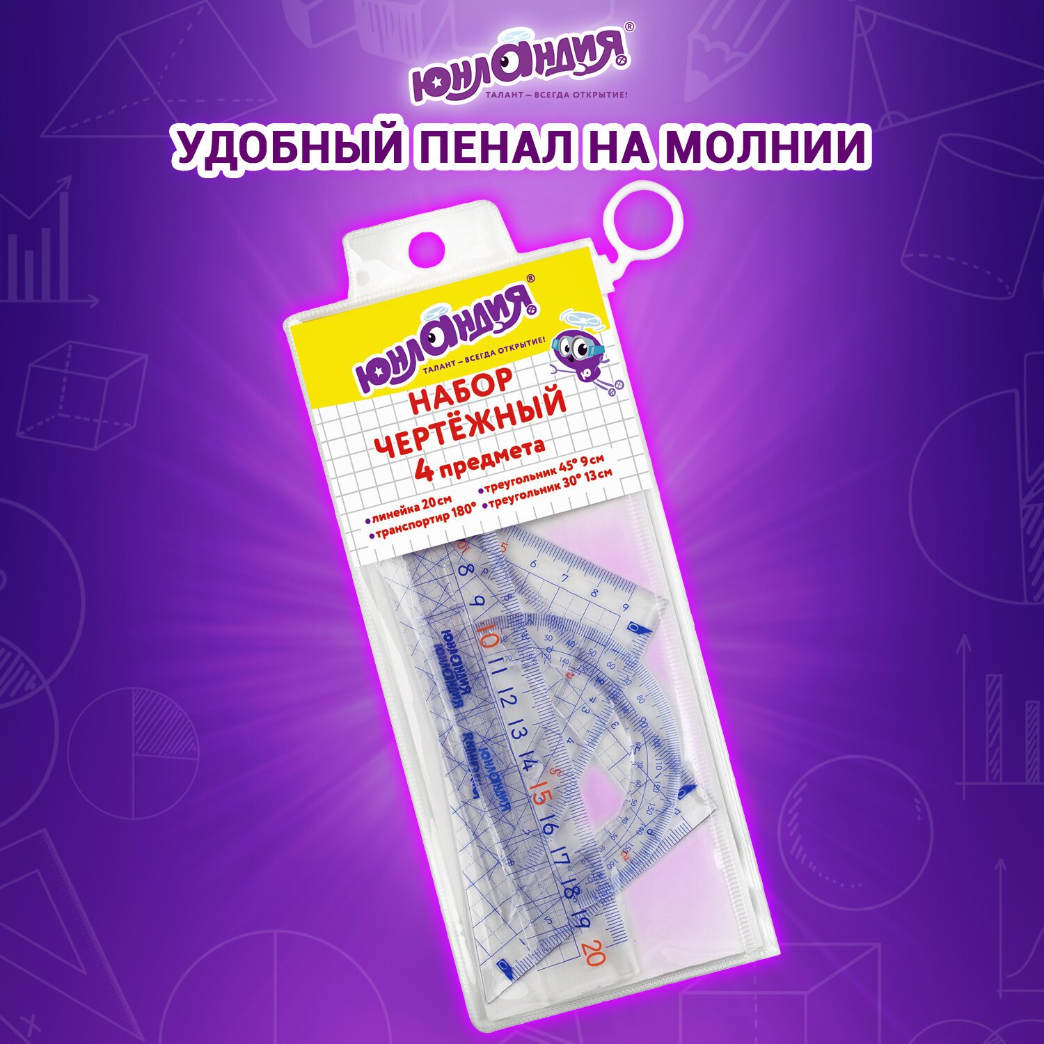 Набор чертежный ЮНЛАНДИЯ "ШКОЛЬНЫЙ" (линейка 20 см, 2 угольника, транспортир), пенал, 210737