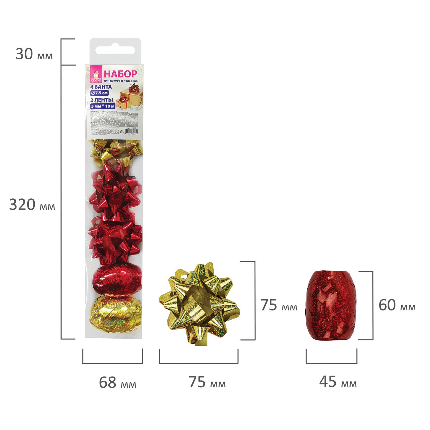 Набор состоит из 2-х лент шириной 5 мм и длиной 10 м каждая, а также из 4-х бантов-звезд диаметром 7,5 см. Товар представлен в 2-х цветах с голографическим эффектом: красном и золотистом. Ленты и банты выполнены из прочного полипропилена (70%), полиэтилена (15%) и полиэтилентерефталата (15%). Банты являются самоклеящимися. Для того, чтобы прикрепить бантик, необходимо отклеить стикер с обратной стороны банта по линии перфорации и плотно прижать бант к поверхности. Набор упакован в ПВХ-коробку.