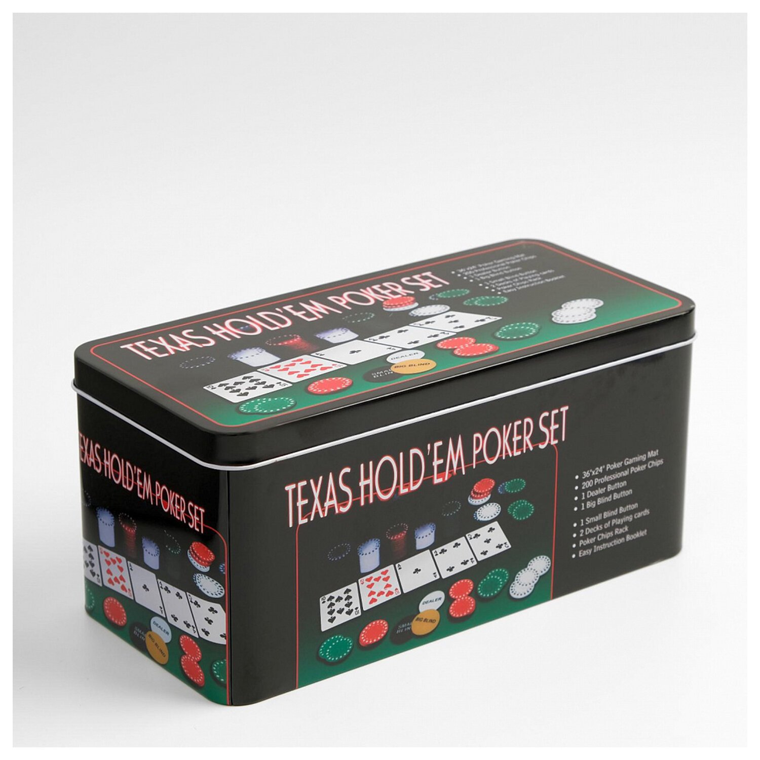 В набор входят: металлическая коробка, фишки для покера с номиналом 200 шт., пластиковые карты для покера 2 колоды, сукно для игры.