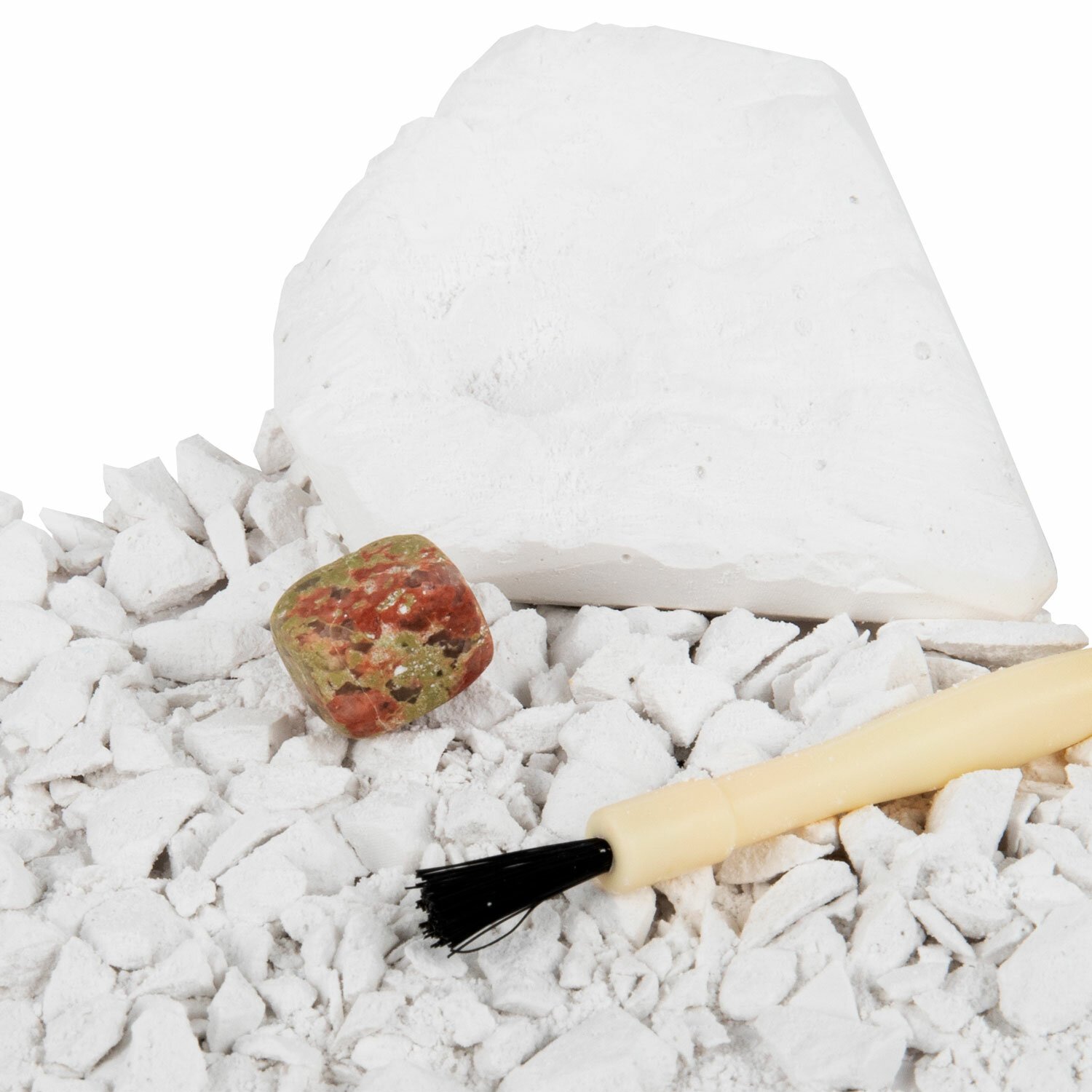 Как играть: возьмите гипсовый блок и удобно расположите для работы на поверхности. Возьмите долото и начинайте процесс раскопок. Когда появится какая-то часть минерала, лишний гипс можно смахнуть кисточкой. После полного освобождения камня нужно по картинке опознать его и прочитать информацию о нём на обратной стороне карточки. Таким образом, ваш ребенок будет не только увлечен процессом раскопок, но и получит ценную информацию о каждом минерале из набора. Чтобы легче извлечь камень из гипсового блока, его можно поместить в воду на 15-20 минут для размягчения гипса.