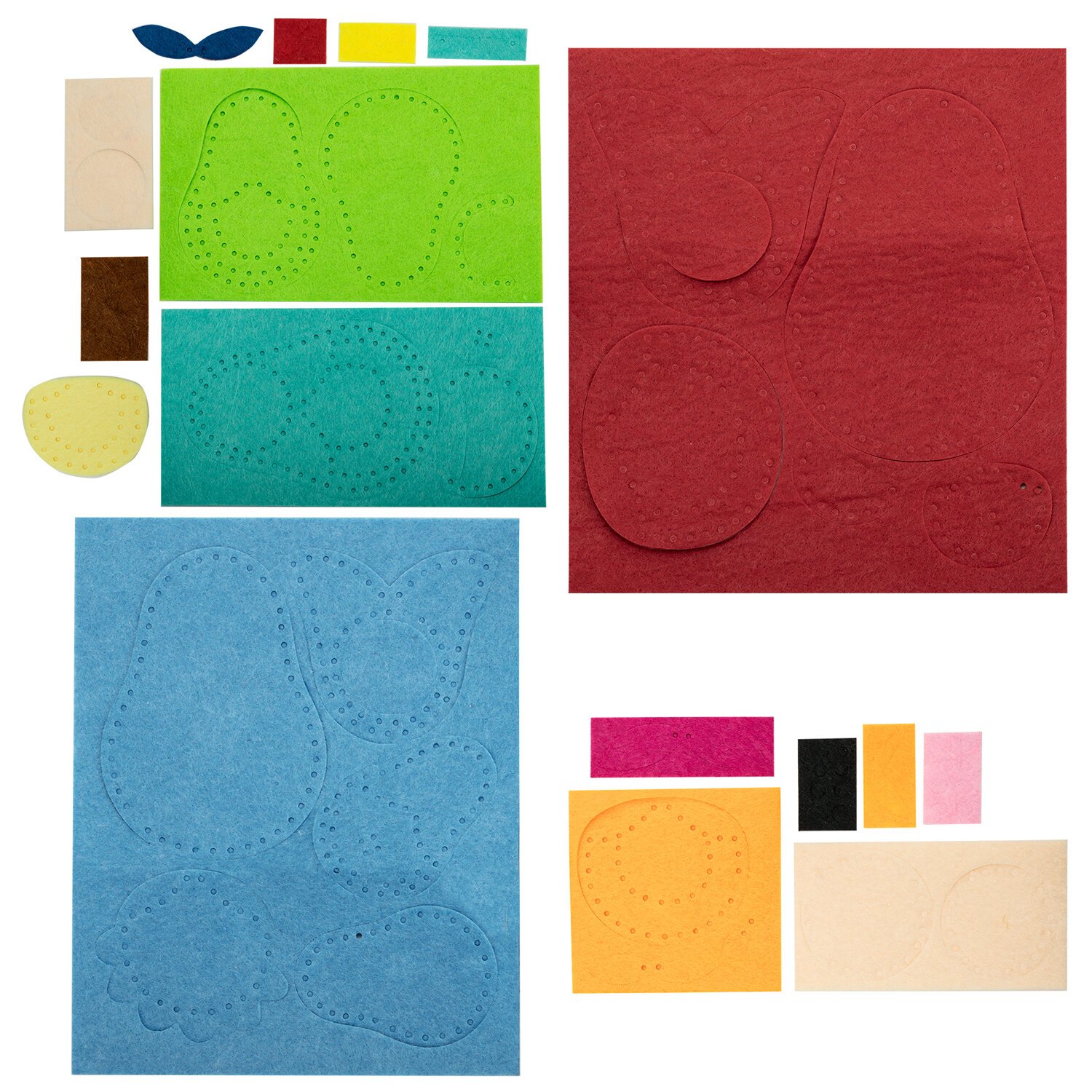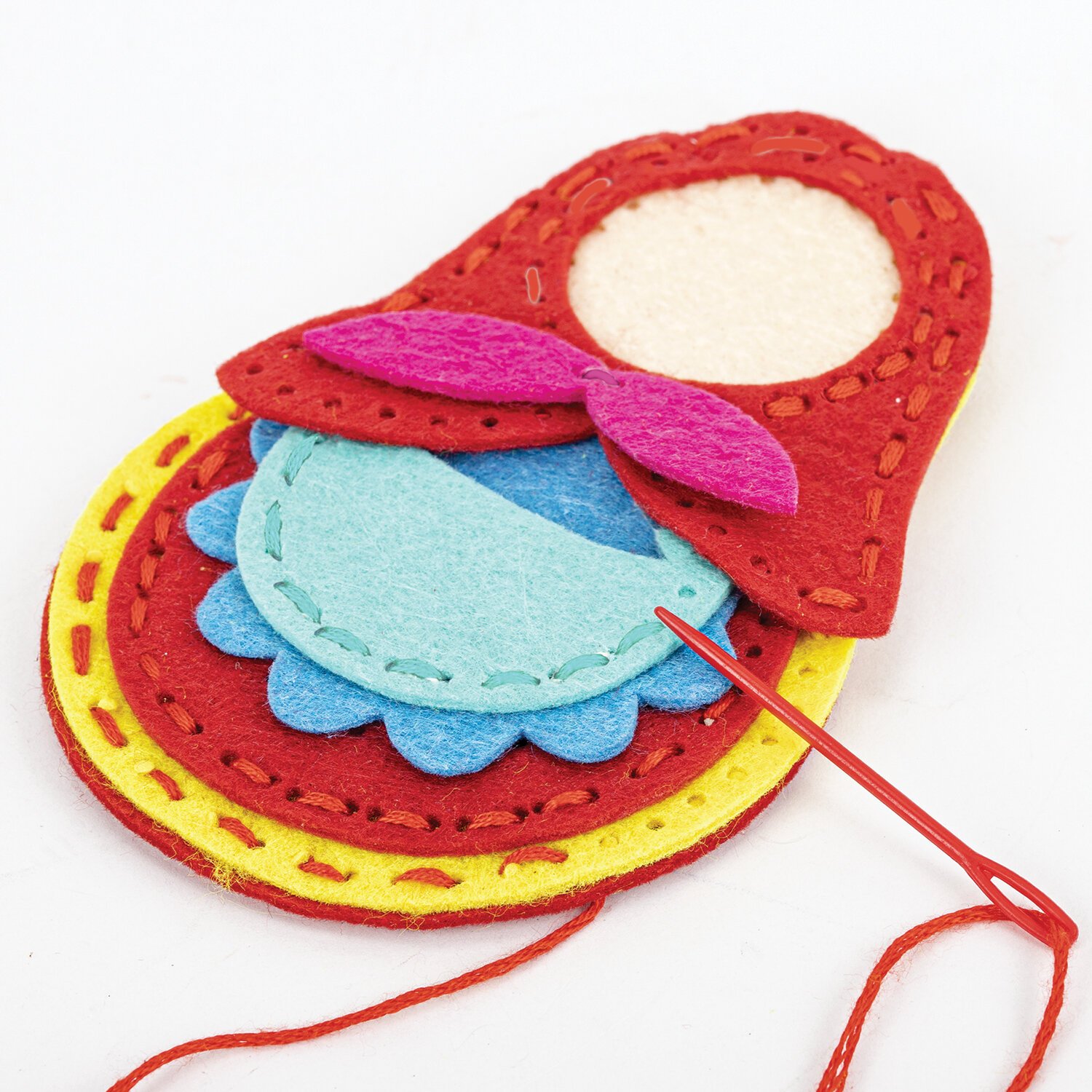 - фетровые элементы, содержащие перфорацию по краям и предназначенные для сшивания 4 матрешек разного размера и цвета.