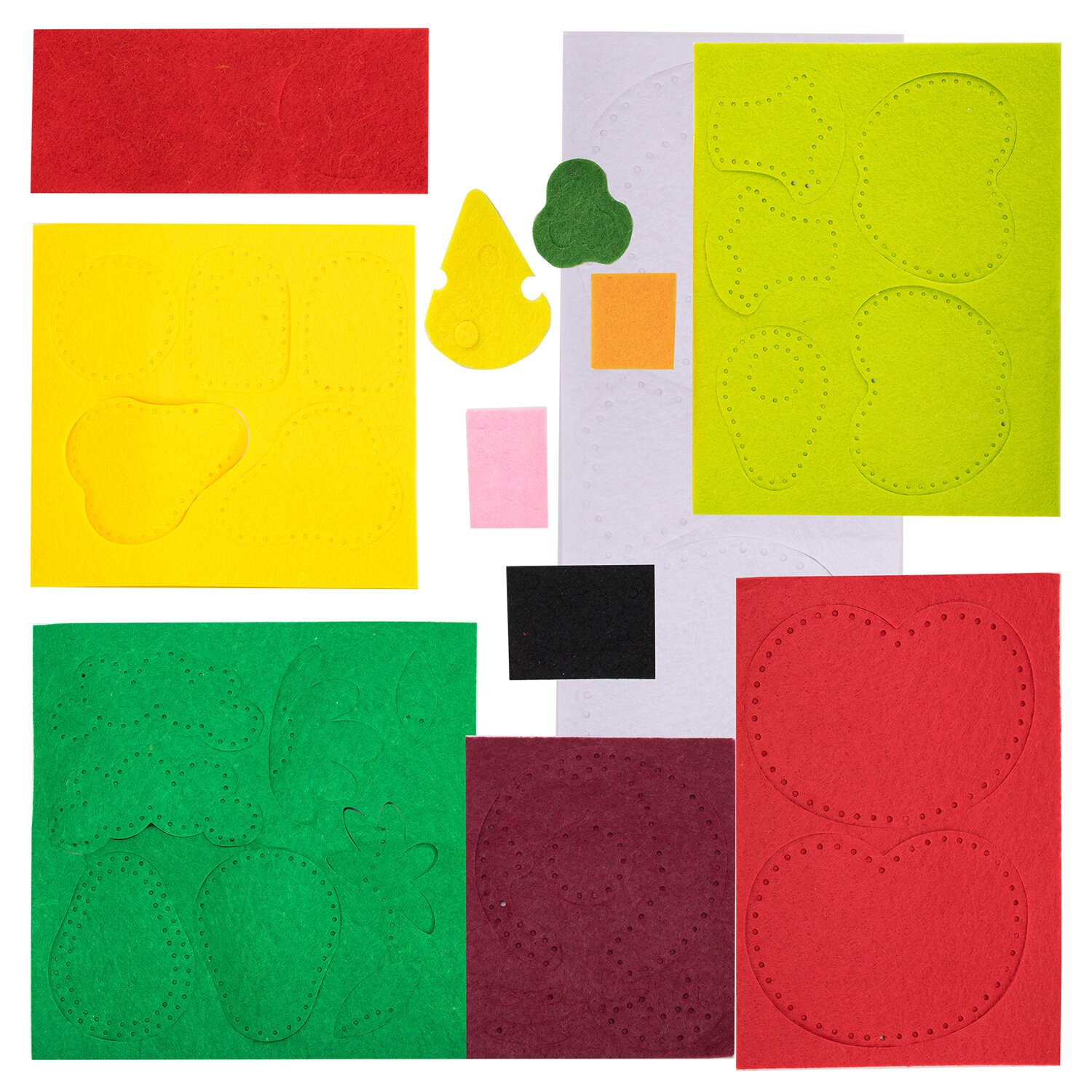 - фетровые элементы, содержащие перфорацию по краям и предназначенные для сшивания 10 игрушек из фетра: