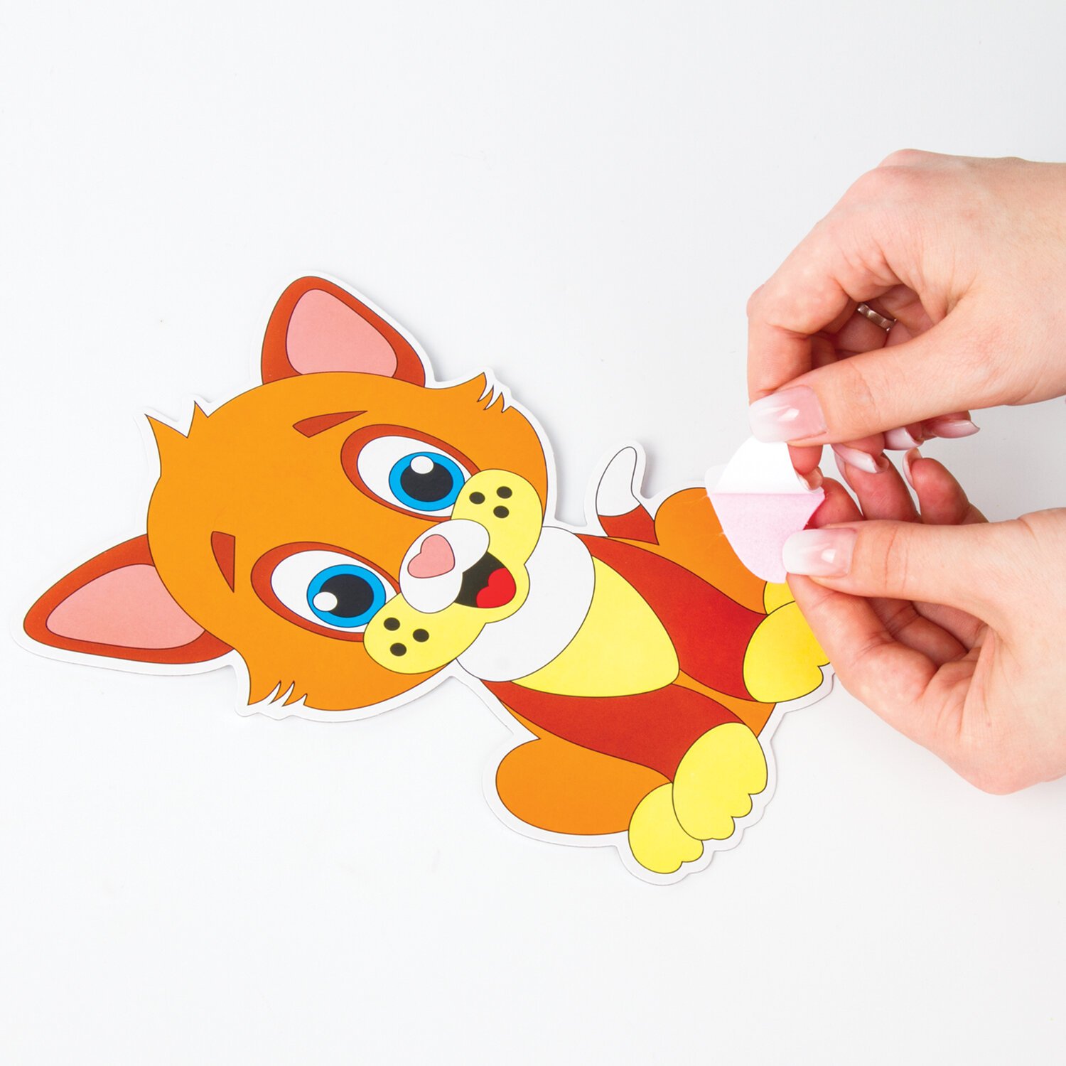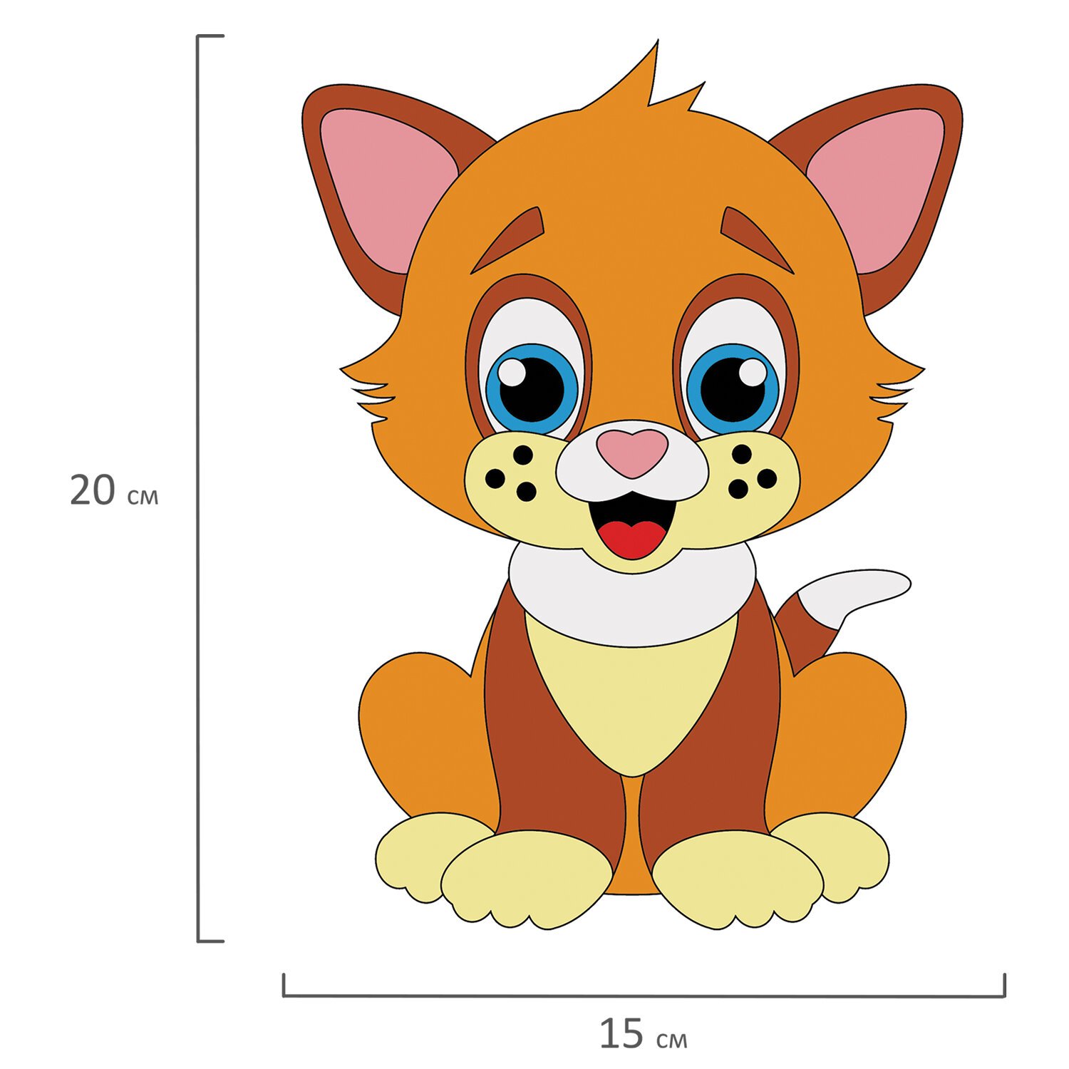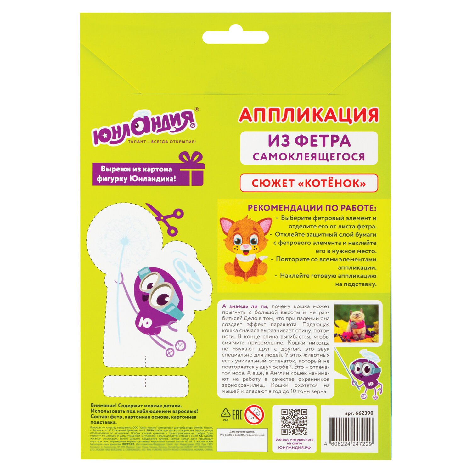 В набор входит яркая картонная основа в форме котёнка размером не более 20х15 см с напечатанным дизайном аппликации, разработанным дизайнерами ЮНЛАНДИЯ специально для детей, а также 8 листов фетра разных цветов. Фетровые элементы аппликации перфорированы и имеют клеевой слой, что позволяет создать аппликацию без клея и ножниц. Также в набор входит картонная подставка с клеевым слоем, на которую можно установить готовую аппликацию.