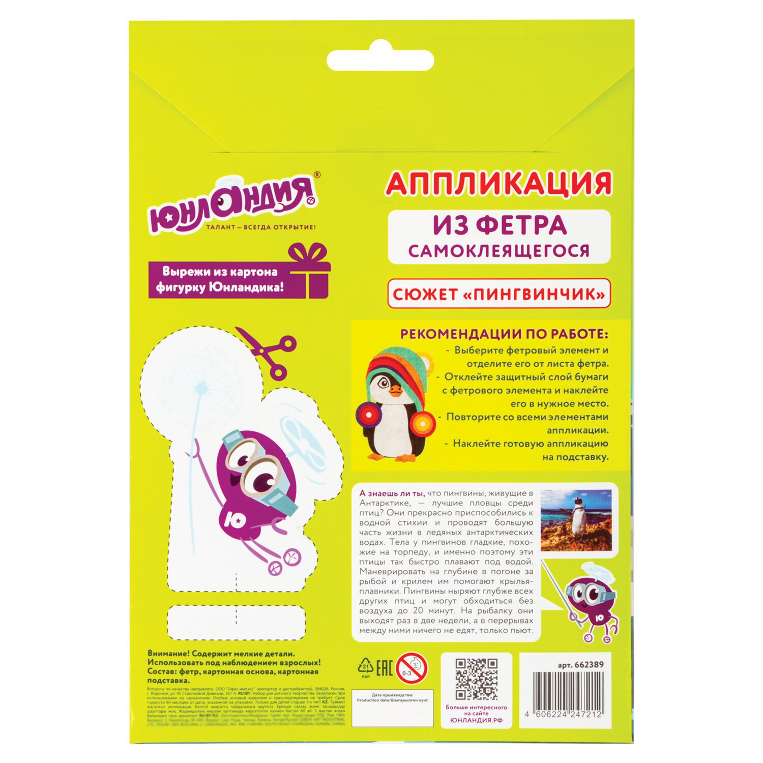 В набор входит яркая картонная основа в форме пингвина размером не более 20х15 см с напечатанным дизайном аппликации, разработанным дизайнерами ЮНЛАНДИЯ специально для детей, а также 8 листов фетра разных цветов. Фетровые элементы аппликации перфорированы и имеют клеевой слой, что позволяет создать аппликацию без клея и ножниц. Также в набор входит картонная подставка с клеевым слоем, на которую можно установить готовую аппликацию.