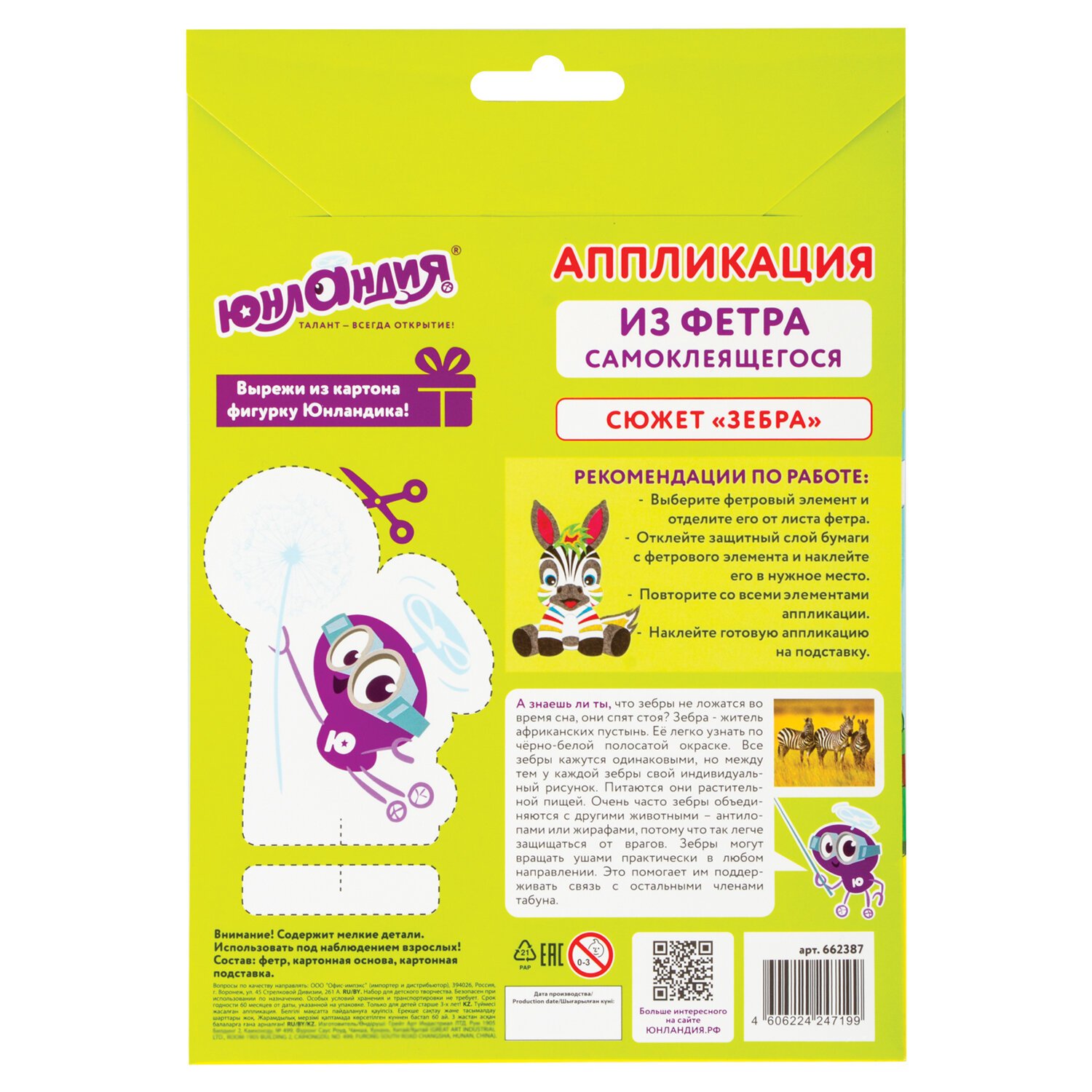 Аппликация из фетра ЮНЛАНДИЯ "Зебра" - это весёлый и занимательный способ развития мелкой моторики, аккуратности и фантазии ребёнка. Все элементы в составе самоклеящиеся, для работы не требуются ножницы и клей.