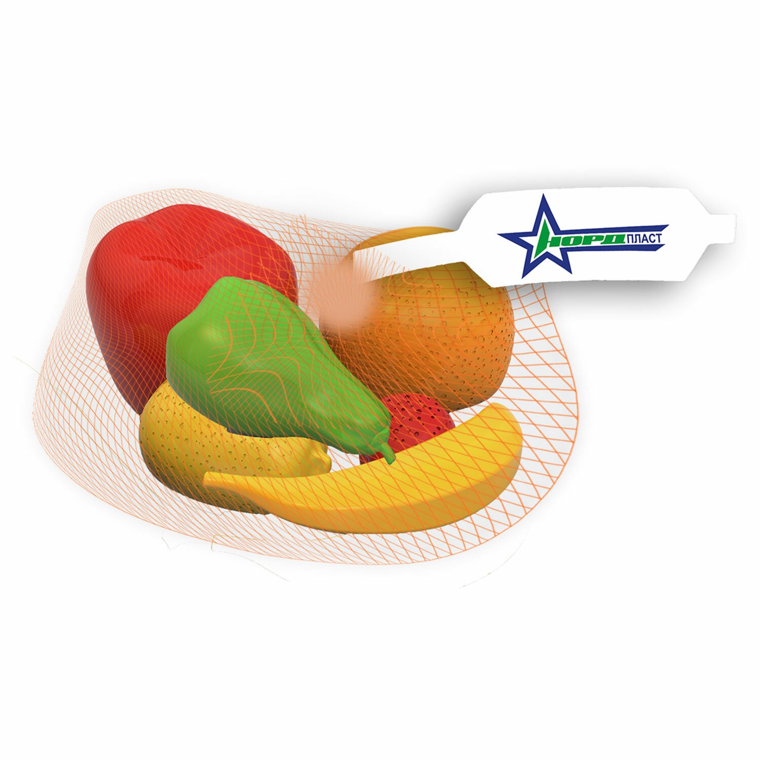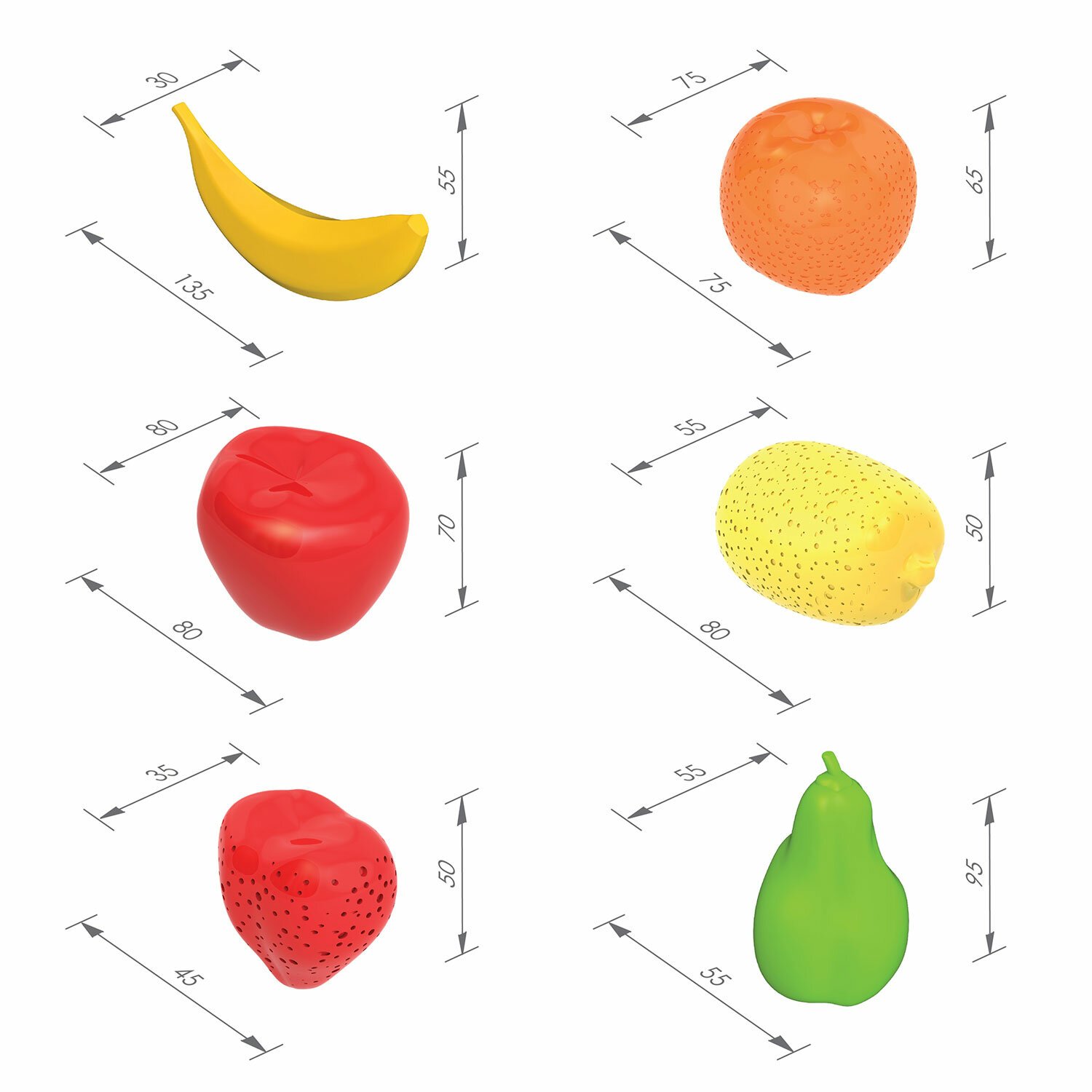 Комплектация: 1 банан, 1 груша, 1 лимон, 1 апельсин, 1 яблоко, 1 клубника.