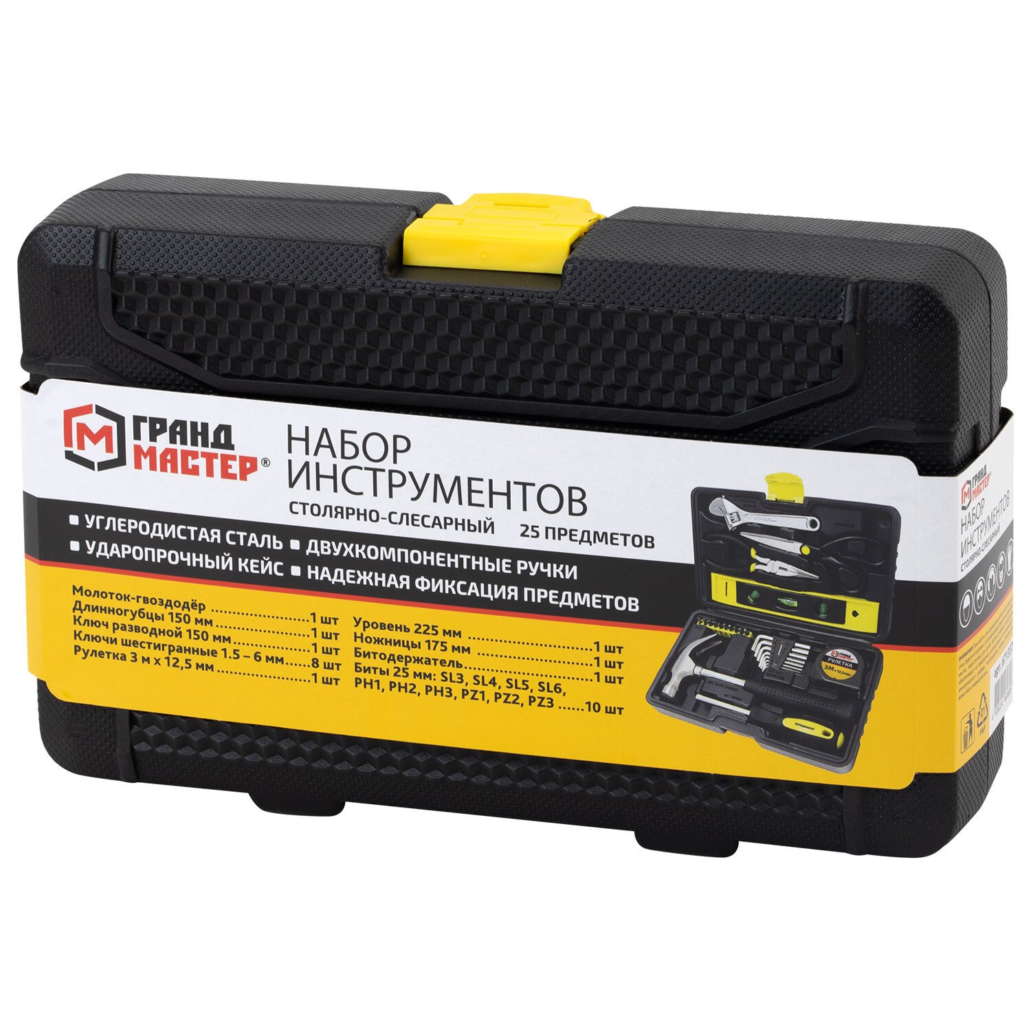 Набор инструментов столярно-слесарный, 25 предметов, пластиковый кейс, ГРАНДМАСТЕР, 671337