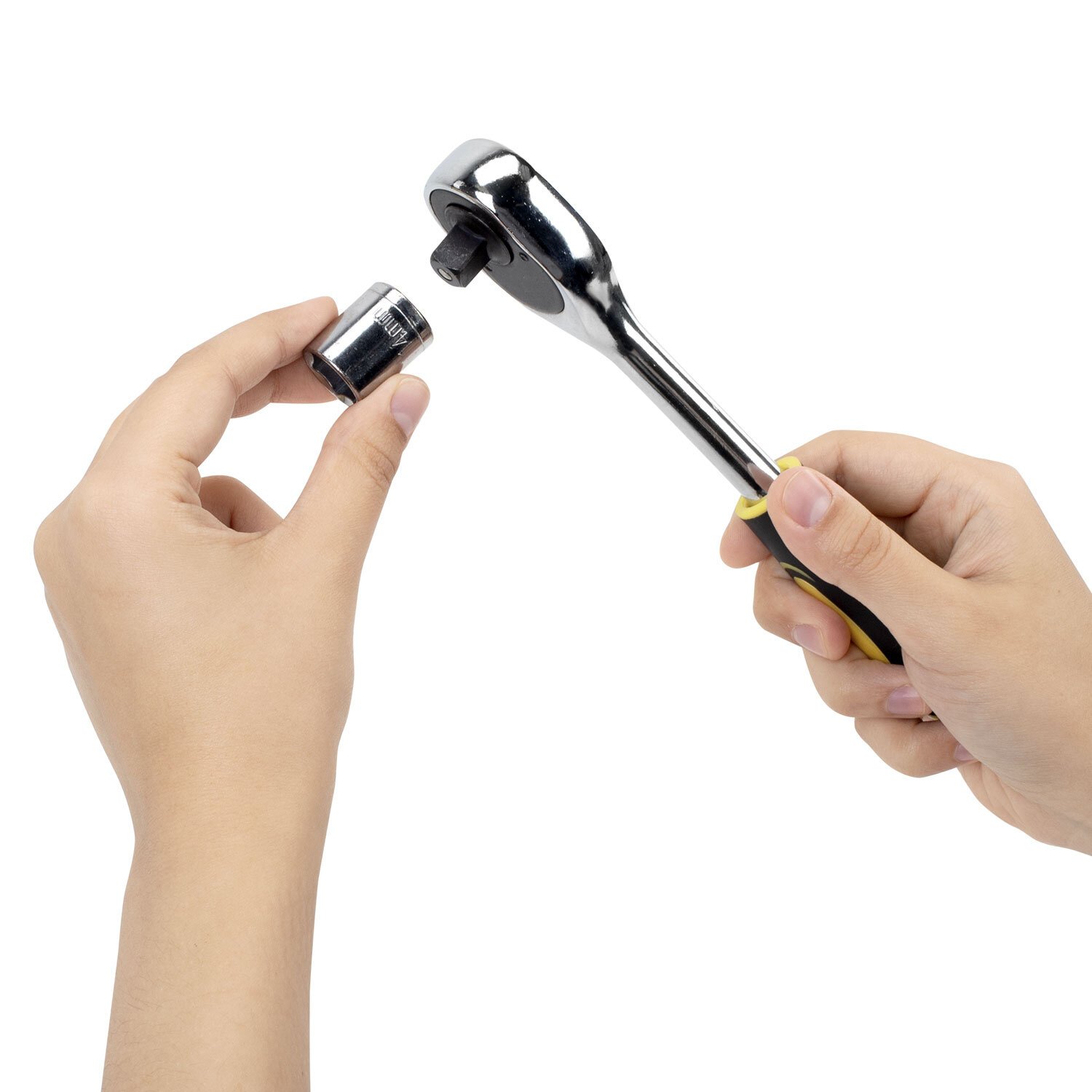 Реверсивная трещотка, удлинитель и адаптер обеспечивают доступ к креплениям и узлам даже в труднодоступных местах.