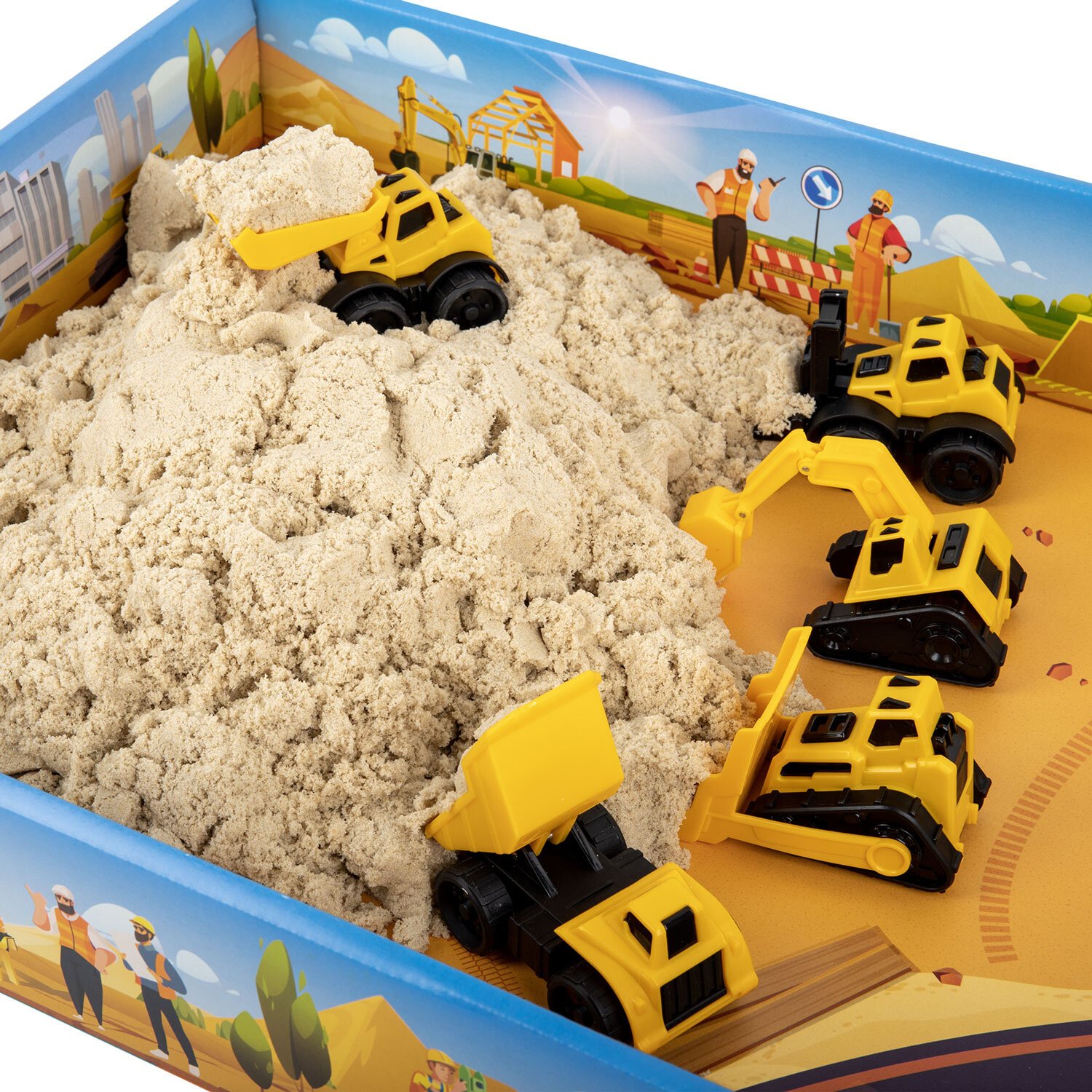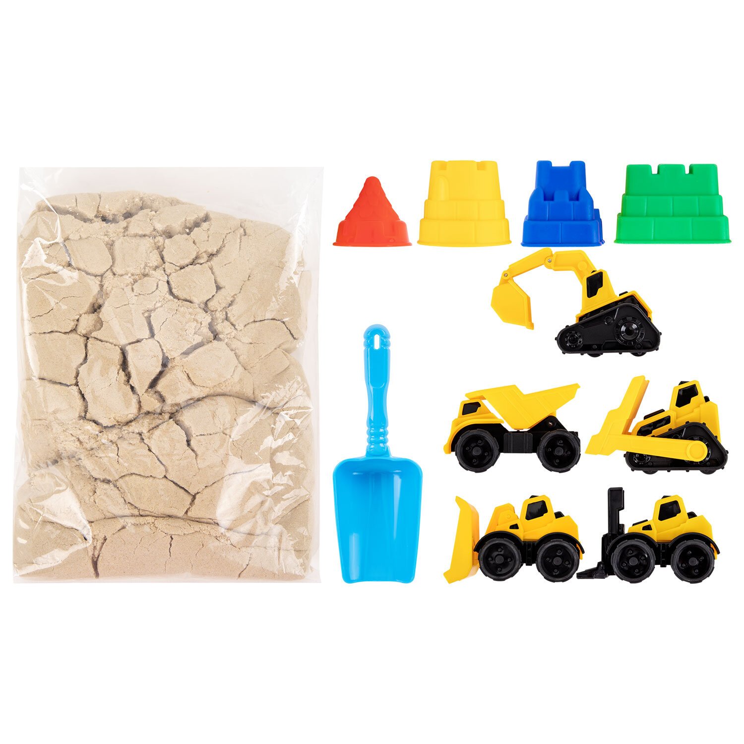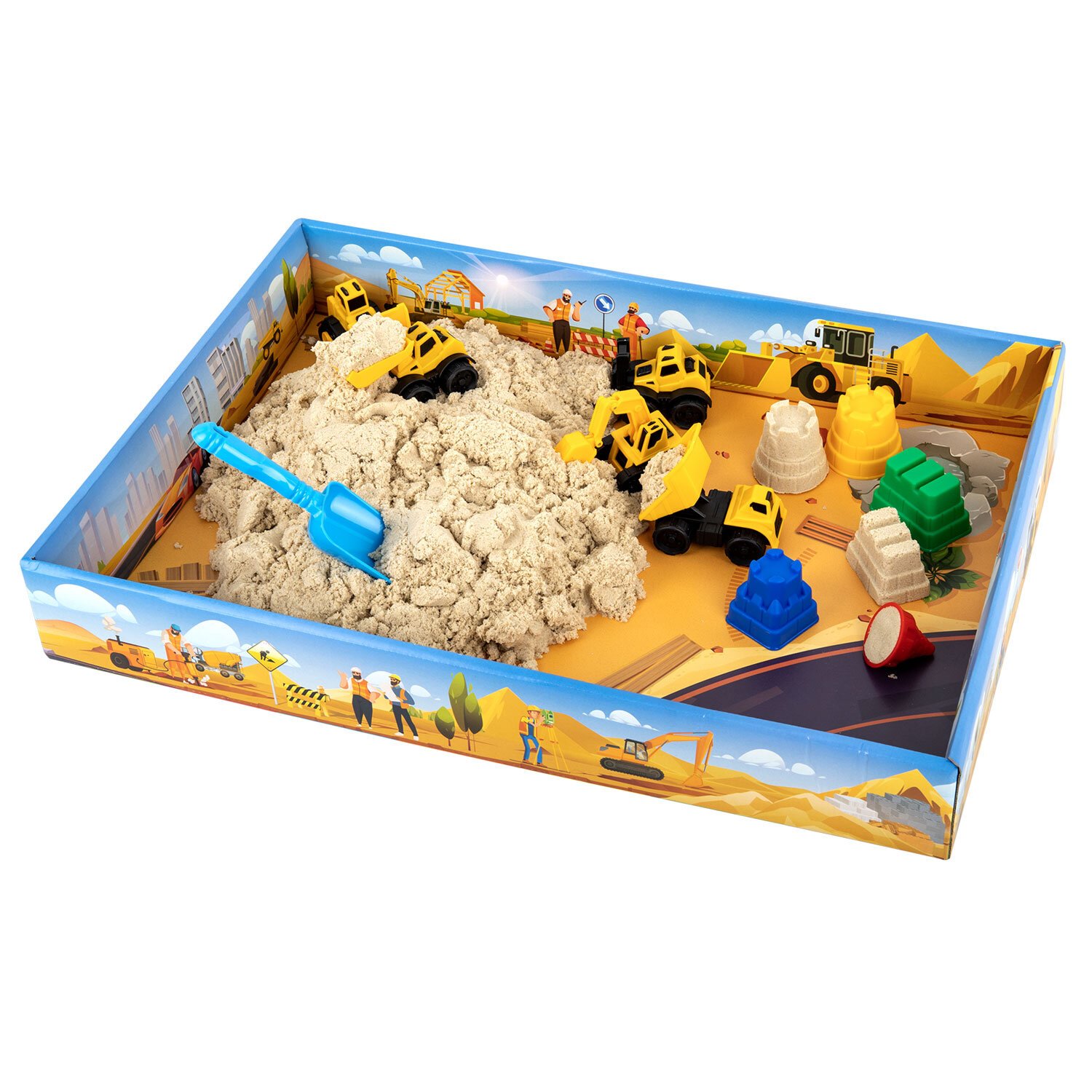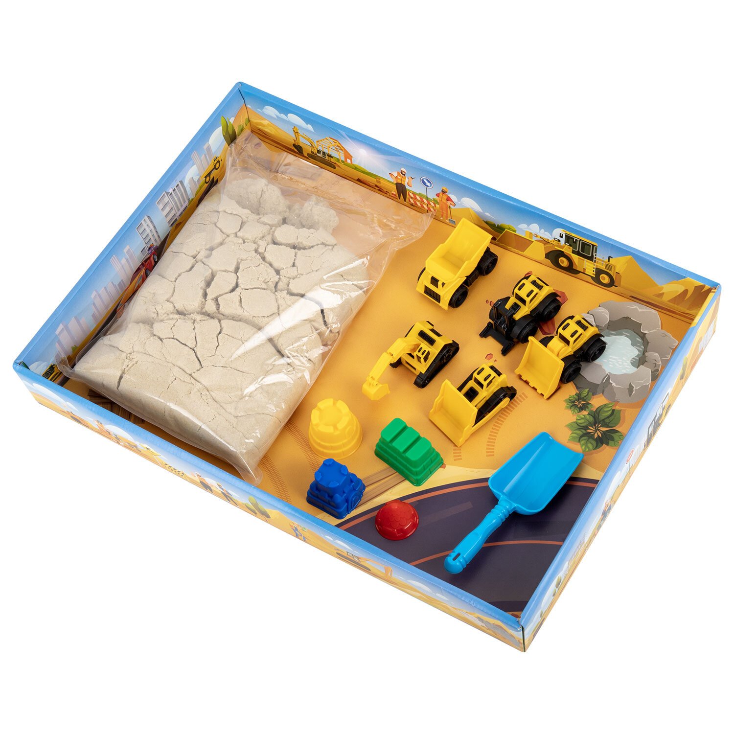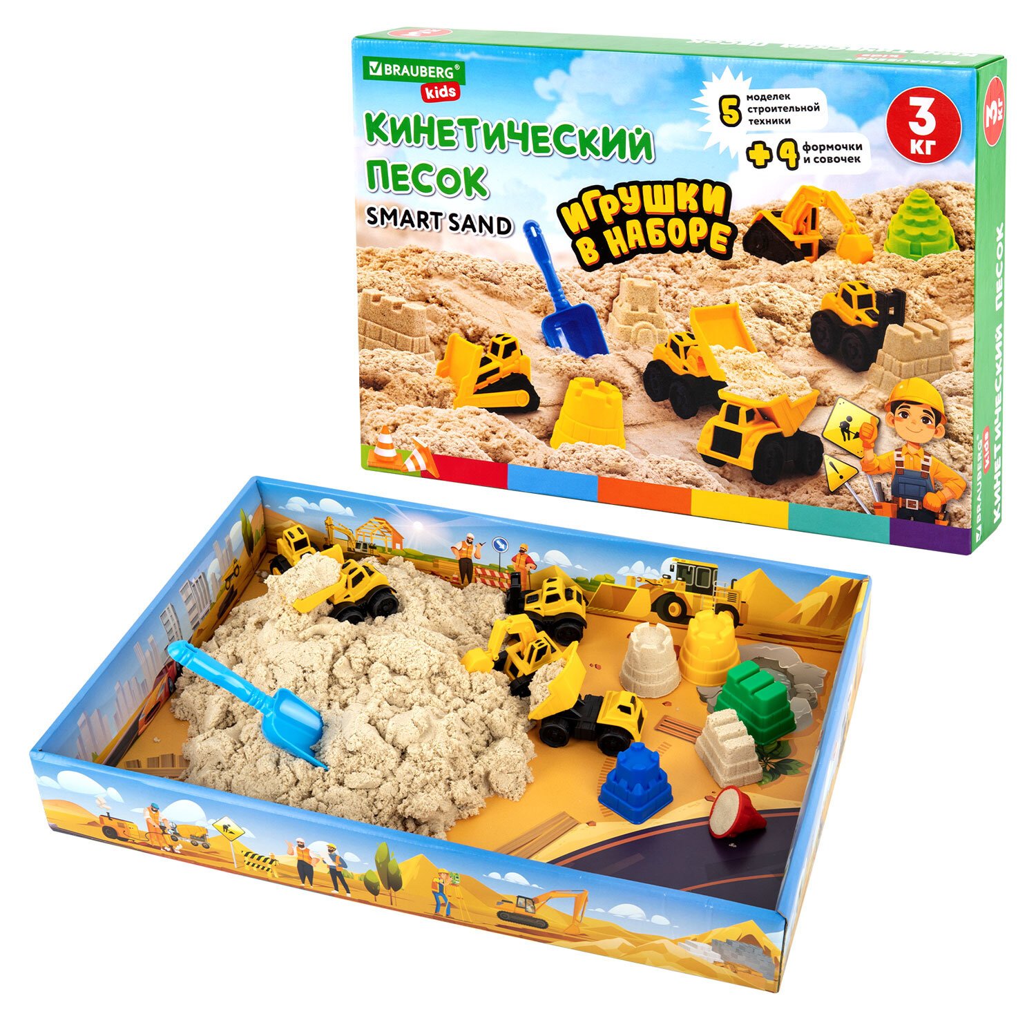 Состав набора: кинетический песок песочного цвета, 5 моделек строительной техники, совочек и 3 формочки для лепки. Вес набора - 3000 г. Весь набор удобно упакован в короб-песочницу.