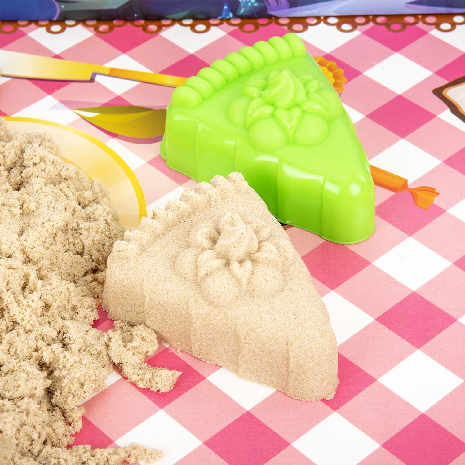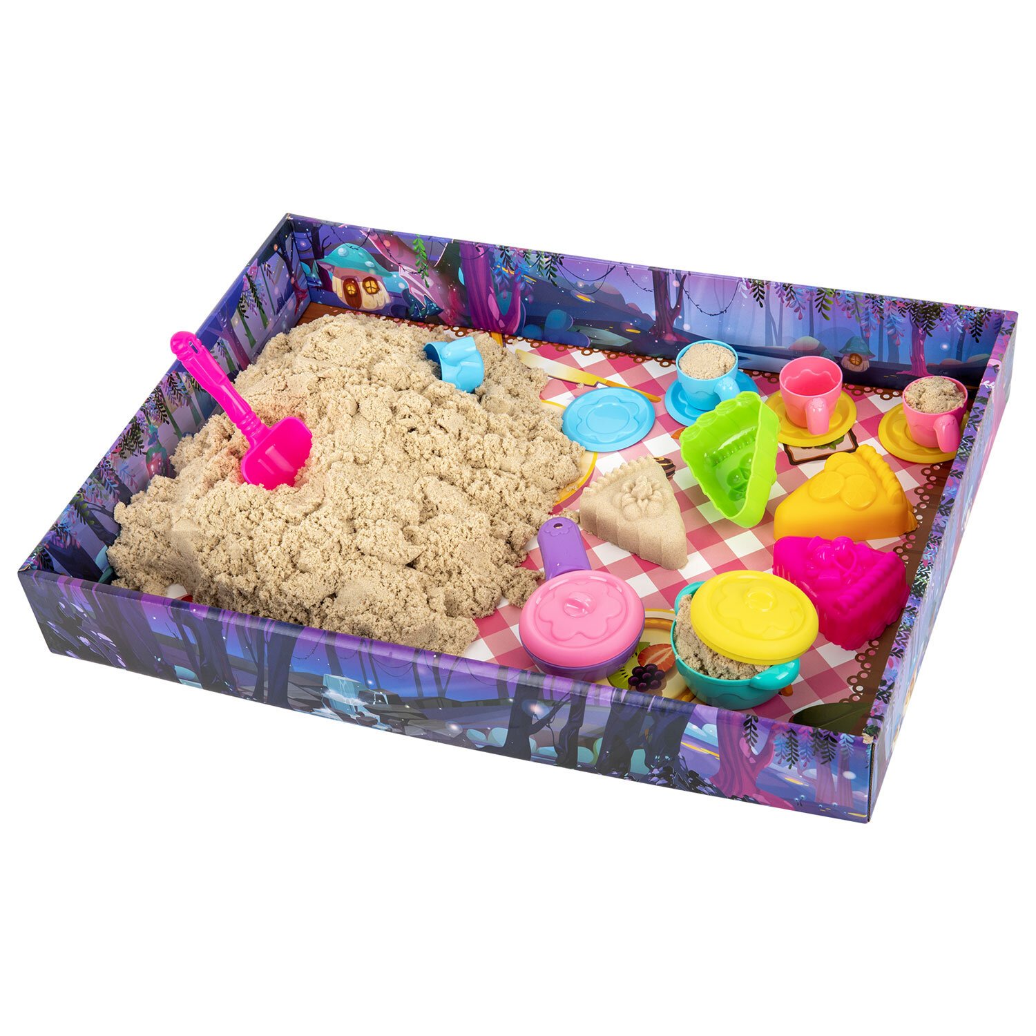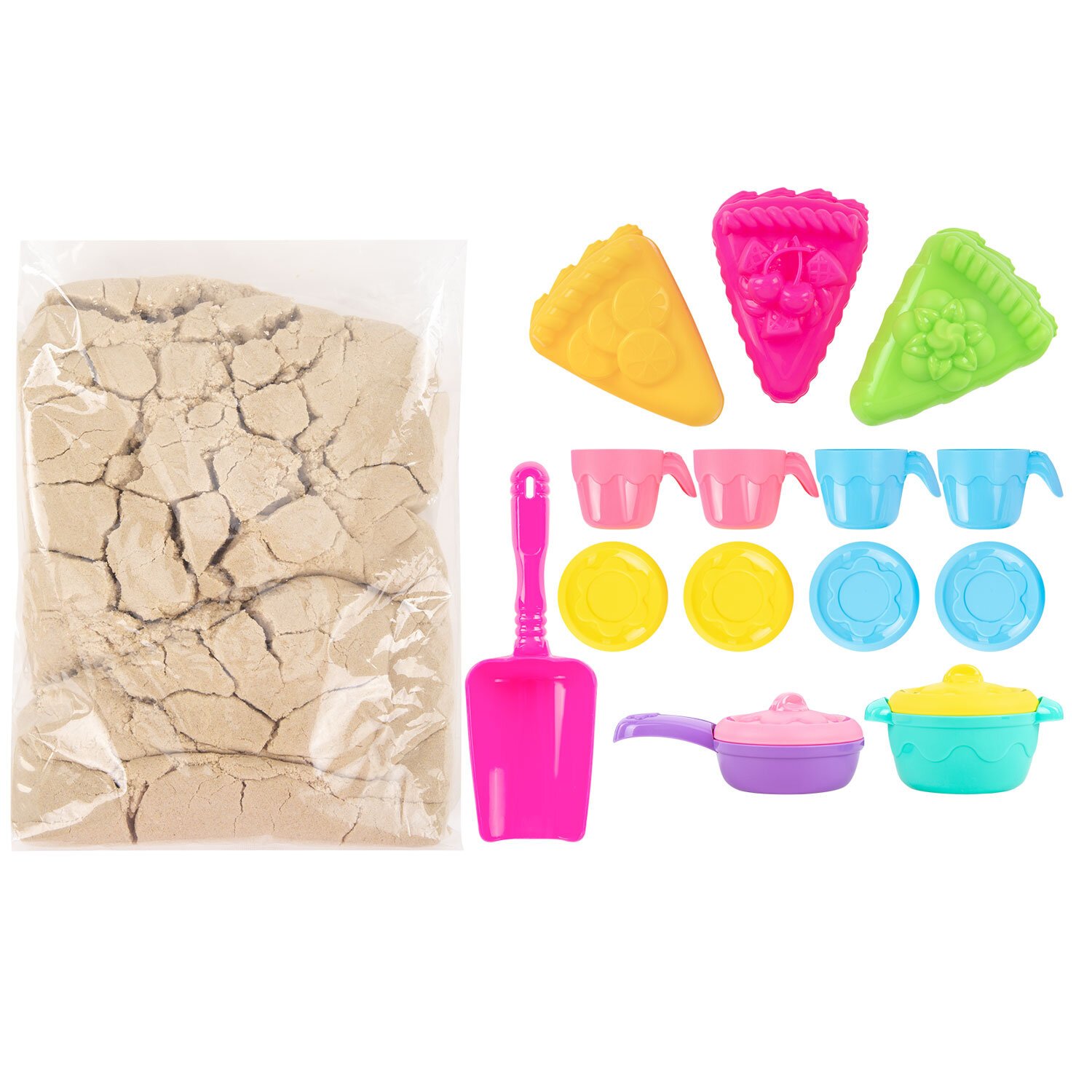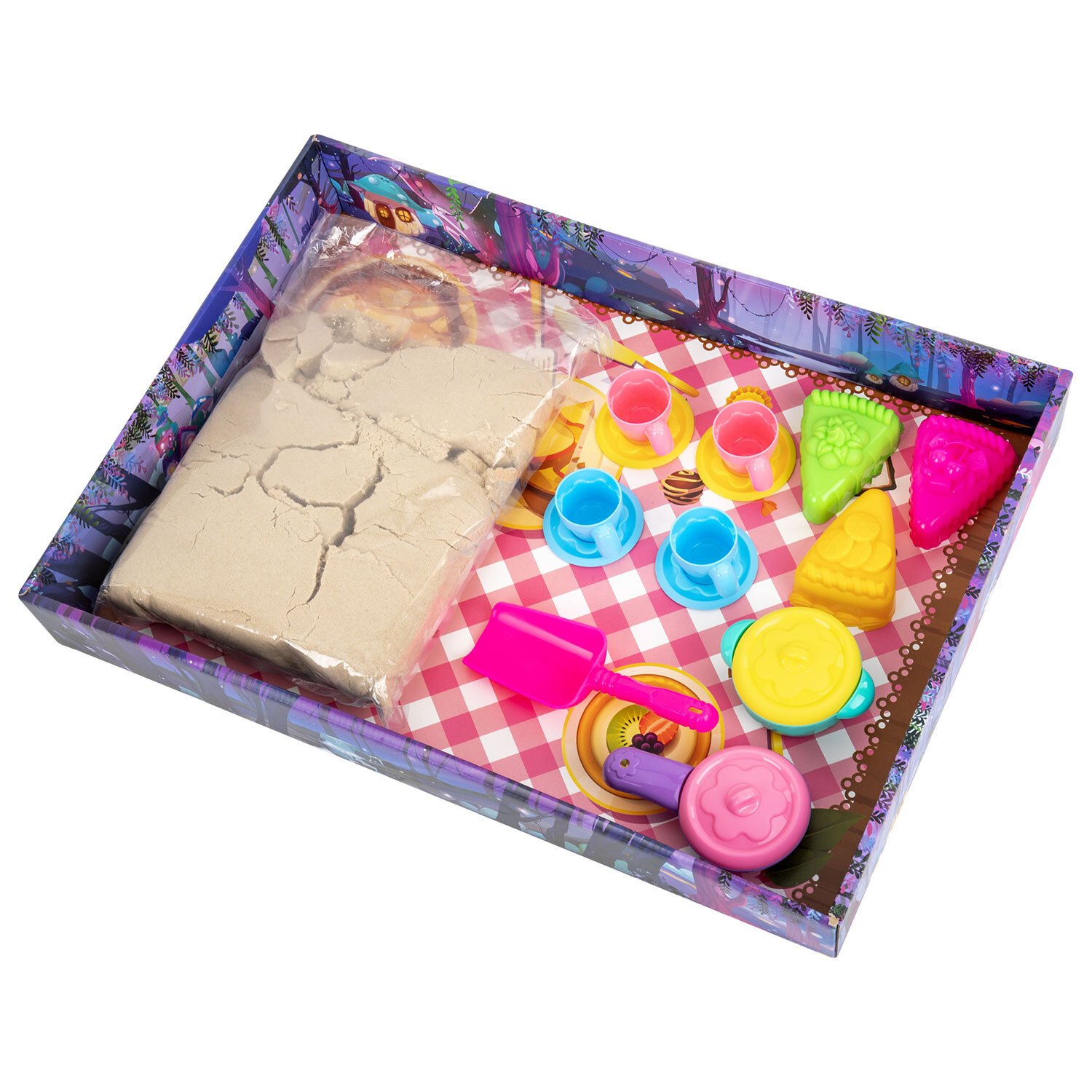 Состав набора: кинетический песок песочного цвета, игрушечная посуда, совочек и 4 формочки для лепки. Вес набора - 3000 г. Весь набор удобно упакован в короб-песочницу.