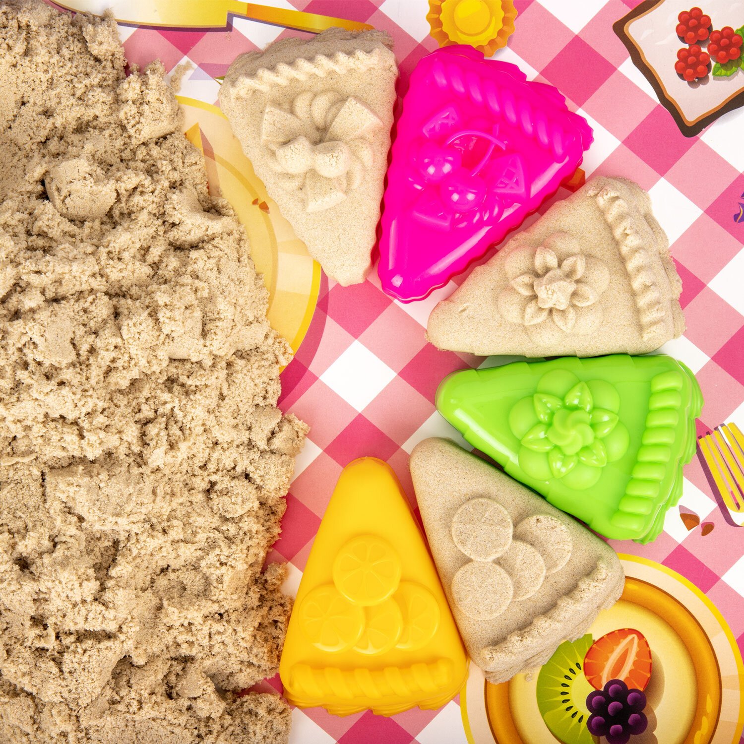 Песок не только развивает детскую фантазию, но и обучает пониманию цвета и формы, не оставляет пятен, не засыхает, не рассыпается, не прилипает к рукам, легко собирается с поверхности, способен принимать практически любую форму и играть с ним можно снова и снова в любое время года.