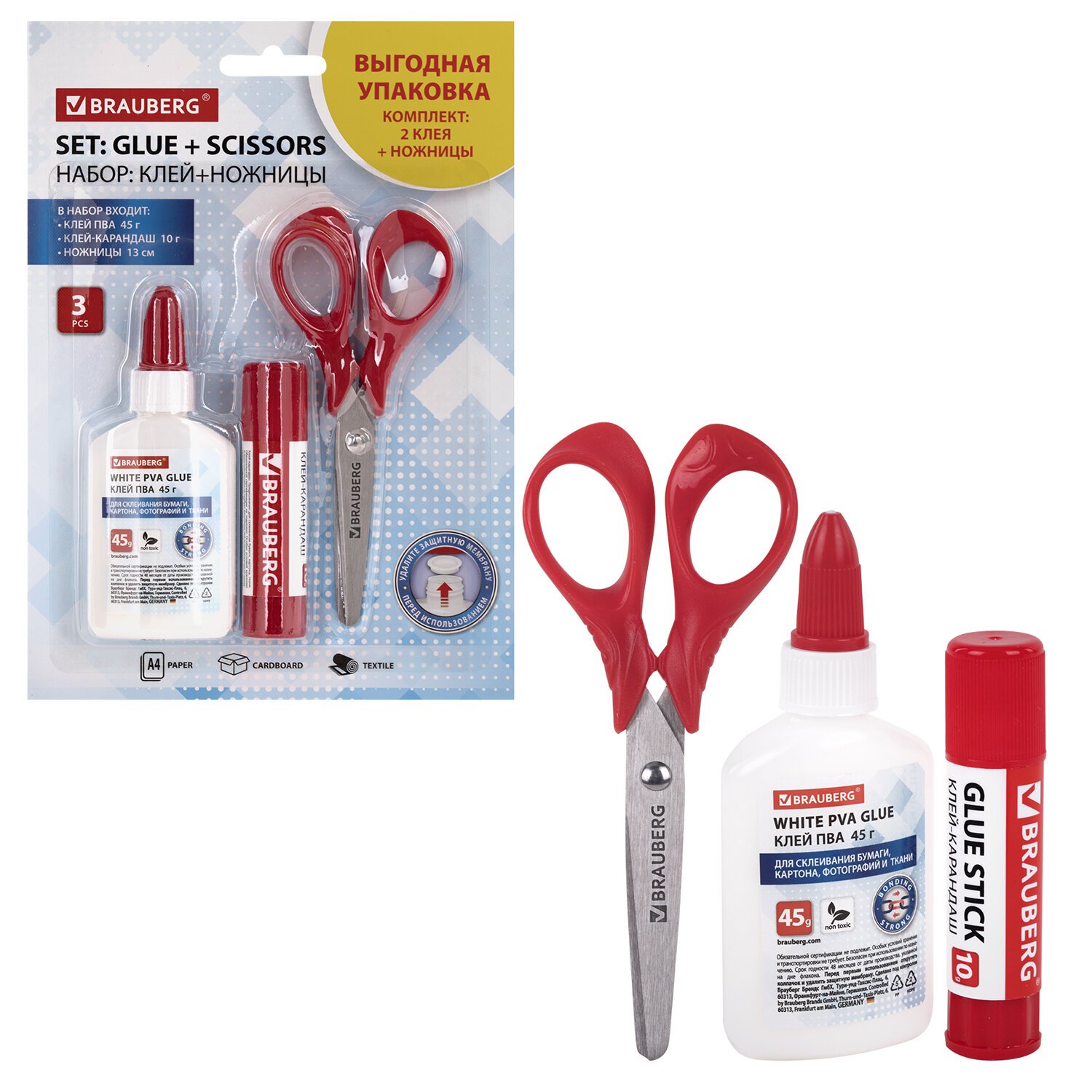 Набор: клей + ножницы BRAUBERG (клей-карандаш PVP 10 г, клей ПВА 45 г, ножницы 13 см), блистер, 271979