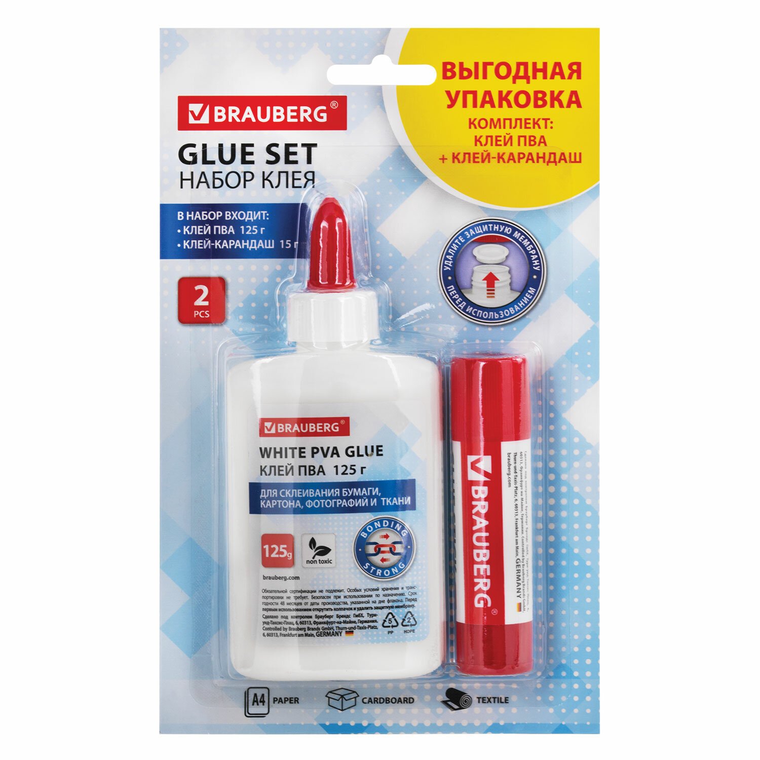 Набор клея BRAUBERG (клей-карандаш PVP 15 г, клей ПВА 125 г), блистер, 271980