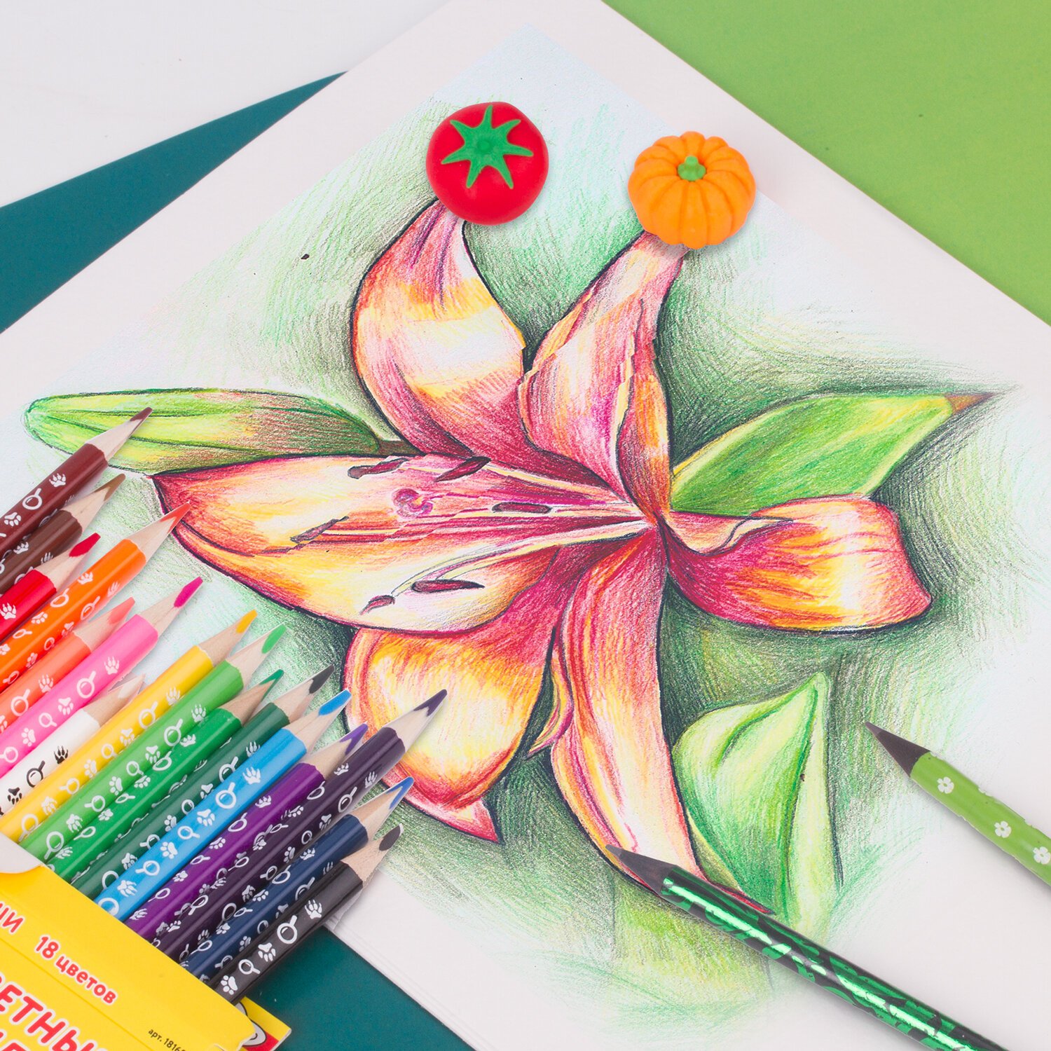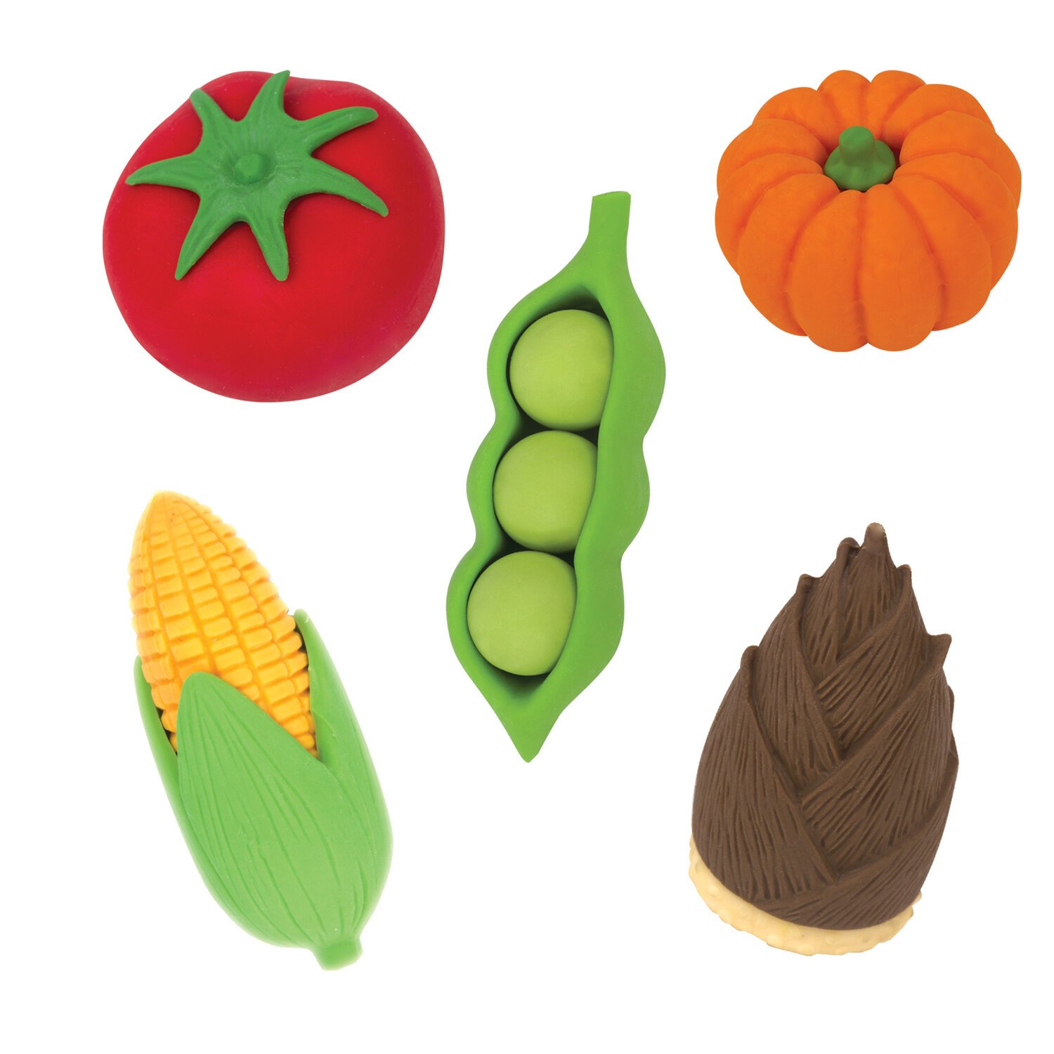 Набор состоит из пяти ластиков в форме разных овощей - томата, горошка, тыквы, кукурузы и побега бамбука. Ластики обеспечат лёгкое и чистое стирание без повреждения поверхности бумаги и без образования бумажной пыли. Поставляются в блистере с европодвесом.