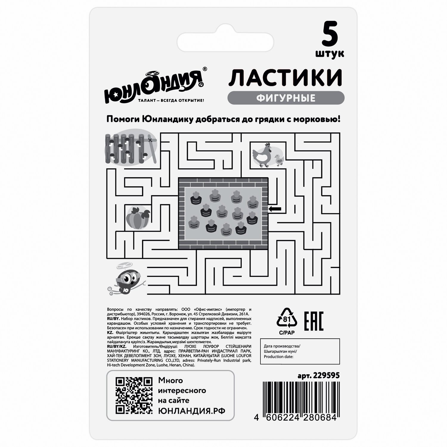 Набор ластиков фигурных ЮНЛАНДИЯ "Зайчик и урожай", 5 шт., ассорти, 229596