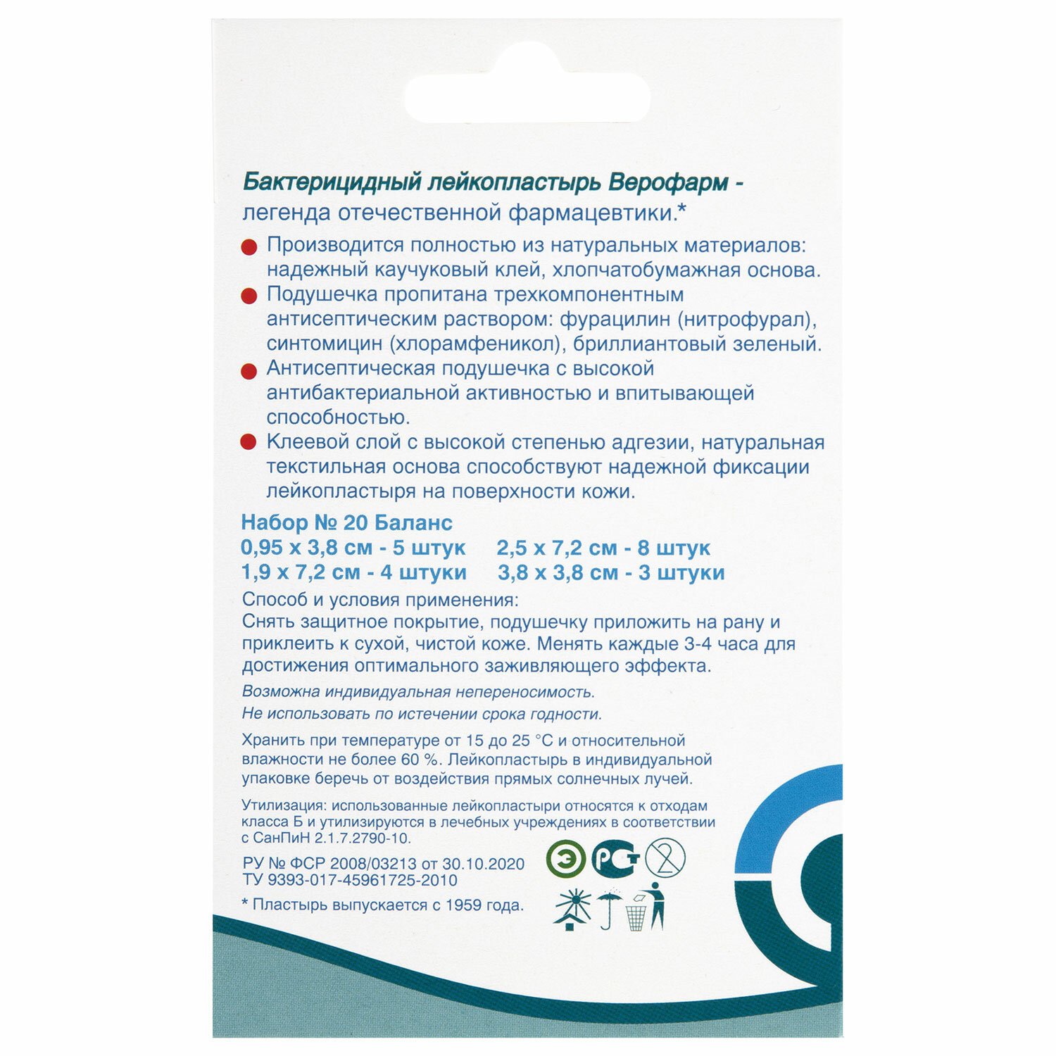 Традиционные бактерицидные лейкопластыри ВЕРОФАРМ в современной упаковке в виде наборов - 4 размера, 20 пластырей.