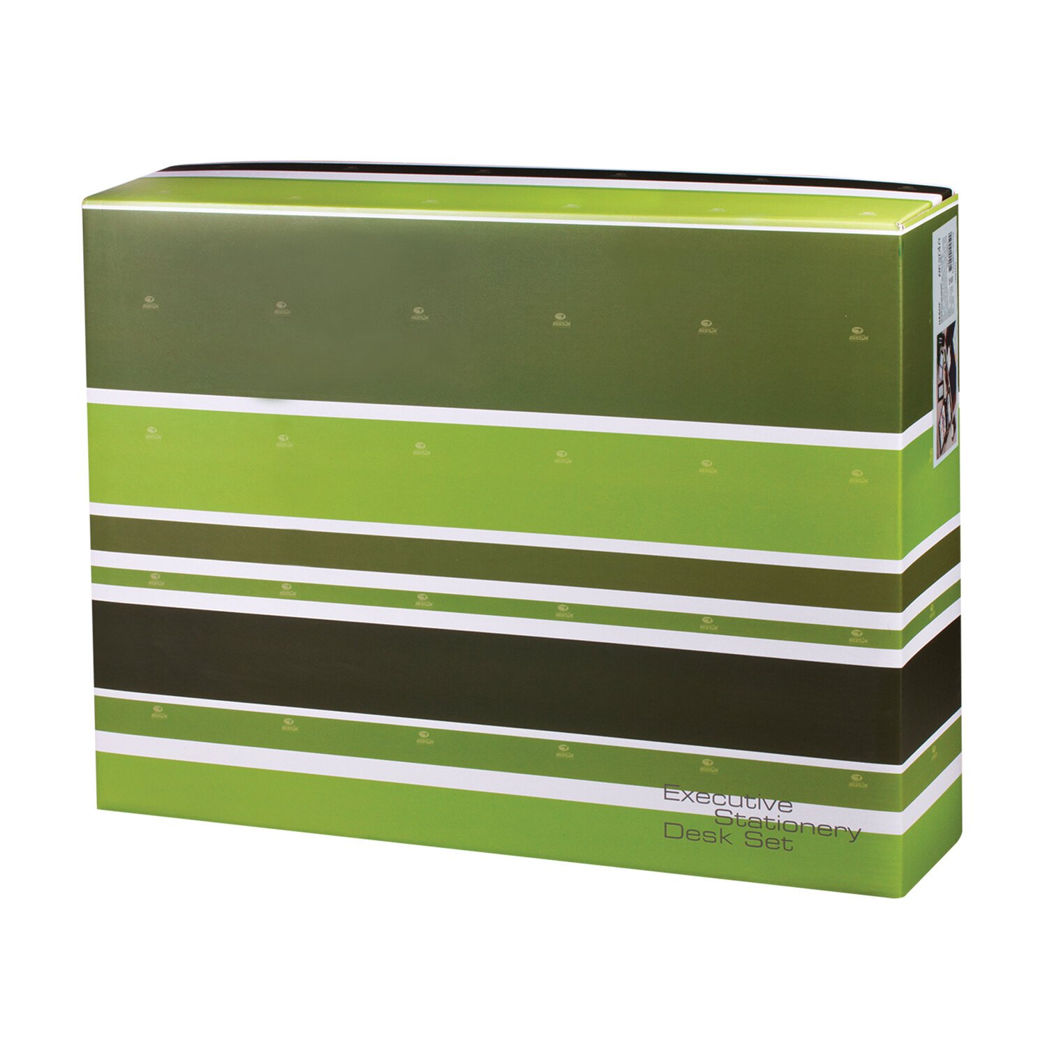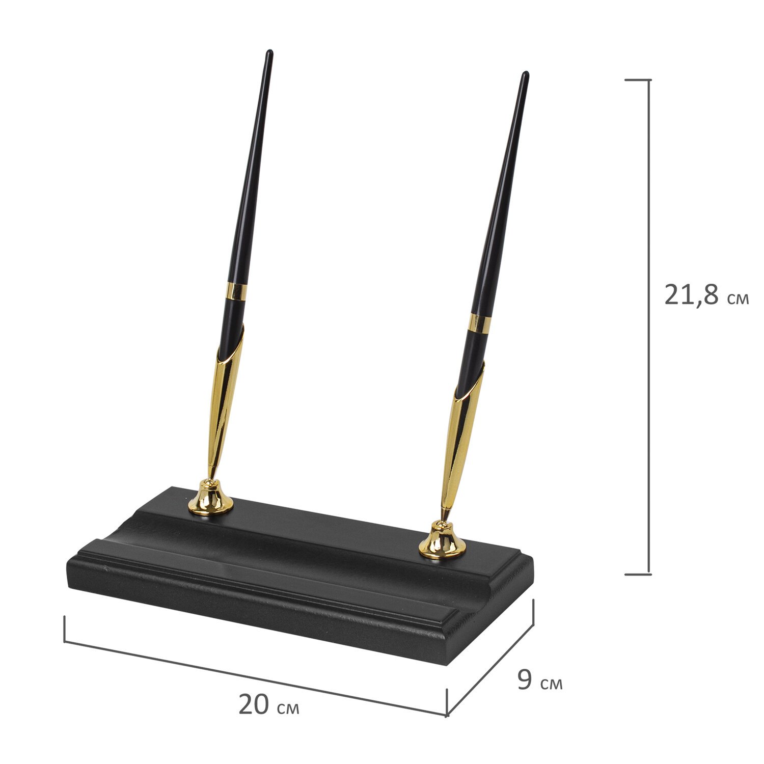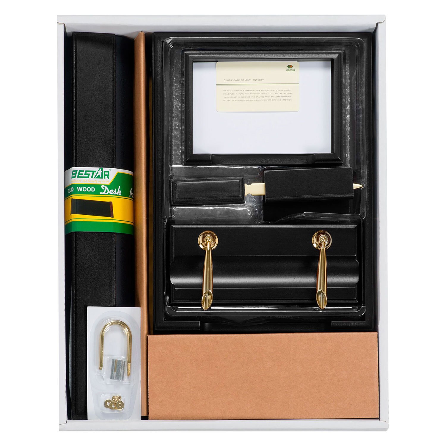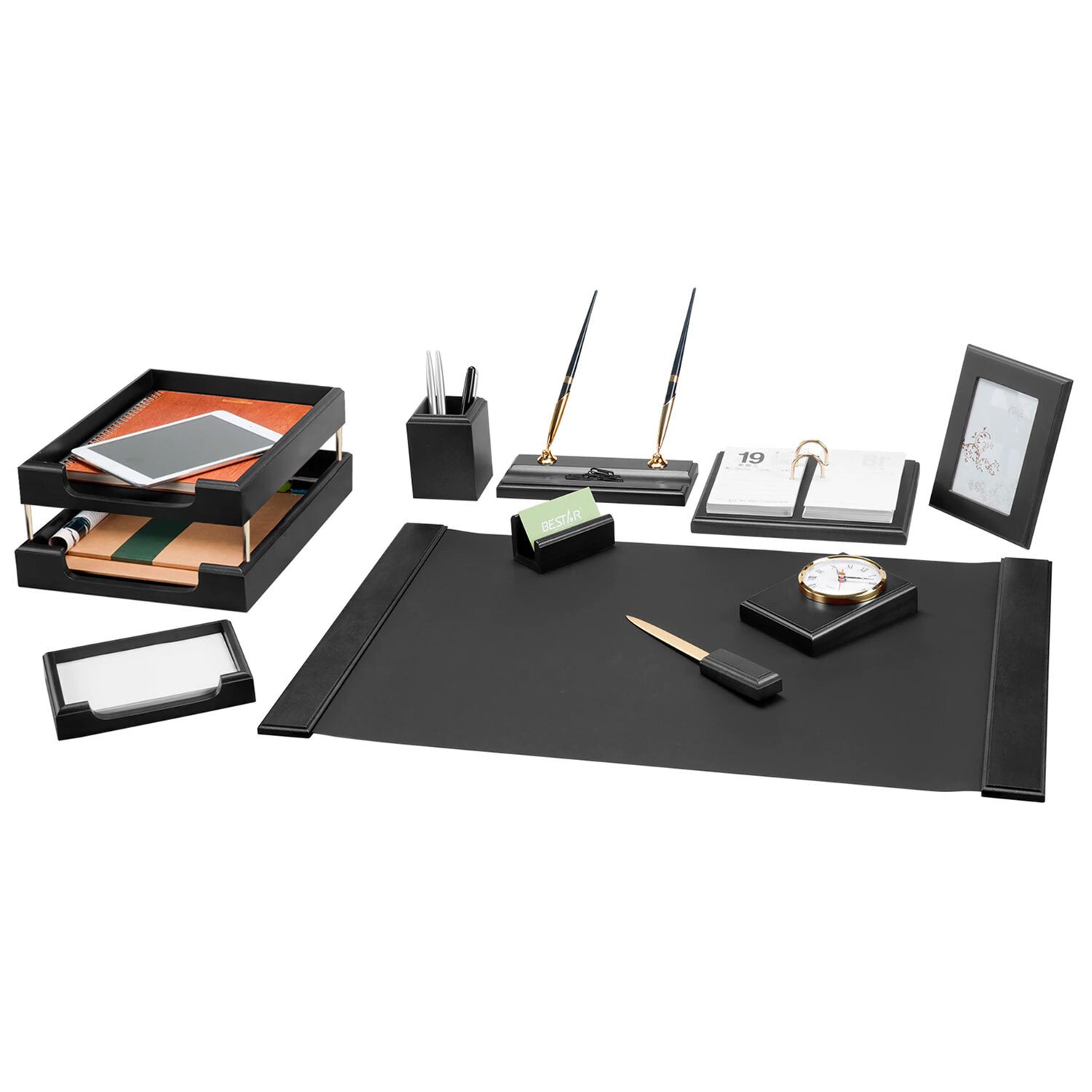 Набор состоит из 10 предметов: двойной лоток для бумаг, коврик для письма (размер – 67х42,5 см), подставка для ручек (2 шариковые ручки в комплекте), стакан-подставка для письменных принадлежностей, подставка для бумажного блока, подставка для визиток, нож для вскрытия конвертов, подставка для перекидного календаря, фоторамка, часы. Все предметы изготовлены из дерева черного цвета с золотистой фурнитурой. Набор упакован в подарочную коробку, а также дополнительно в защитный гофрокорб для транспортировки.