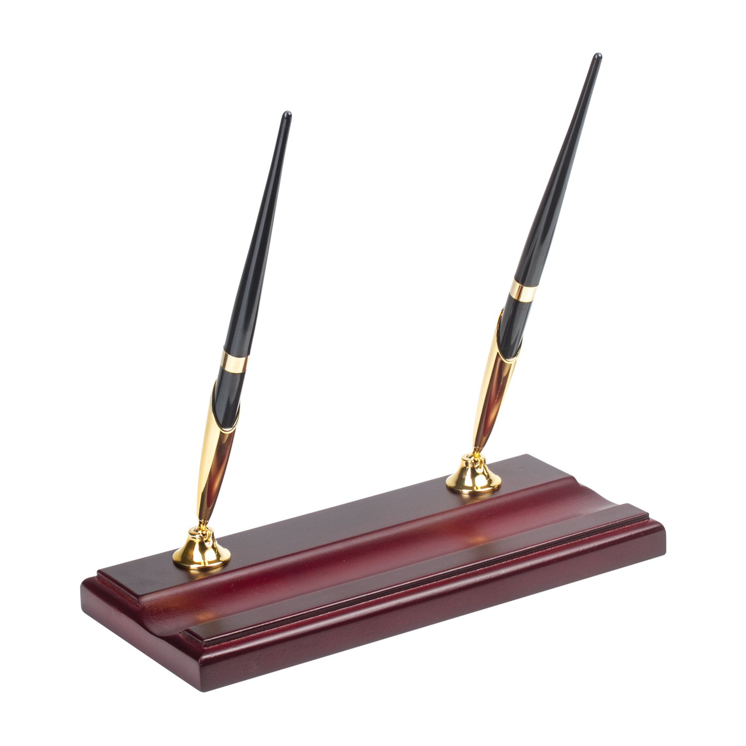 Набор состоит из 5 предметов: лоток для бумаг, подставка для ручек (2 шариковые ручки в комплекте), подставка для бумажного блока, подставка для визиток, нож для вскрытия конвертов. Все предметы изготовлены из дерева красного цвета с золотистой фурнитурой. Набор упакован в подарочную коробку, а также дополнительно в защитный гофрокорб для транспортировки.
