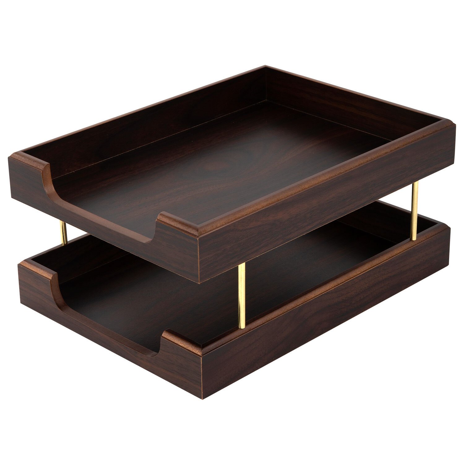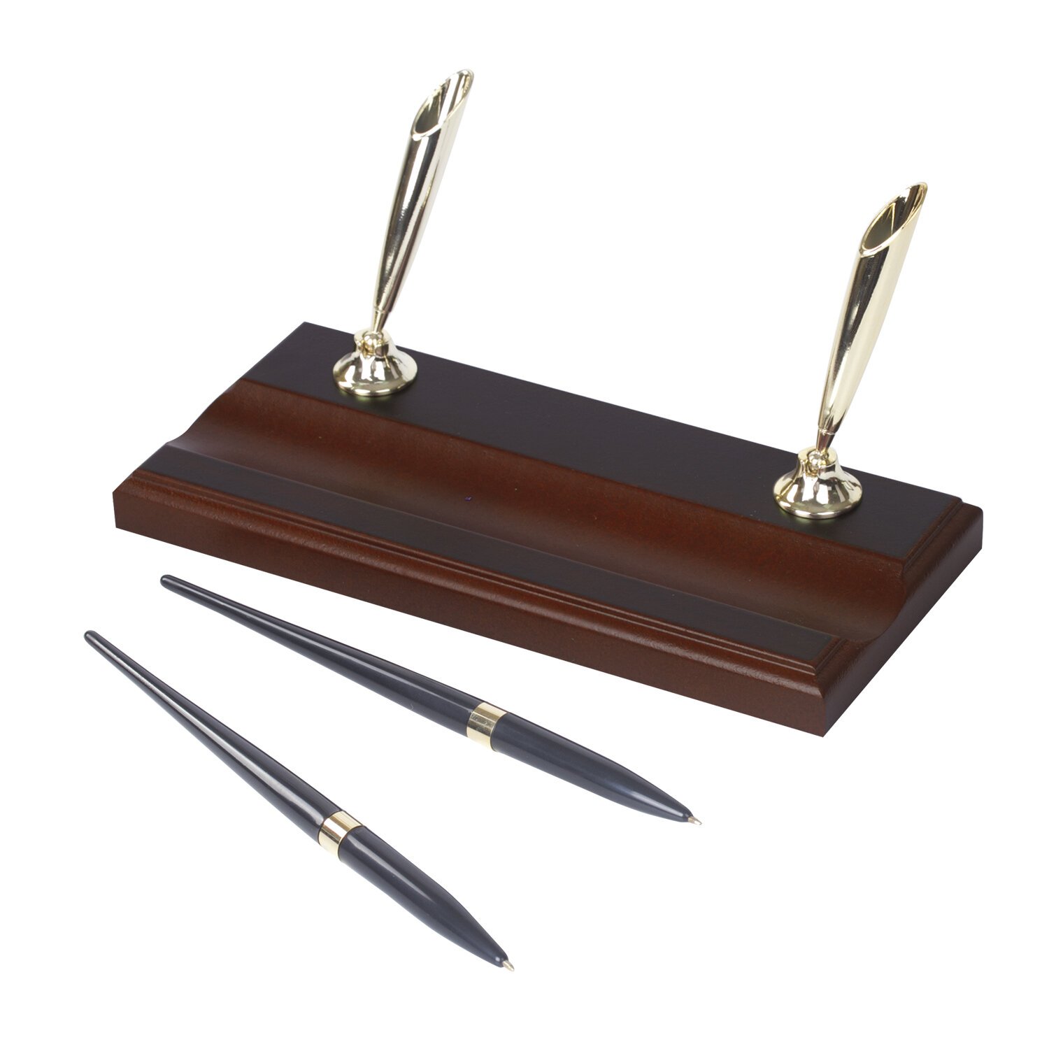 Набор состоит из 8 предметов: двойной лоток для бумаг, коврик для письма (размер – 67х42,5 см), подставка для ручек (2 шариковые ручки в комплекте), стакан-подставка для письменных принадлежностей, подставка для бумажного блока, подставка для визиток, нож для вскрытия конвертов, подставка для перекидного календаря. Все предметы изготовлены из дерева цвета "орех" с золотистой фурнитурой. Набор упакован в подарочную коробку, а также дополнительно в защитный гофрокорб для транспортировки.