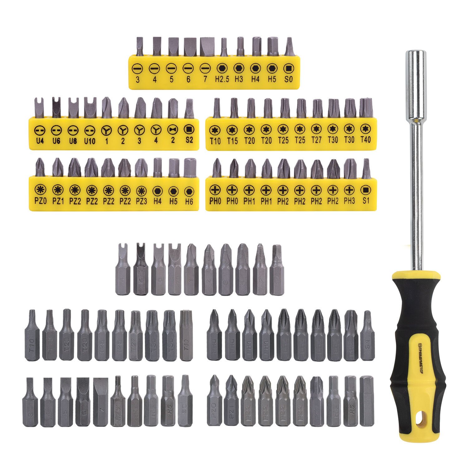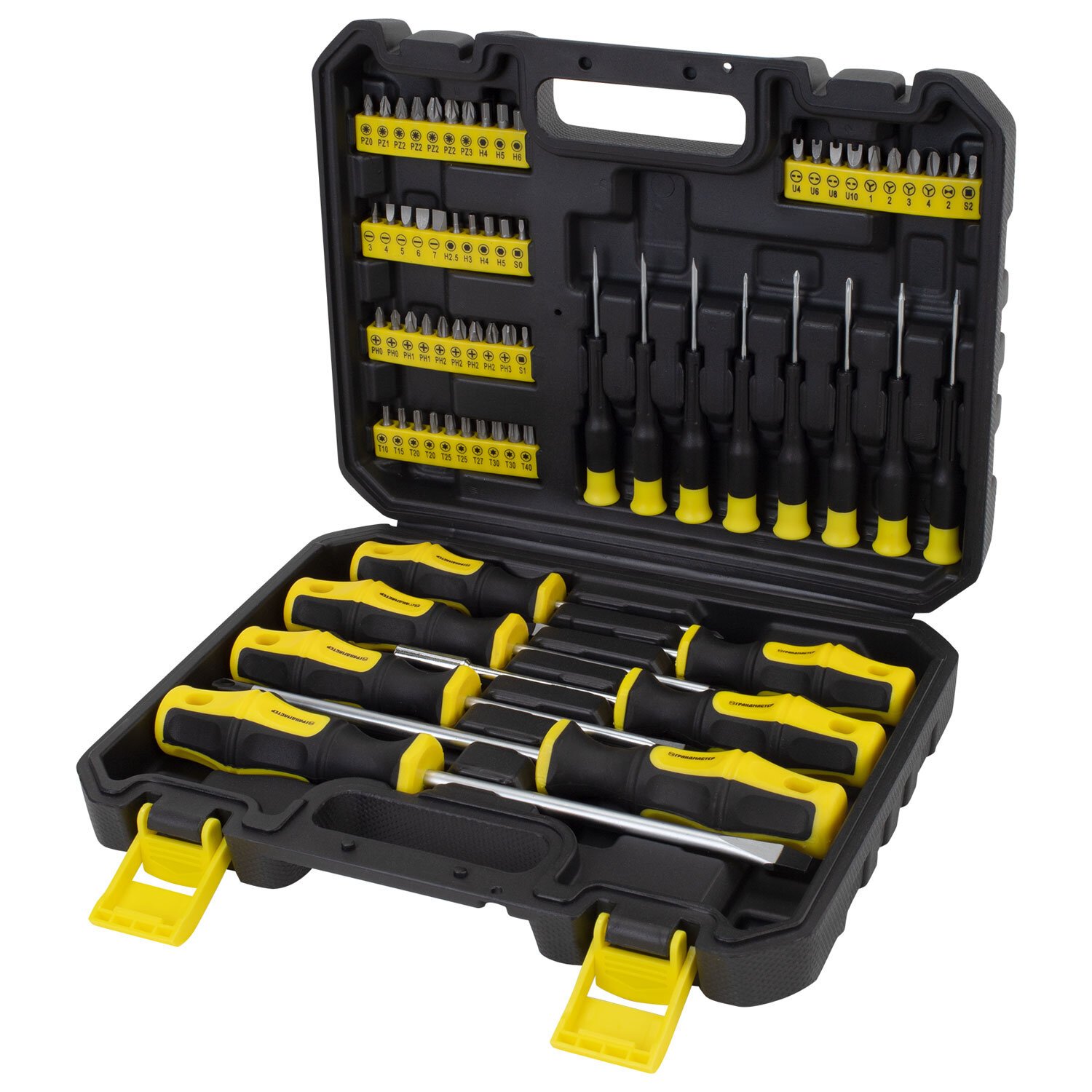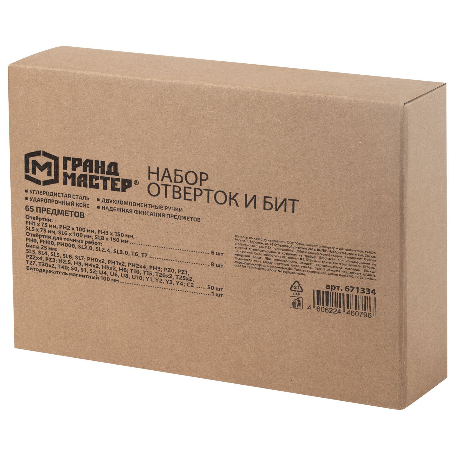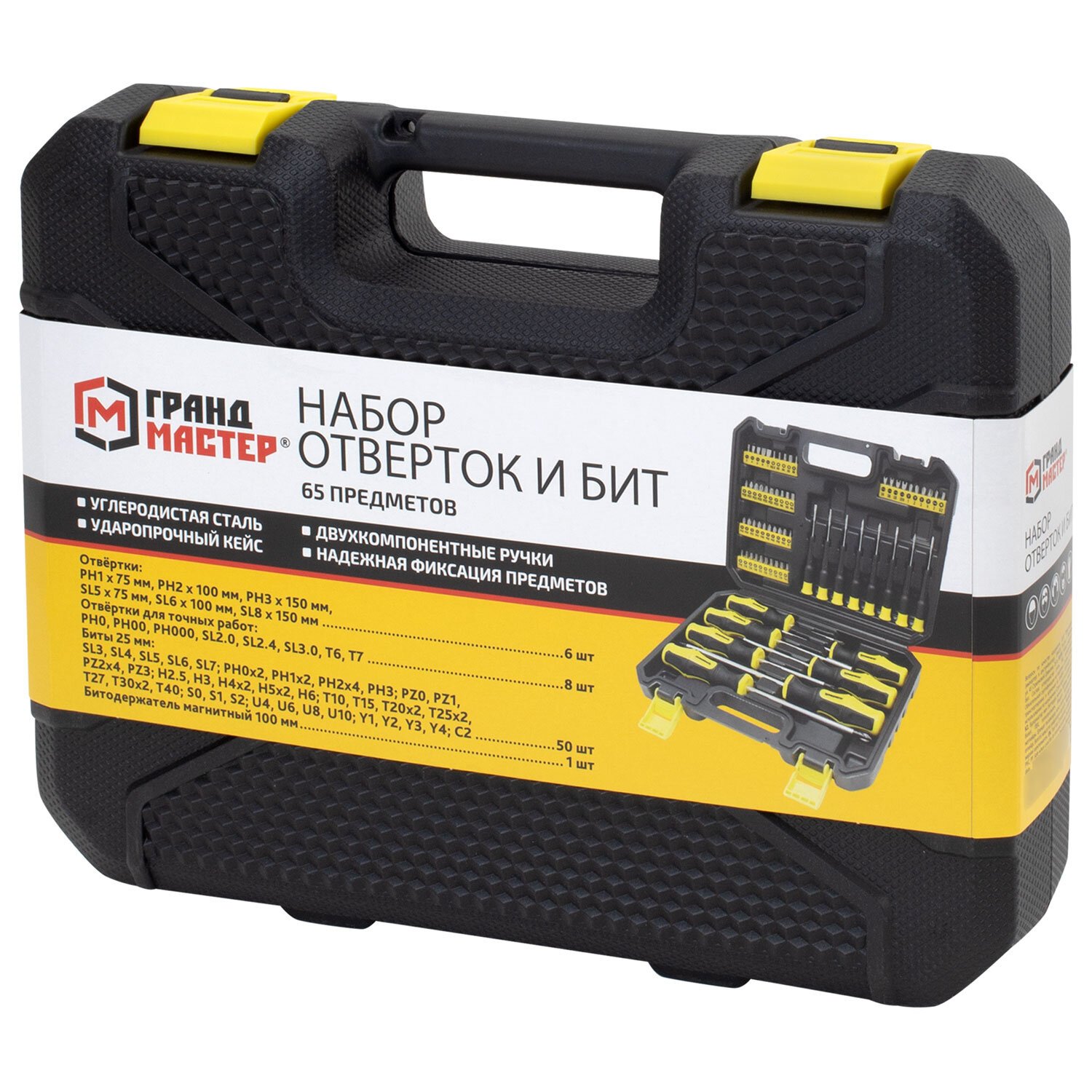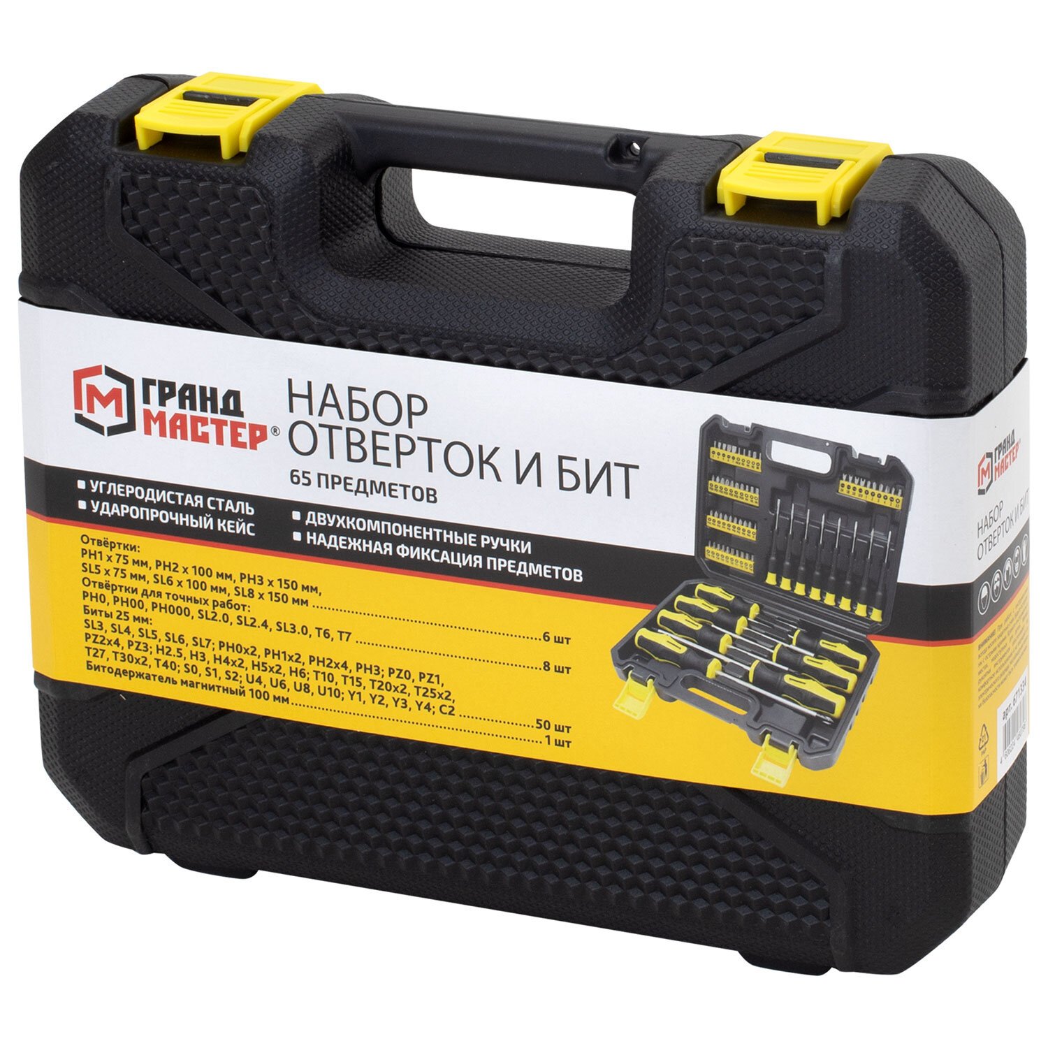Набор отверток и бит, 65 предметов, двухкомпонентные рукоятки, пластиковый кейс, ГРАНДМАСТЕР, 671334