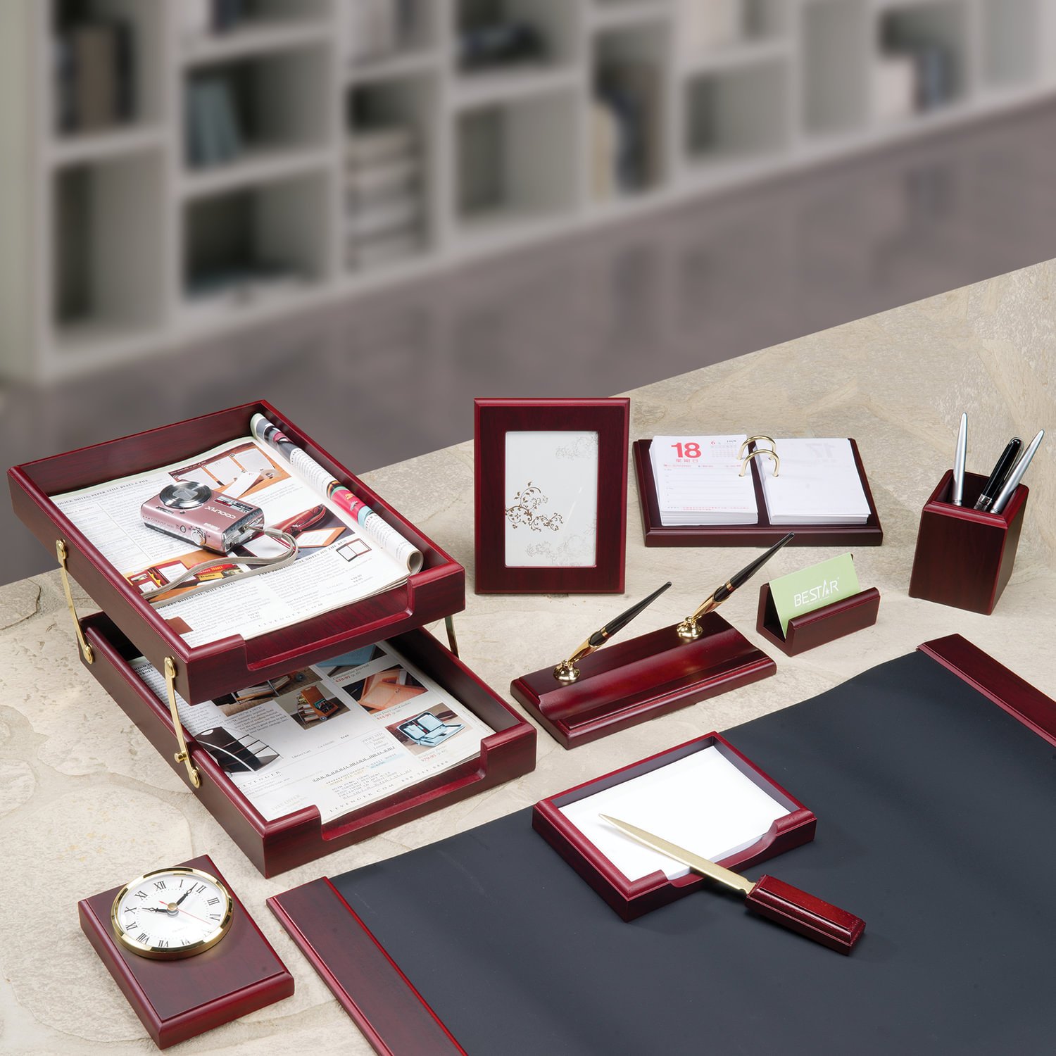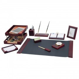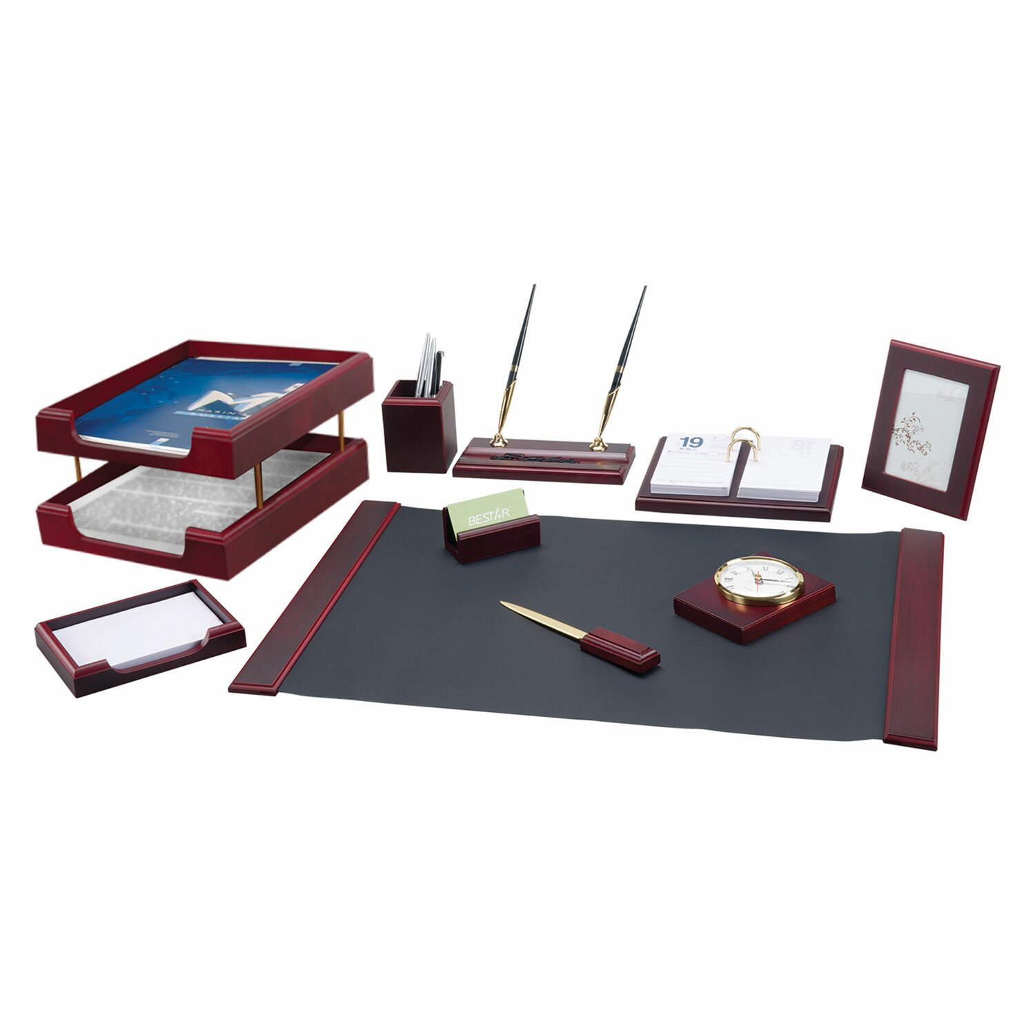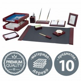 Набор состоит из 10 предметов: двойной лоток для бумаг, коврик для письма (размер - 60х42 см), подставка для ручек (2 шариковые ручки в комплекте), стакан-подставка для письменных принадлежностей, подставка для бумажного блока, подставка для визиток, нож для вскрытия конвертов, подставка для перекидного календаря, фоторамка, часы. Все предметы изготовлены из дерева красного цвета с золотистой фурнитурой. Набор упакован в подарочную коробку.