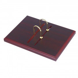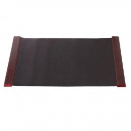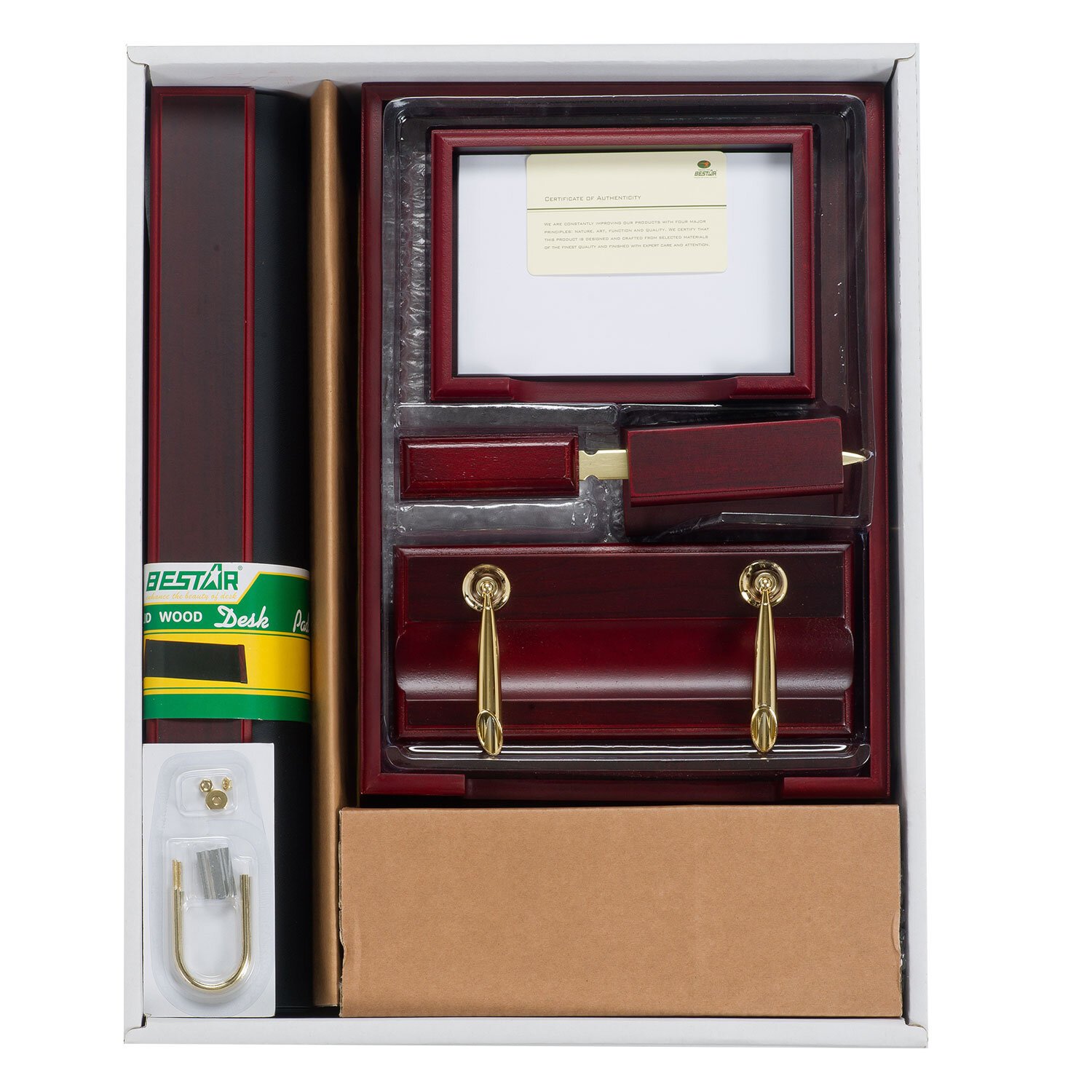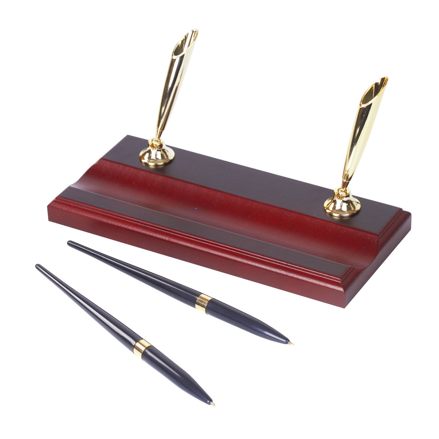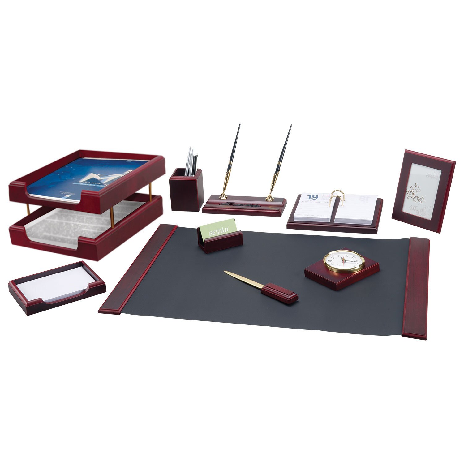Набор состоит из 10 предметов: двойной лоток для бумаг, коврик для письма (размер - 60х42 см), подставка для ручек (2 шариковые ручки в комплекте), стакан-подставка для письменных принадлежностей, подставка для бумажного блока, подставка для визиток, нож для вскрытия конвертов, подставка для перекидного календаря, фоторамка, часы. Все предметы изготовлены из дерева красного цвета с золотистой фурнитурой. Набор упакован в подарочную коробку.